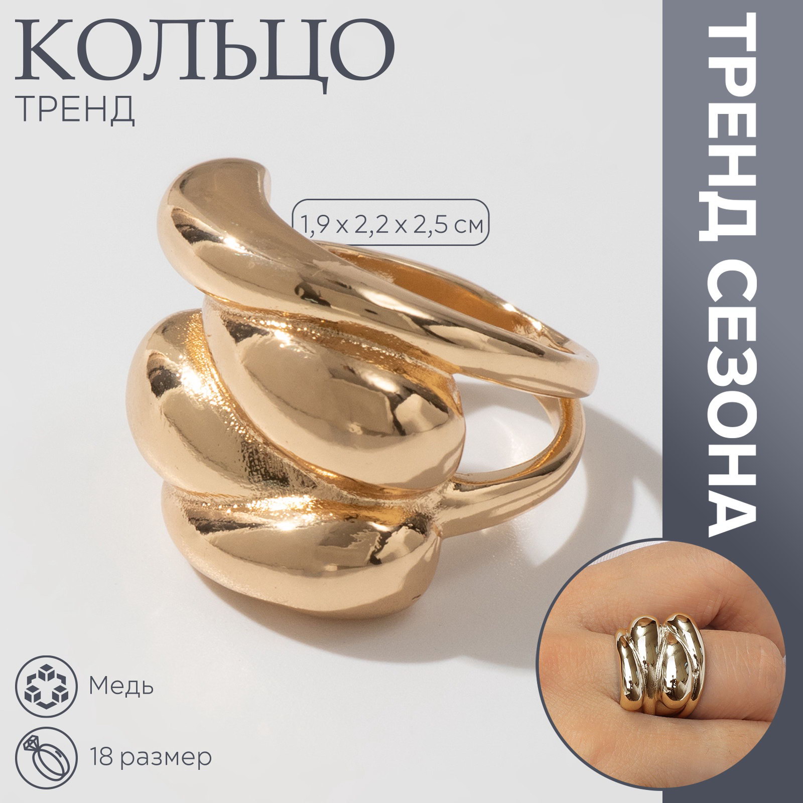 Кольцо металл "Тренд" капли, цвет золото, размер 18, 2.2x1.9x2.5 см., QF, Китай
