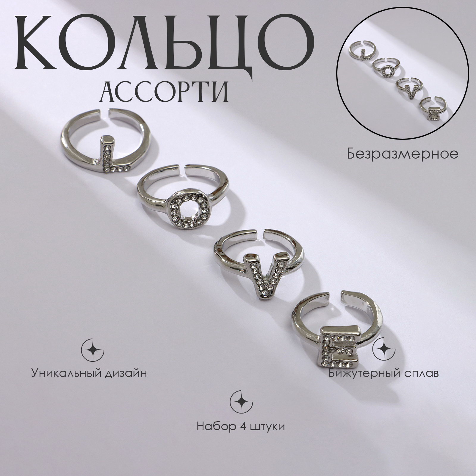Набор колец Love, 4 шт. цвет серебро, безразмерное, 2x2x1 см., QF, Китай