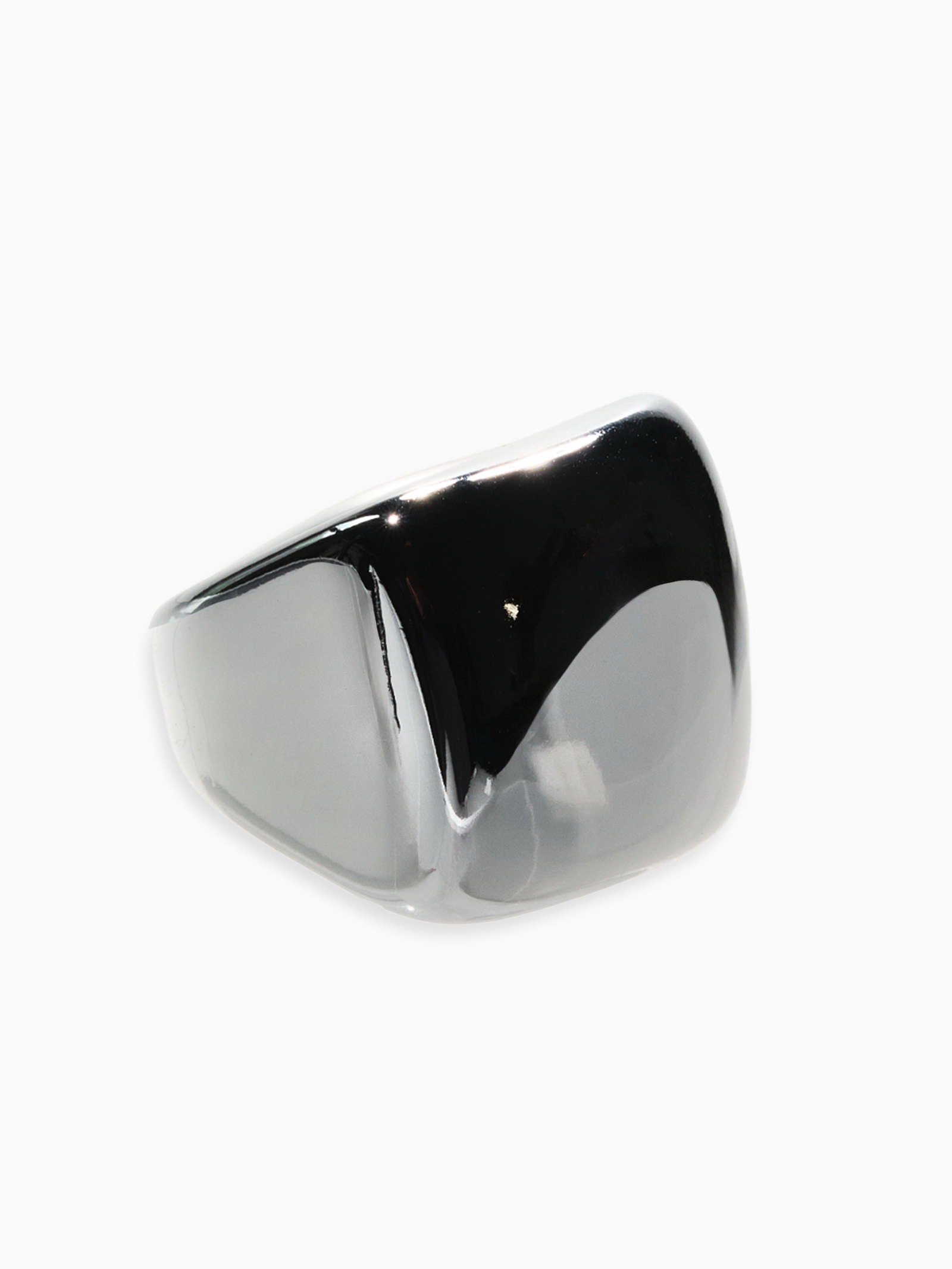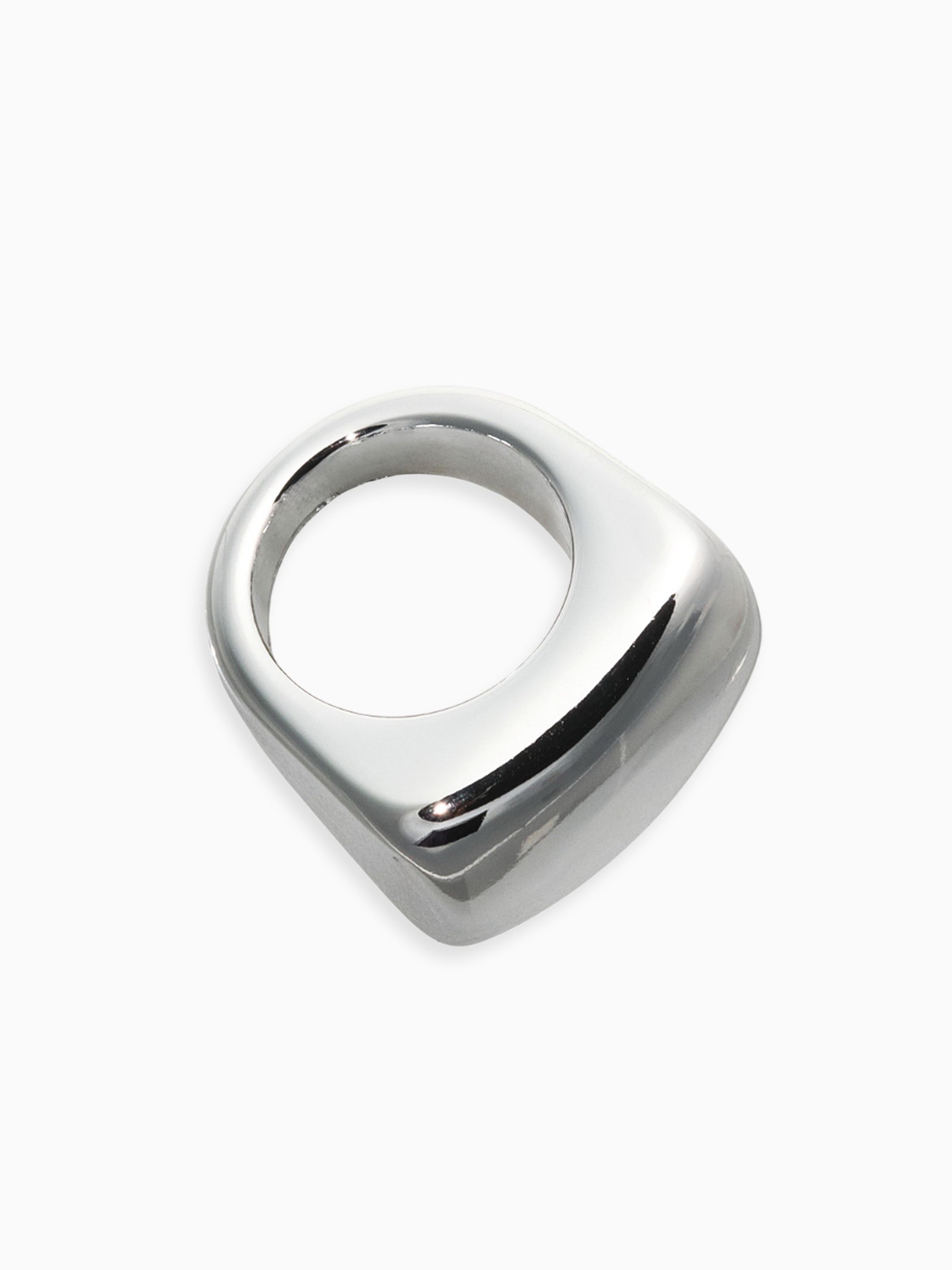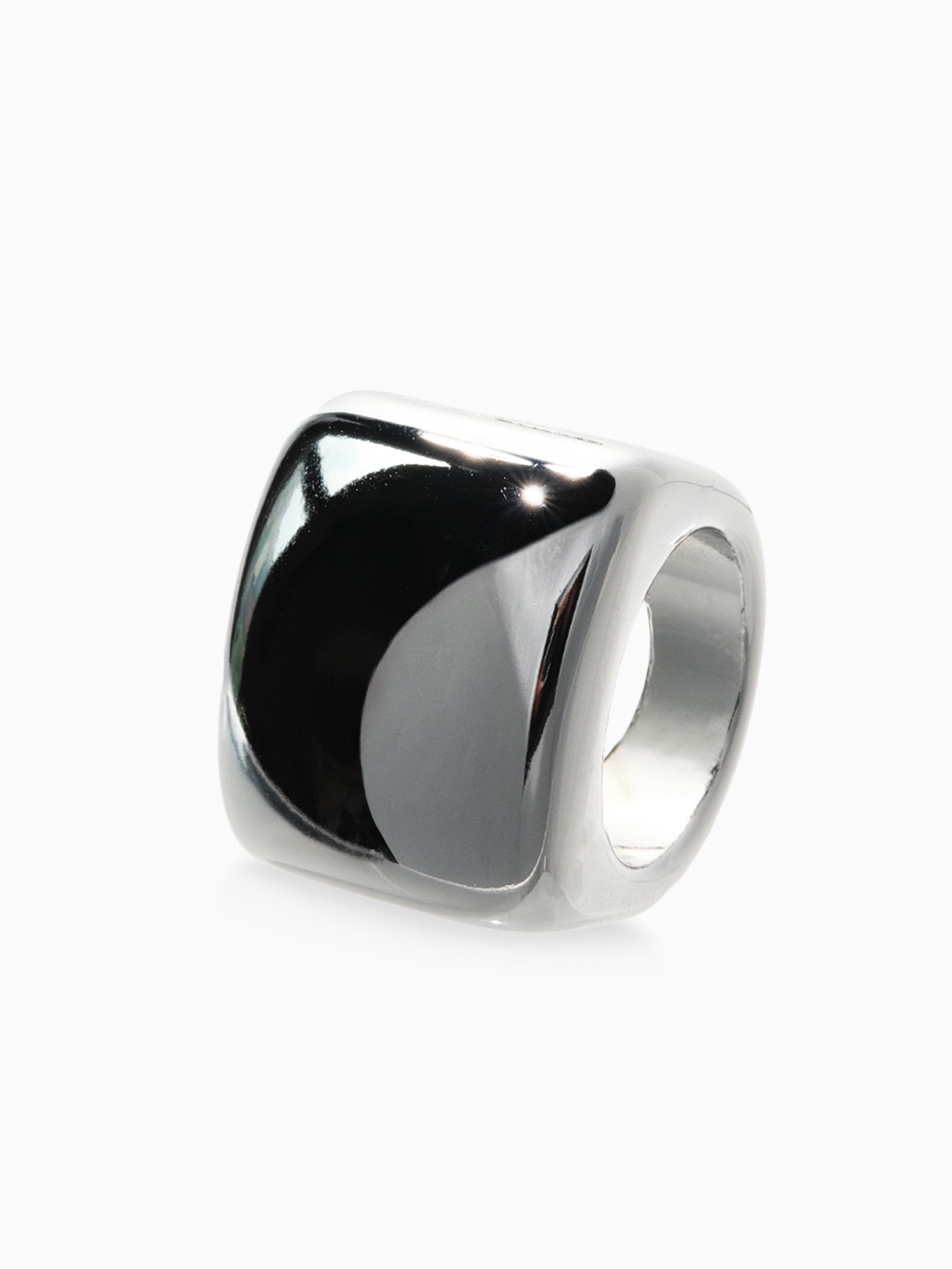 Создайте неповторимый образ, выбрав большое кольцо с геометрически четким объемом и утонченным серебристым блеском. | ||