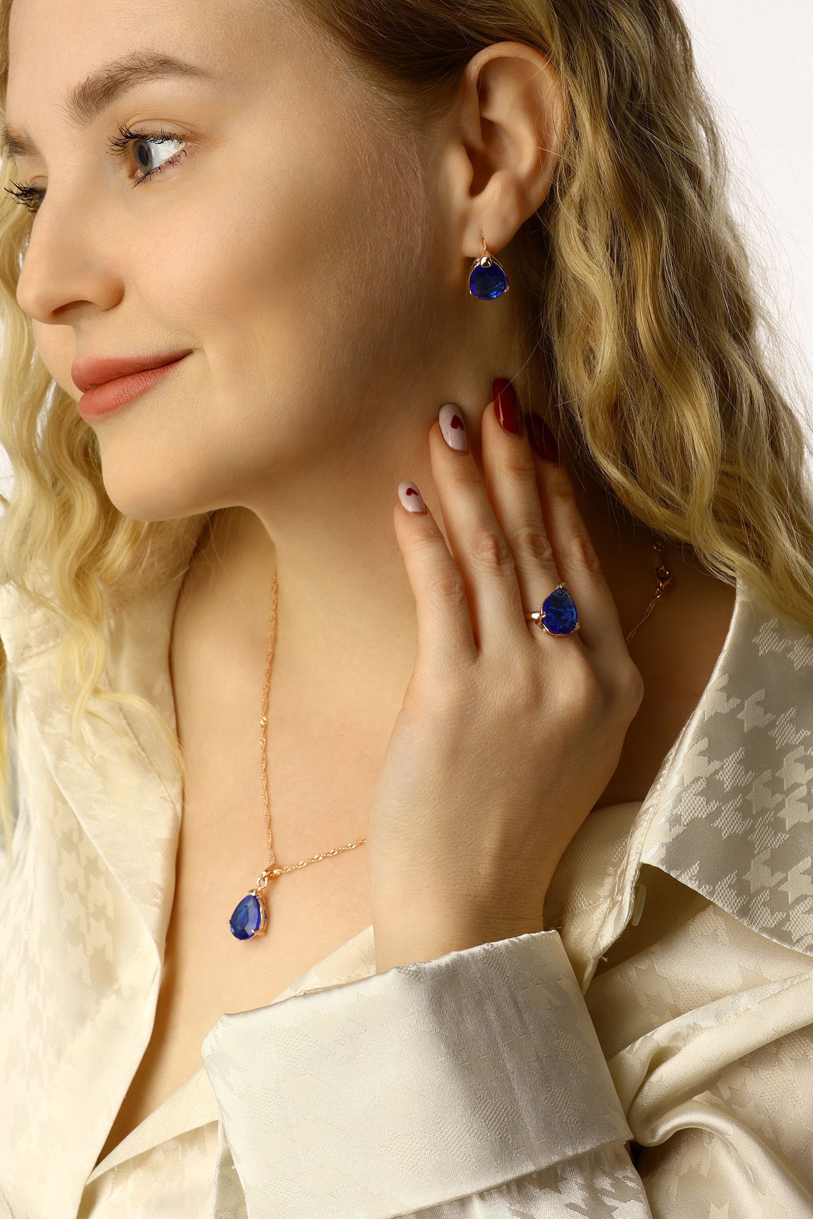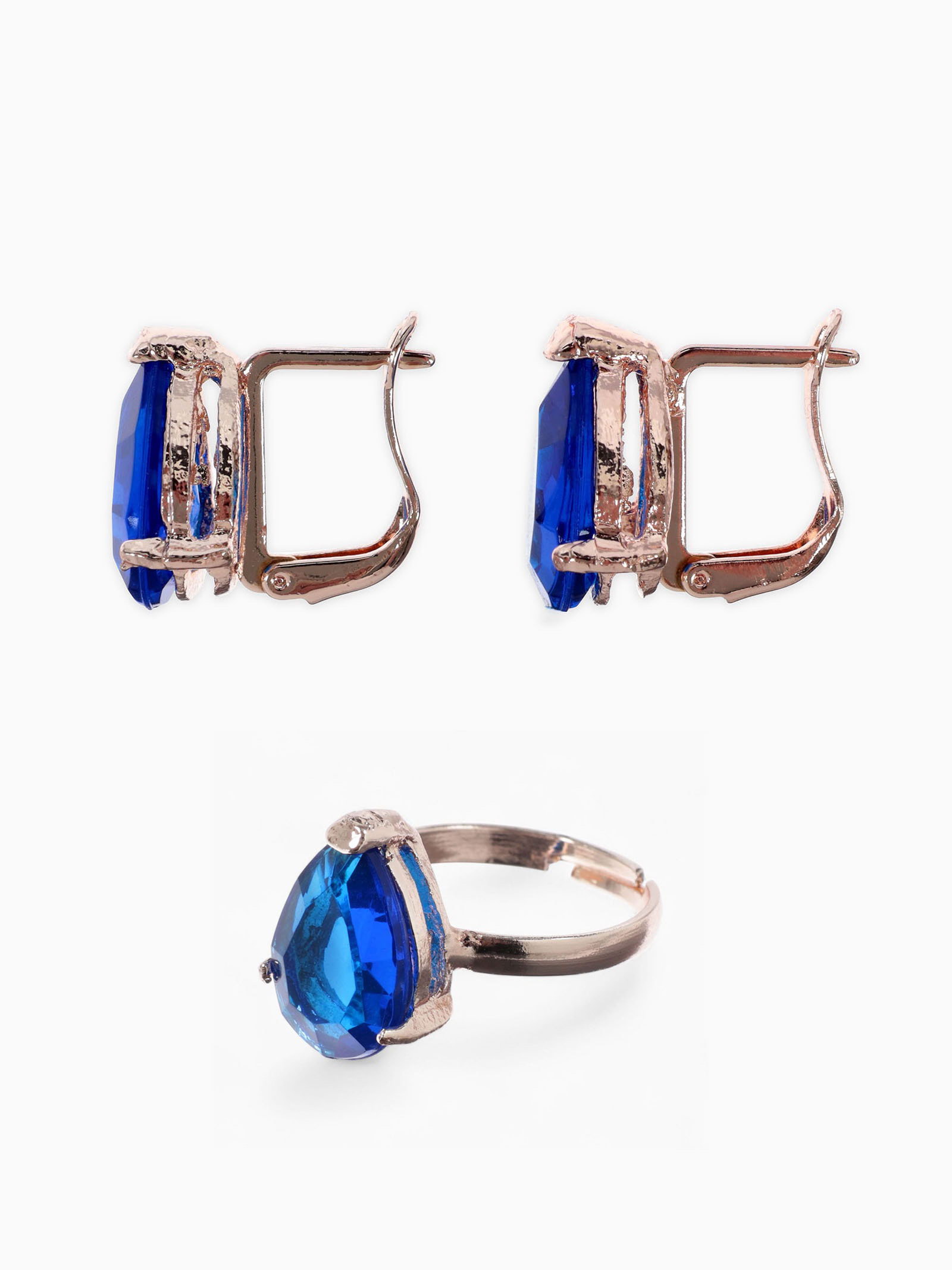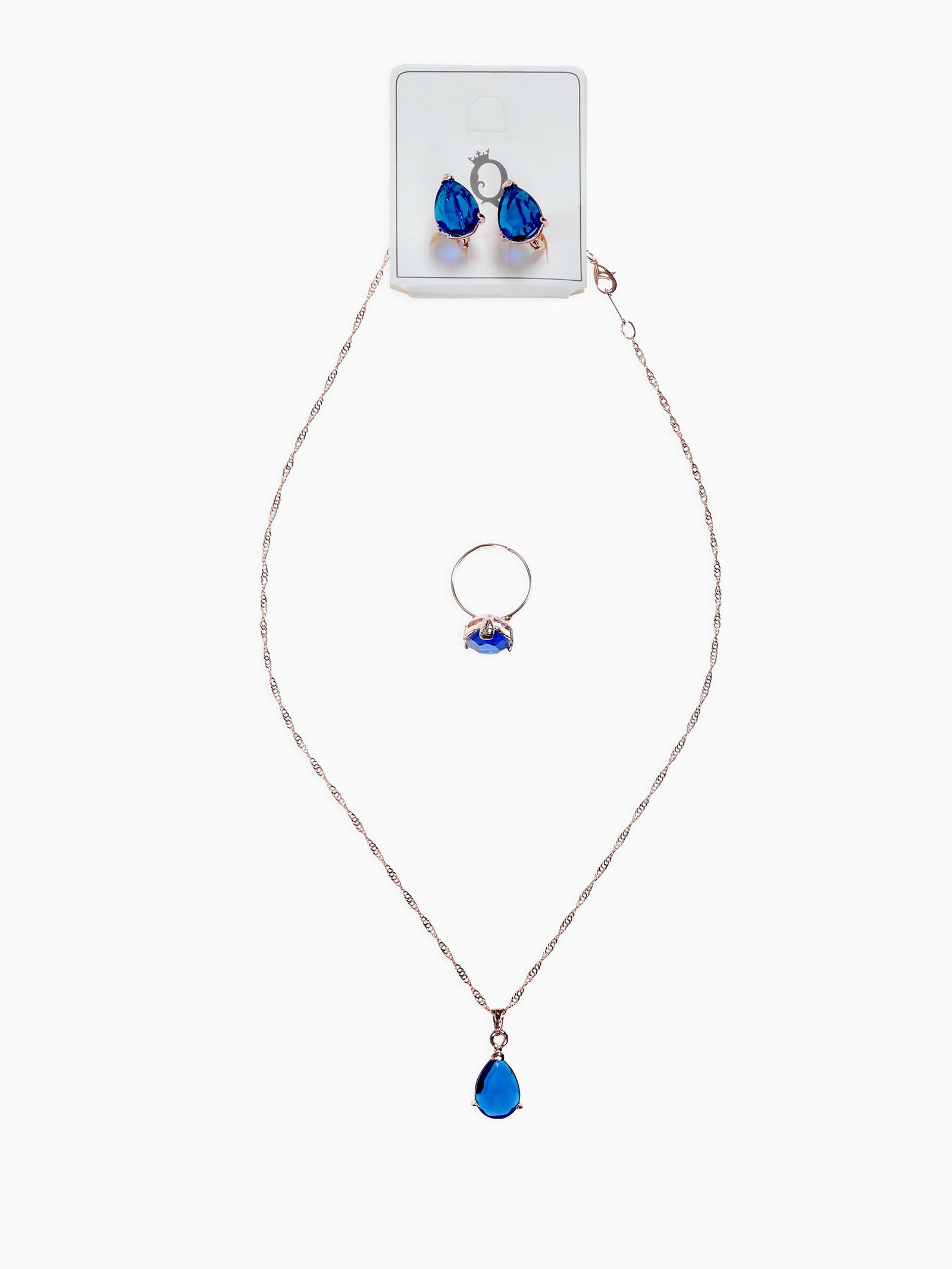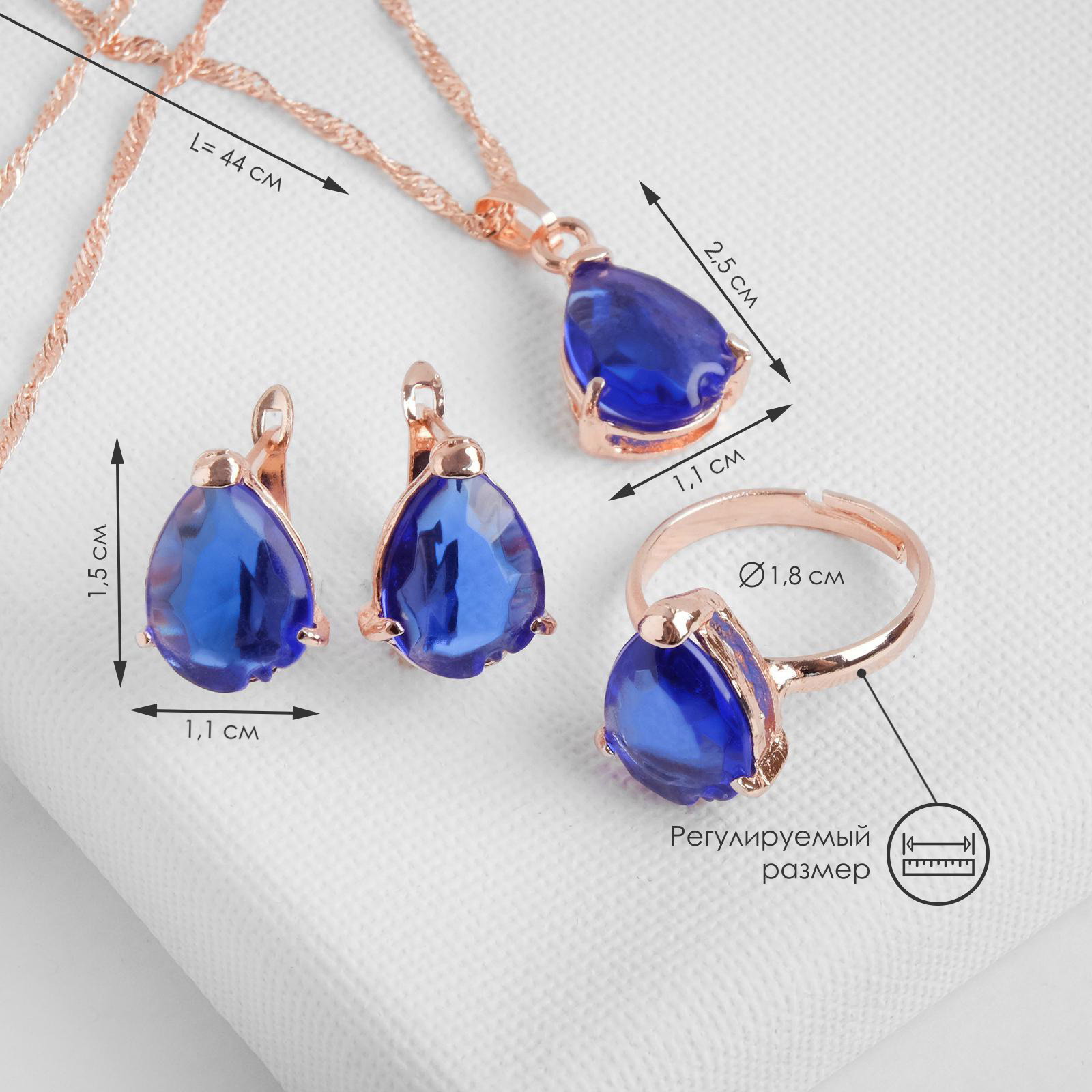 Гарнитур 3 предмета: серьги, кулон, кольцо безразмерное "Эдель" капля, цвет синий в золоте, 45 см, 2x45x2 см., QF, Китай