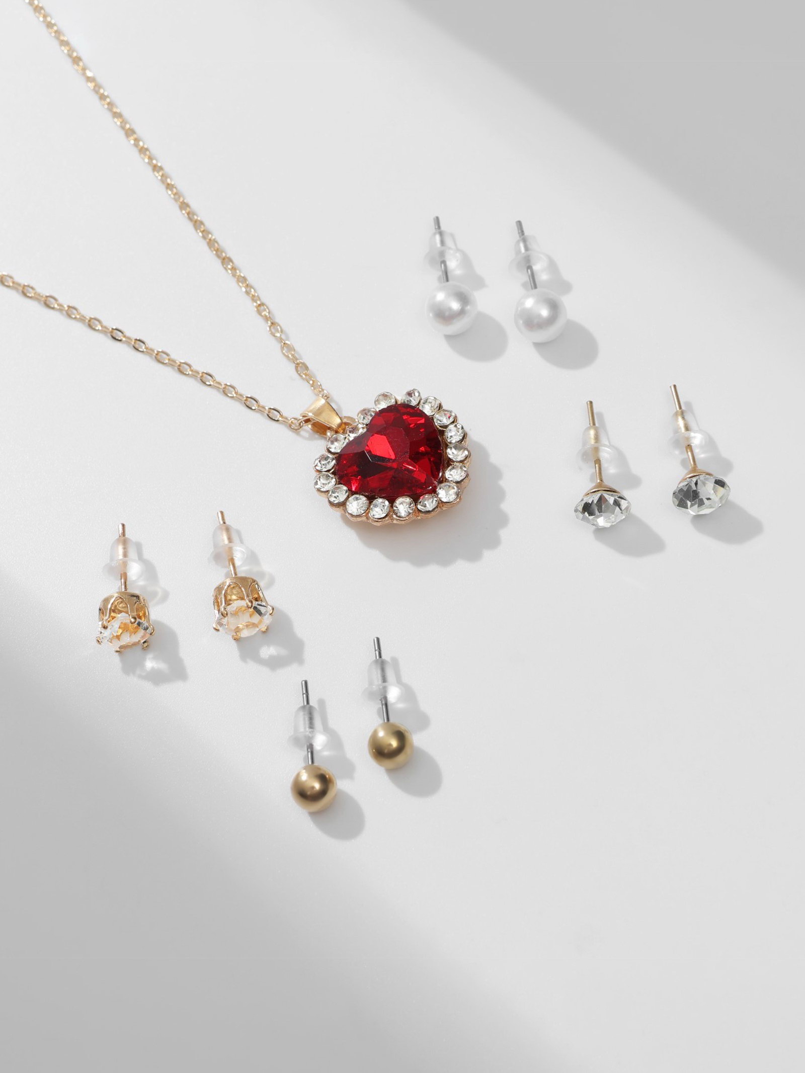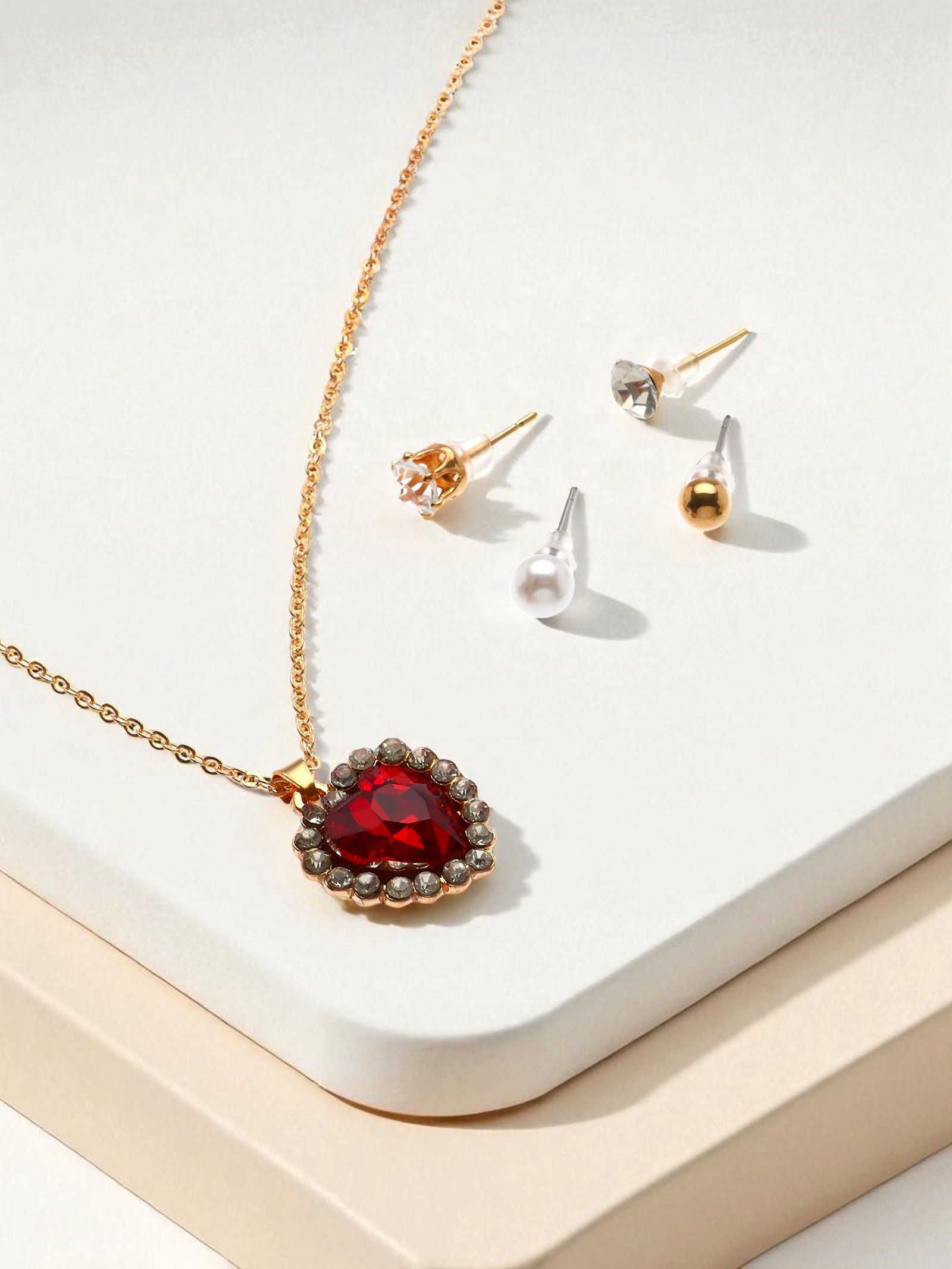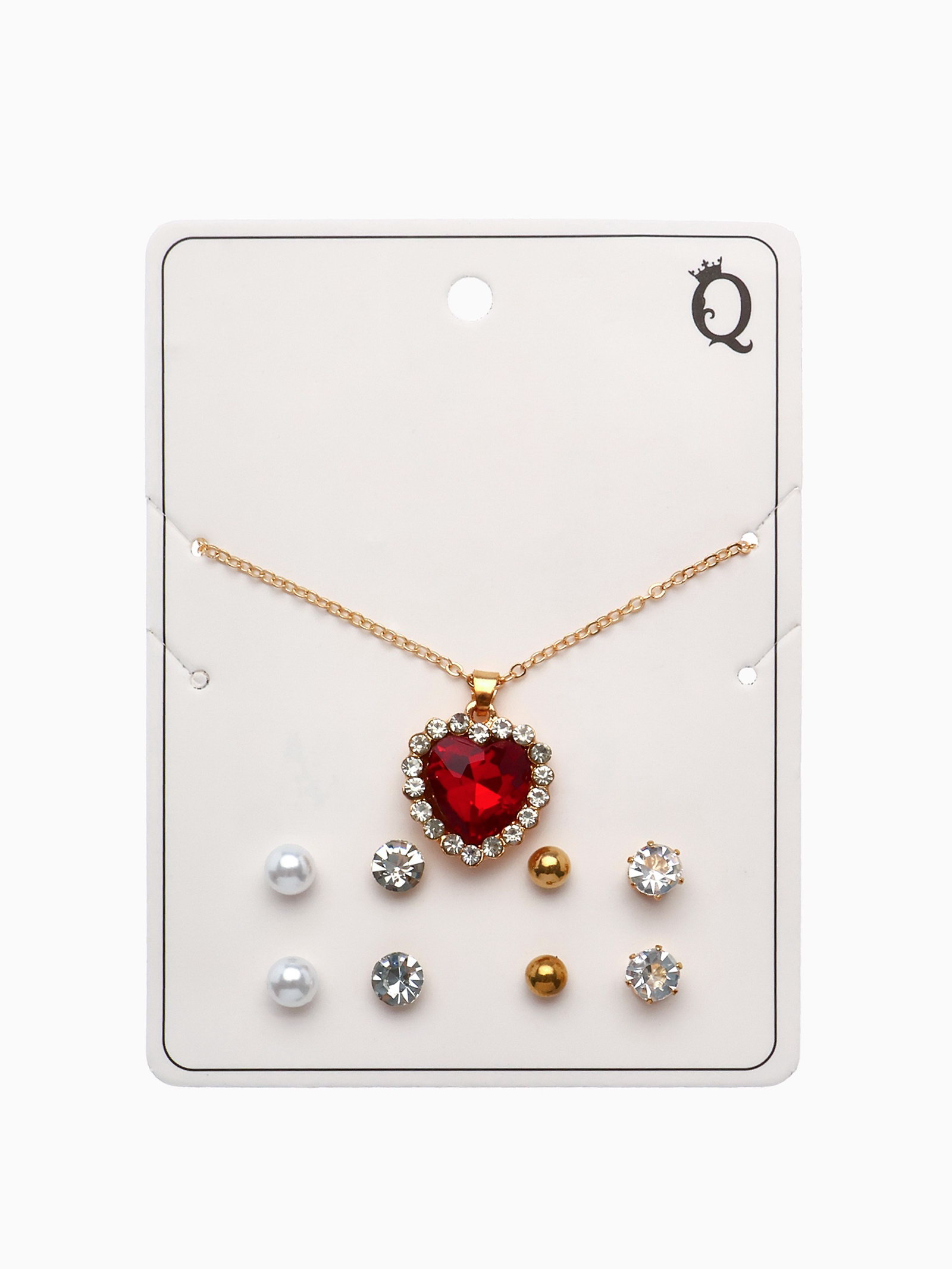 Гарнитур 5 предметов: 4 пары пусет, кулон "Сердечко", цвет бело-красный в золоте, 40 см, 2x40x0.8 см., QF, Китай