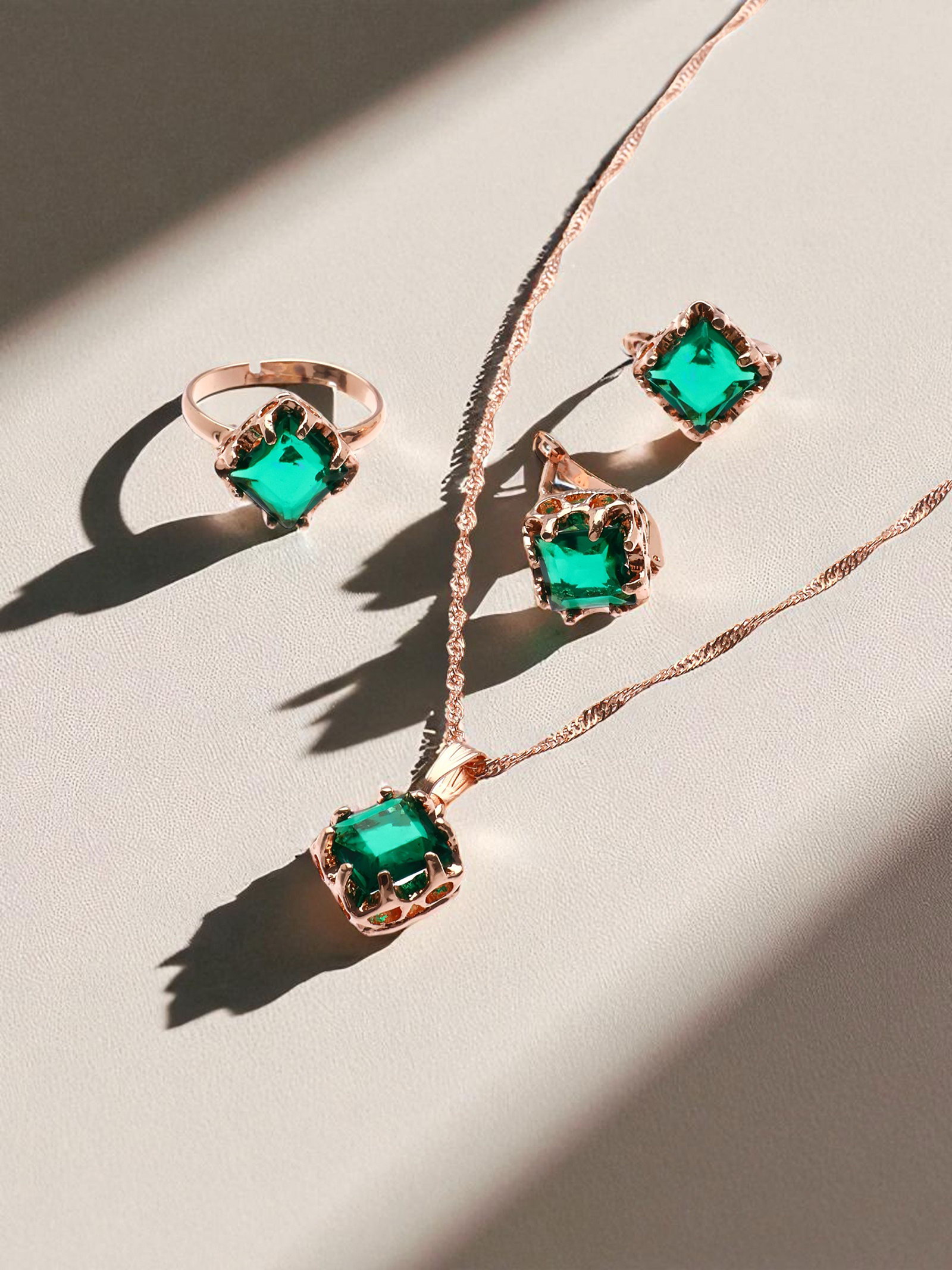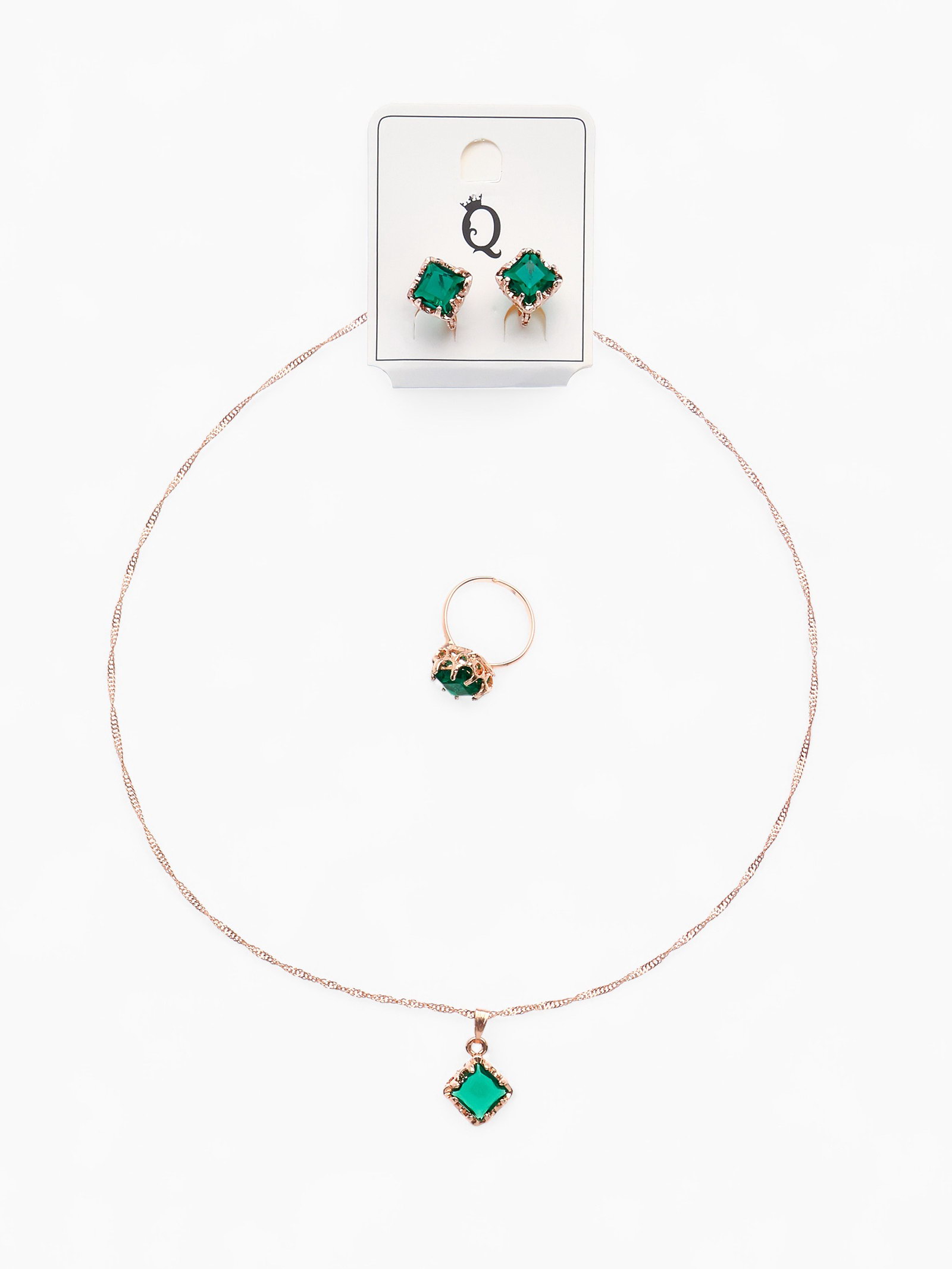 Гарнитур 3 предмета: серьги, кулон, кольцо безразмерное "Эдель" ромб, цвет зелёный в золоте, 45 см, 1x45x1 см., QF, Китай