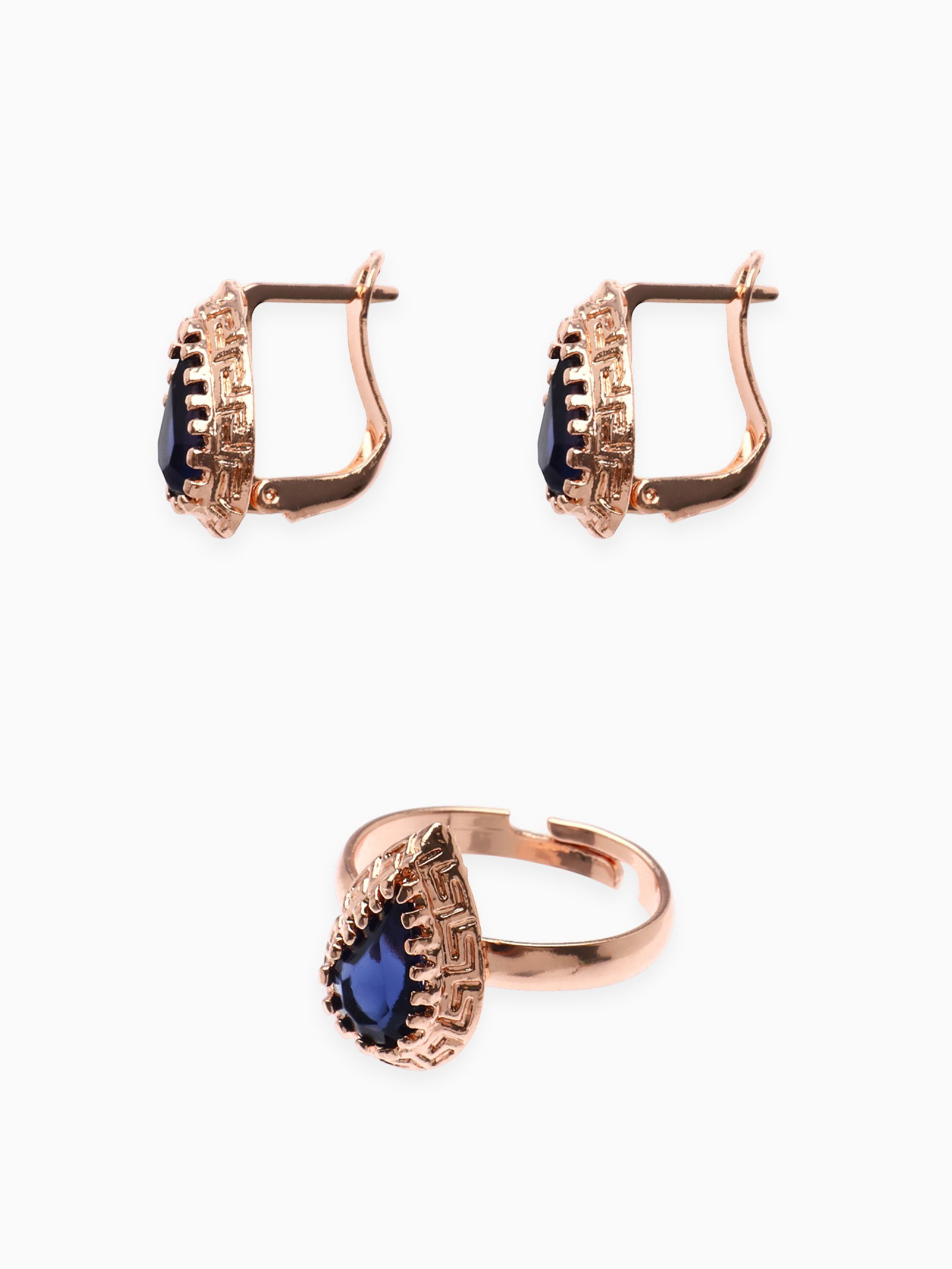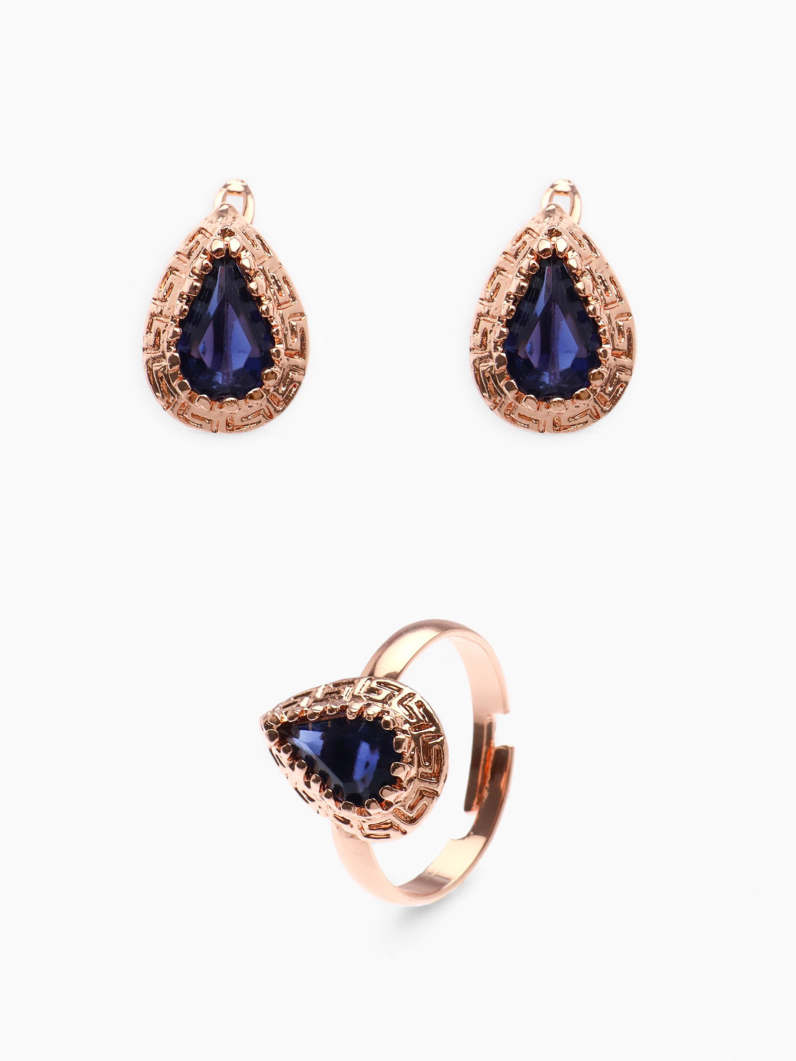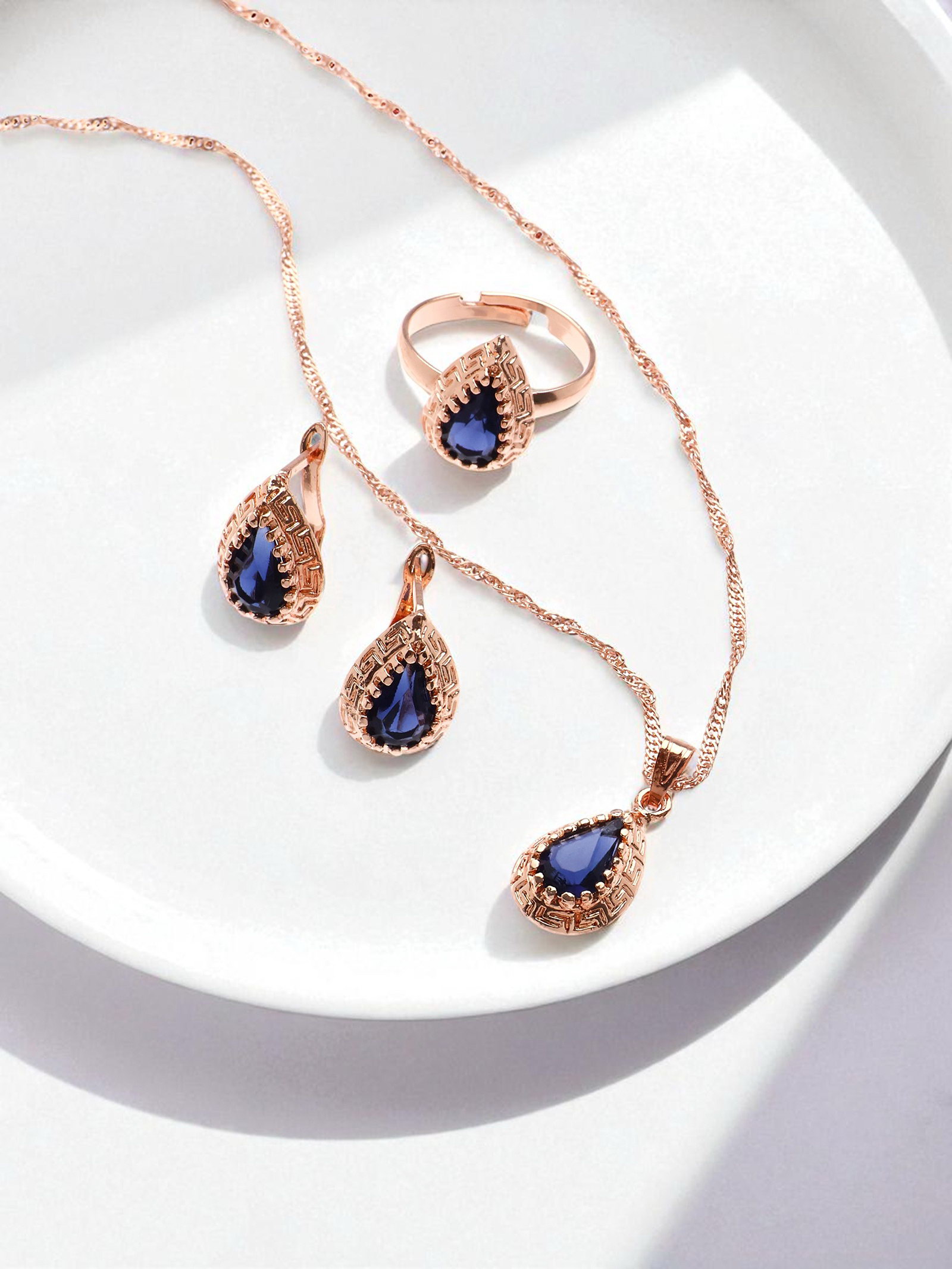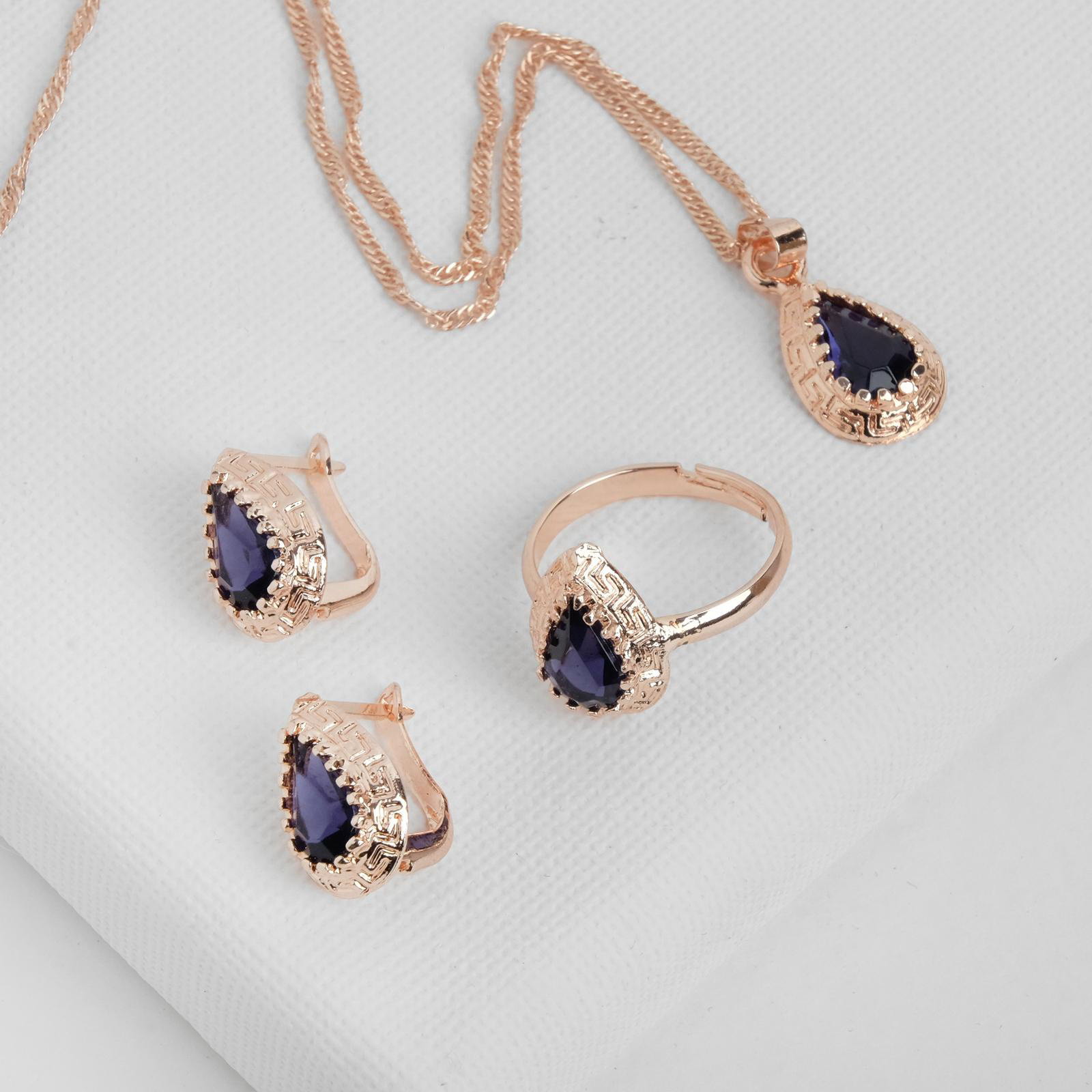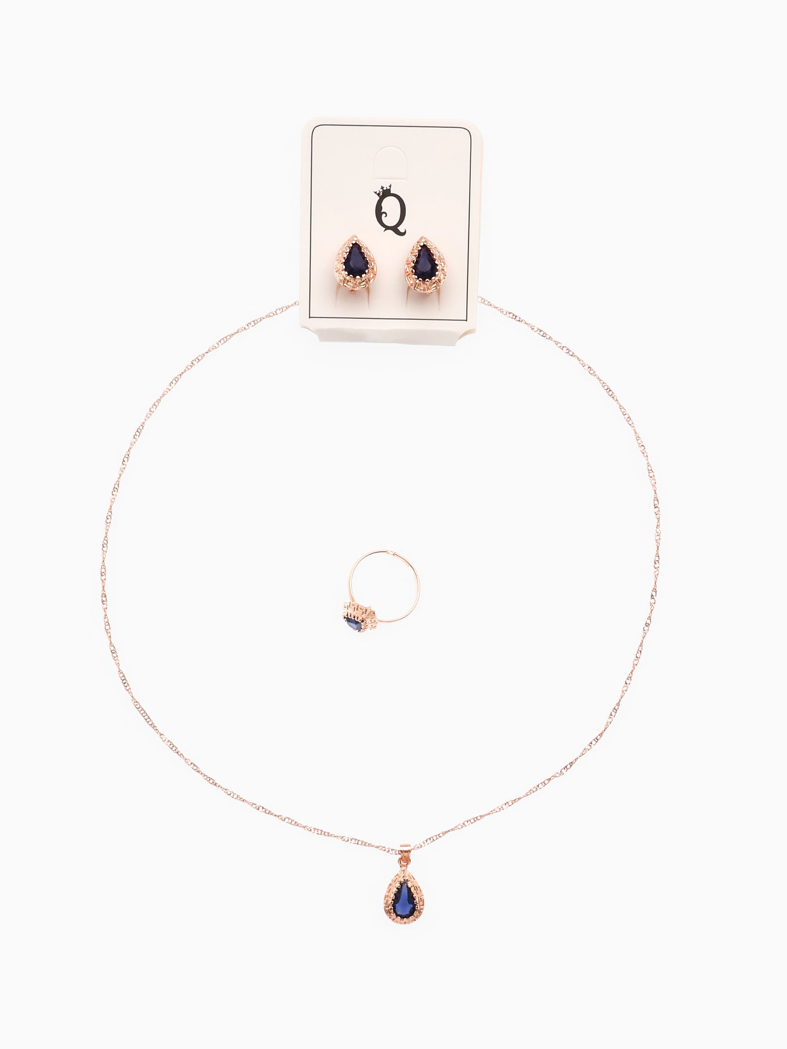 Гарнитур 3 предмета: серьги, кулон, кольцо безразмерное "Эдель" капля, тёмно-синие в золоте, 45 см, 2x45x2 см., QF, Китай