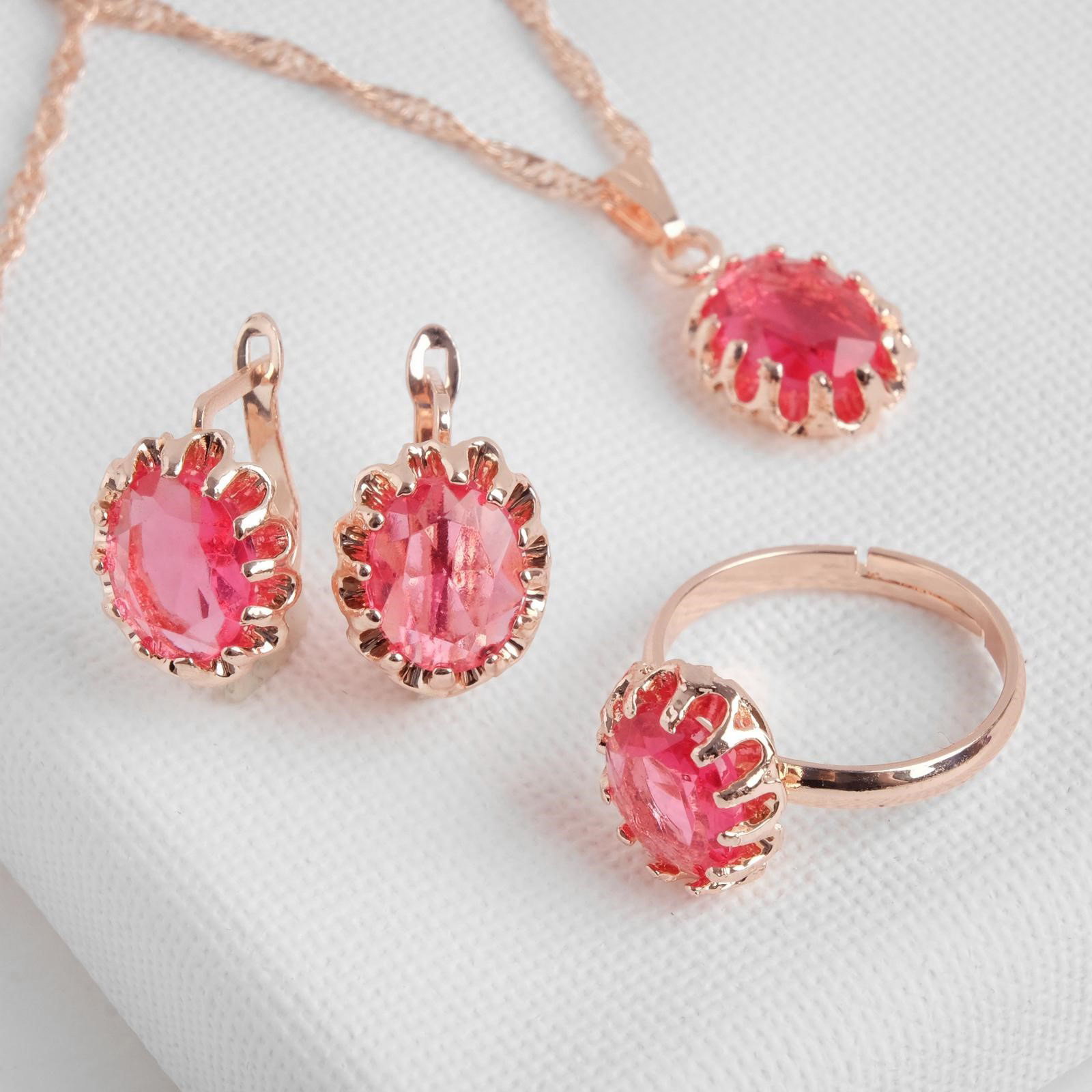 Гарнитур 3 предмета: серьги, кулон, кольцо безразмерное "Эдель" овал, цвет ярко-розовый в золоте, 45 см, 2.5x1.5x45 см., QF, Китай