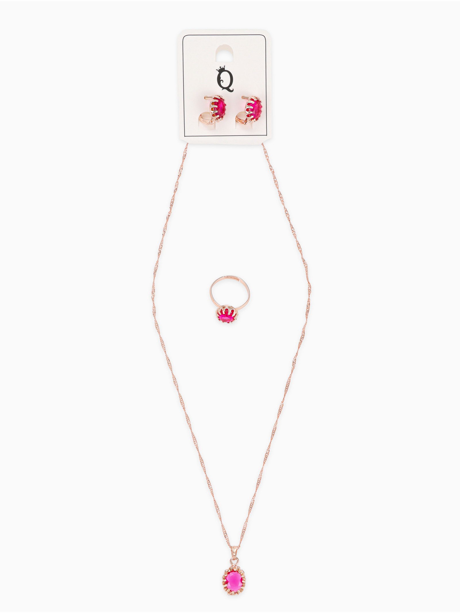 Гарнитур 3 предмета: серьги, кулон, кольцо безразмерное "Эдель", овал, ярко-розовые в золоте, 45 см, 2.5x1.5x45 см., QF, Китай