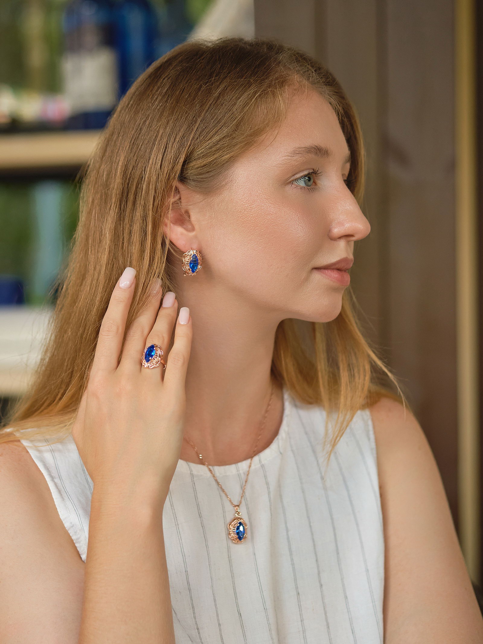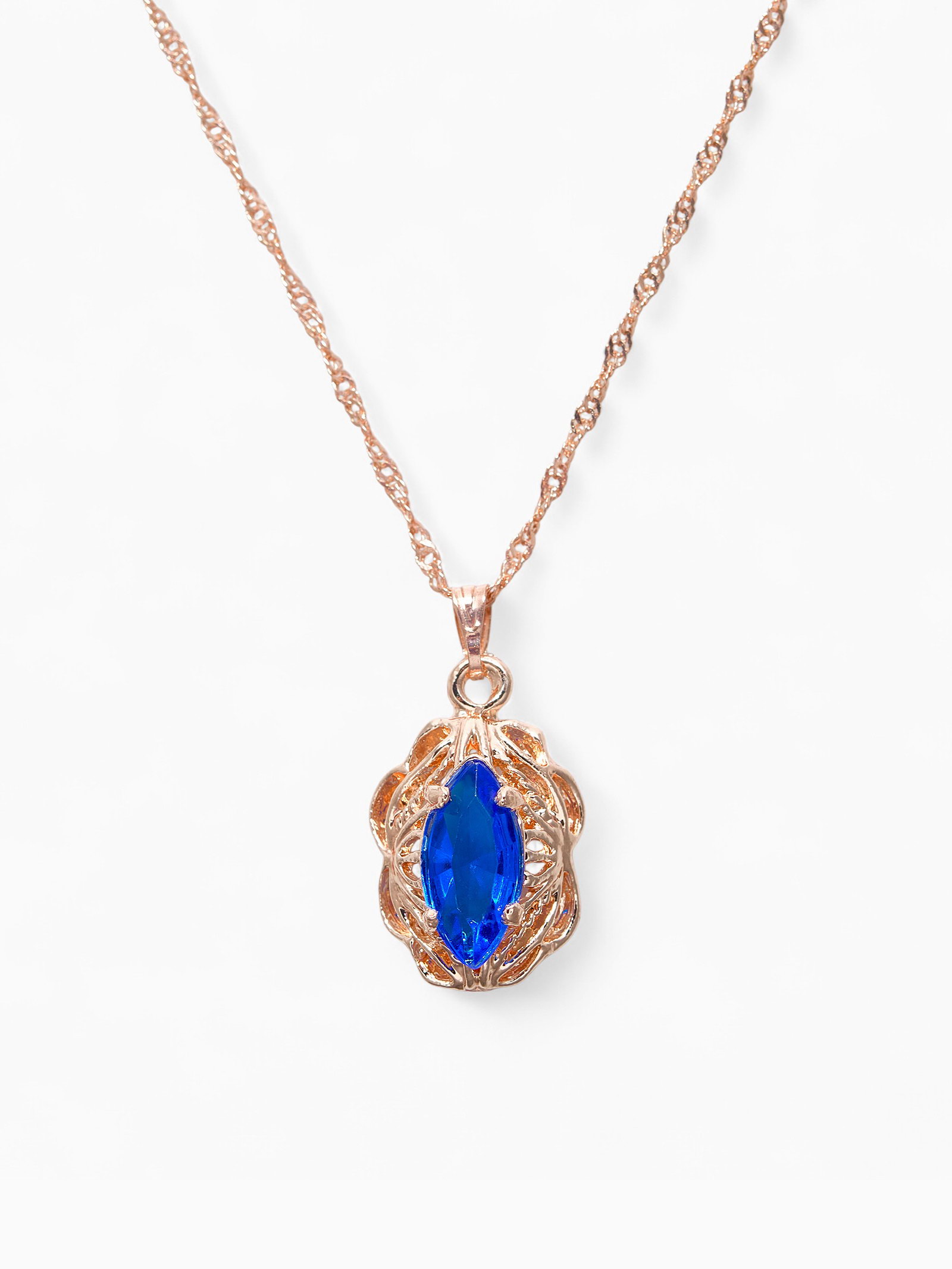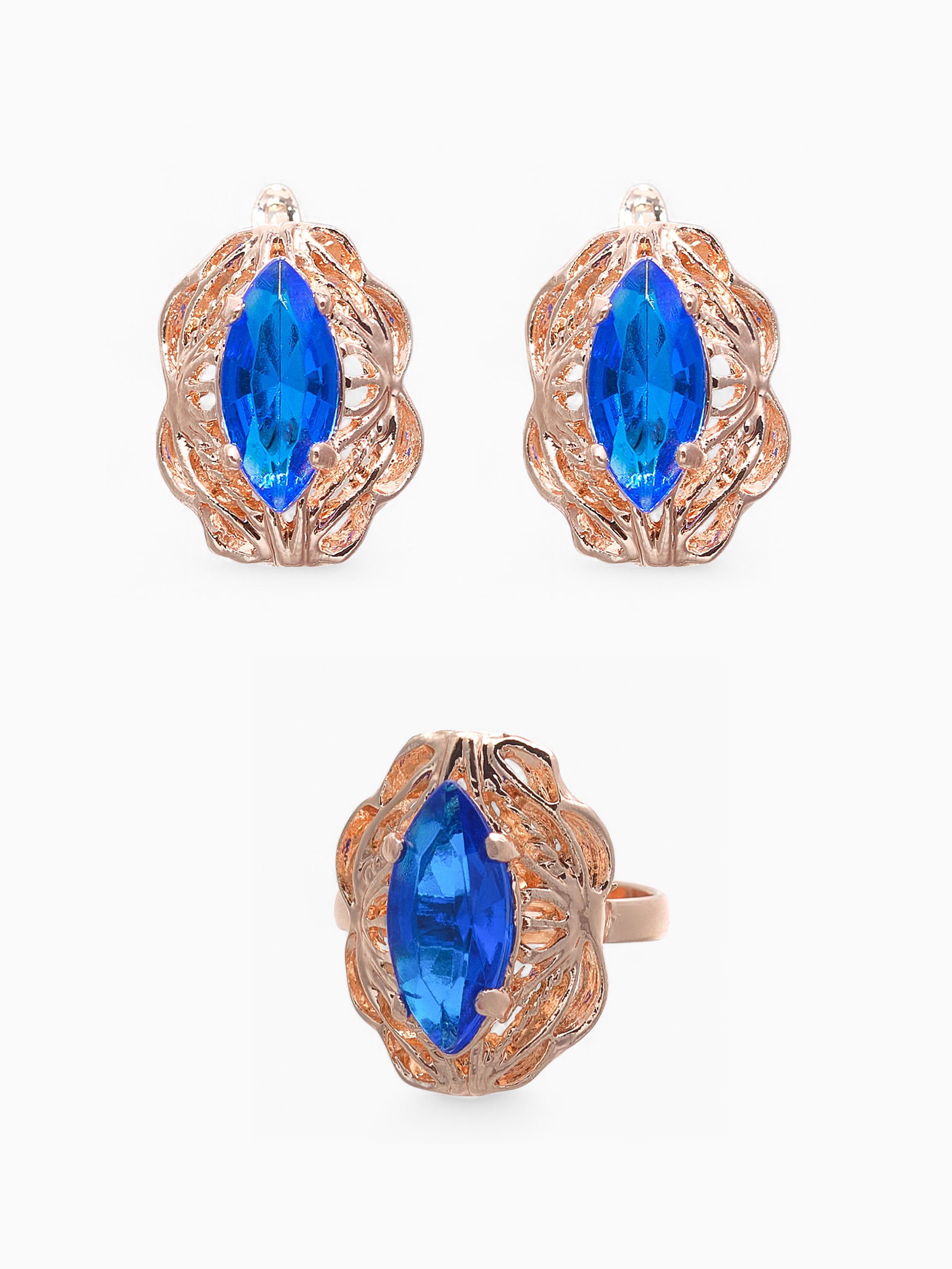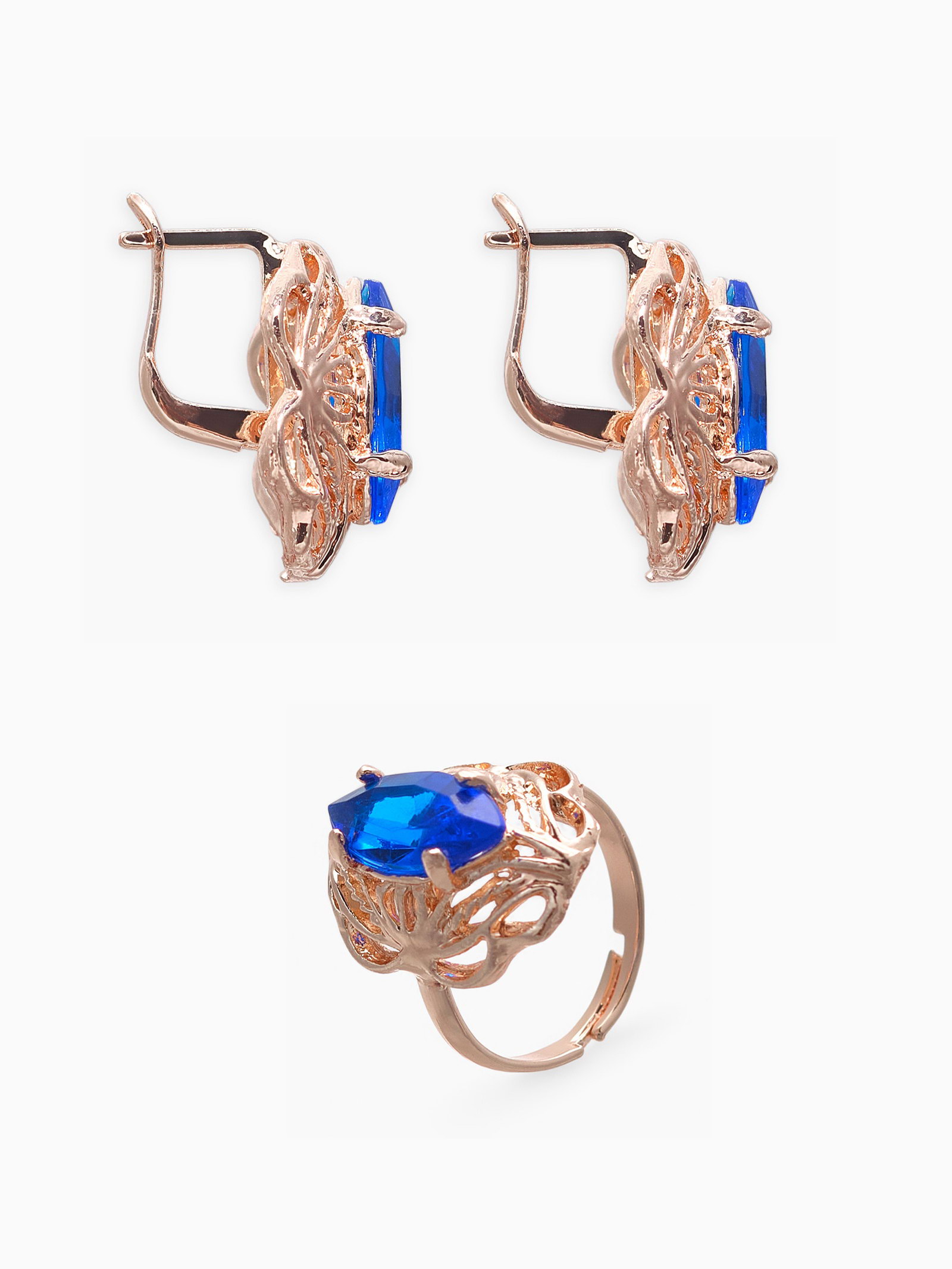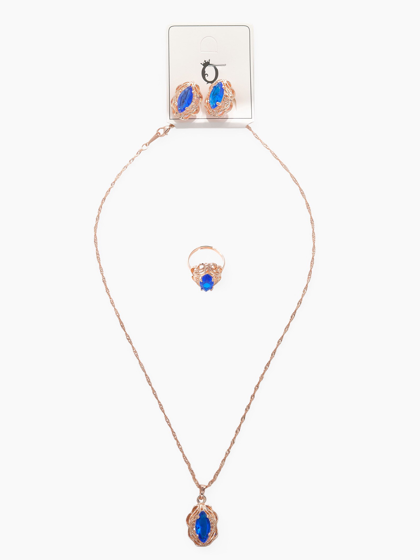 Гарнитур 3 предмета: серьги, кулон, кольцо безразмерное "Эдель" ажурный овал, цвет син в золоте, 45 см, 2x45x1 см., QF, Китай