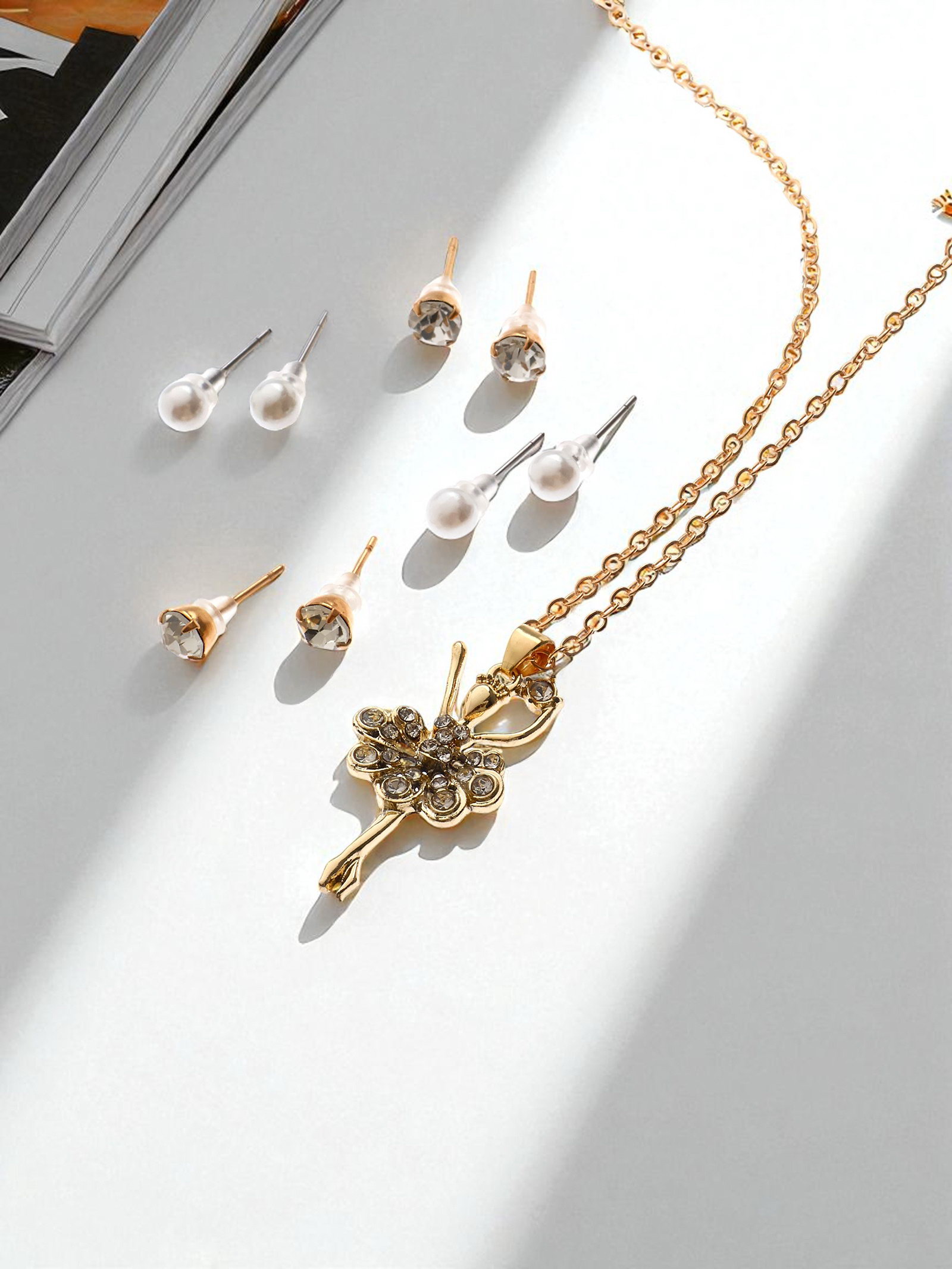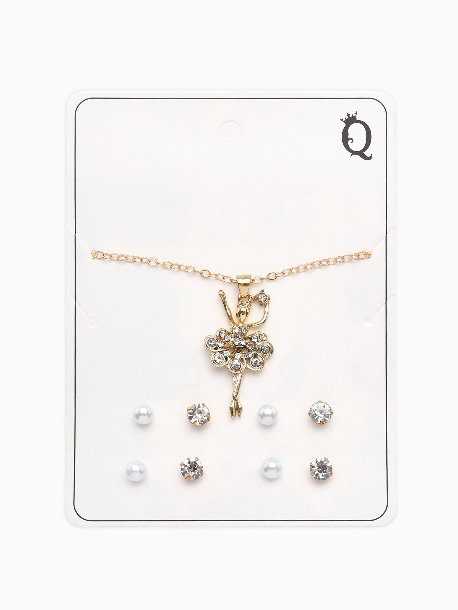 Гарнитур 5 предметов: 4 пары пусет, кулон "Балерина", цвет белый в золоте, 43 см, 3x43x0.7 см., QF, Китай
