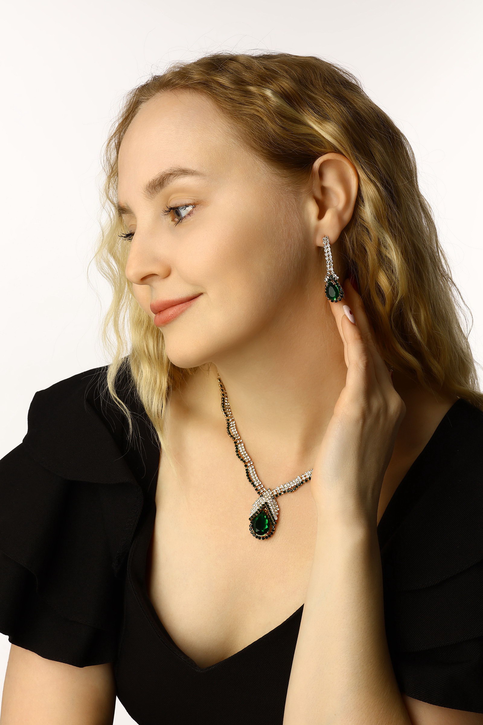 Набор 2 предмета: серьги, колье "Феникс" капля, цвет бело-изумрудный в золоте, 35см, 5x35x1.5 см., QF, Китай