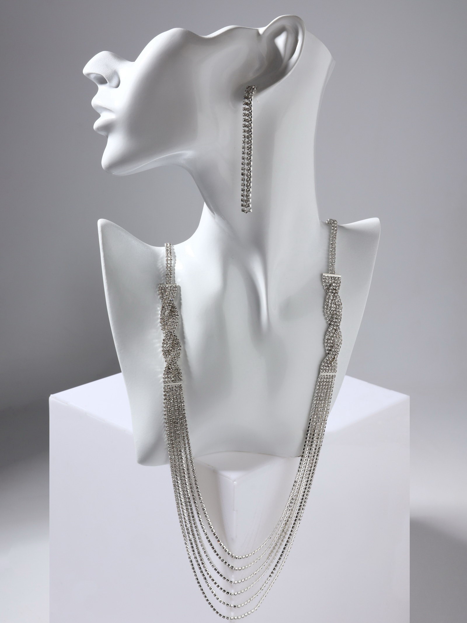 Вид: Колье, Серьги Размер упаковки: 7 x 1 x 32 см. Длина, см: 80 Тематика праздника: Универсальная тематика Вид застёжки: Застёжка пусет (гвоздик) Для кого: Для женщины tnved: 7117190000 Тематика: Кристаллы Температурное ограничение: Нет Состав набора: Серьги + Колье Цвет: Белый Цвет фурнитуры: Серебряный В наборе, шт.: 2 Вставка/Подвеска: Стразы Материал основы: Металл Набор: Да Набор из двух предметов: серьги и колье со стразами это элегантный аксессуар с уникальным дизайном, который добавит сияния вашему образу. Этот комплект идеально подойдет для любого мероприятия, подчеркивая утонченность и стиль. Серьги и колье можно носить вместе или раздельно, дополняя образы для любого случая. Советы по уходу за бижутерией