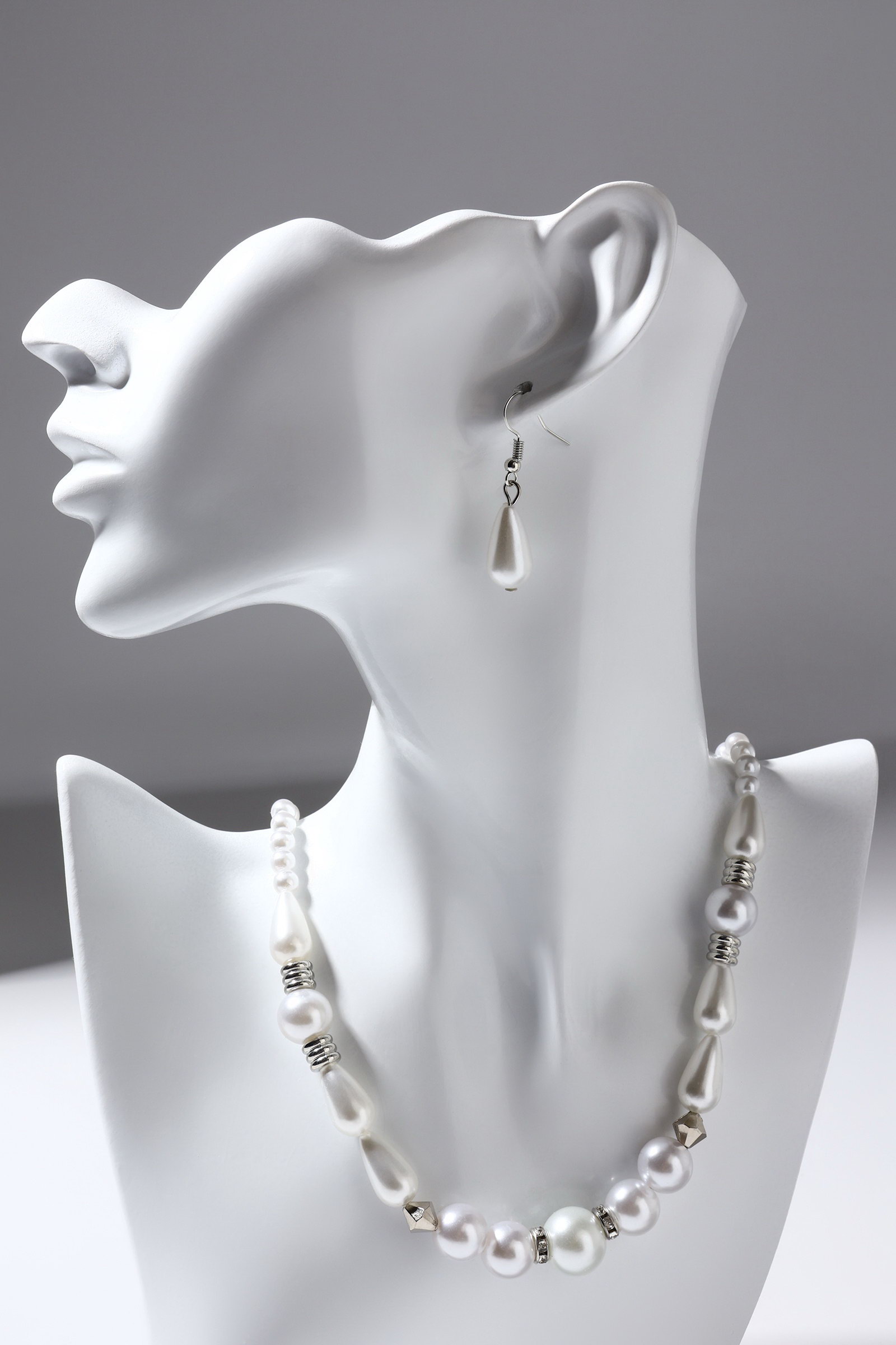 Набор 2 предмета: серьги, бусы "Жемчужная нить", цвет белый в серебре, 45 см, 1.5x2.5x45 см., QF, Китай