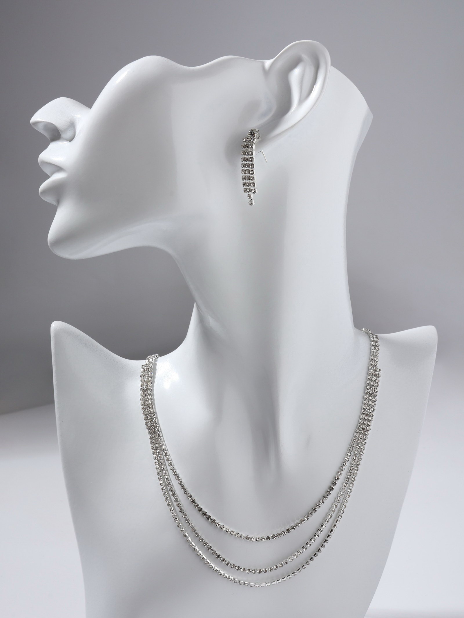 Вид: Колье, Серьги Размер упаковки: 10 x 1.5 x 18 см. Тематика праздника: Свадьба Длина, см: 50 Вид застёжки: Застёжка пусет (гвоздик) tnved: 7117190000 Для кого: Для женщины Тематика: Кристаллы Температурное ограничение: Нет Цвет фурнитуры: Серебряный Состав набора: Серьги + Колье Цвет: Белый В наборе, шт.: 2 Вставка/Подвеска: Стразы Набор: Да Материал основы: Металл Набор из двух предметов: серьги и колье со стразами это элегантный аксессуар с уникальным дизайном, который добавит сияния вашему образу. Этот комплект идеально подойдет для любого мероприятия, подчеркивая утонченность и стиль. Серьги и колье можно носить вместе или раздельно, дополняя образы для любого случая. Советы по уходу за бижутерией