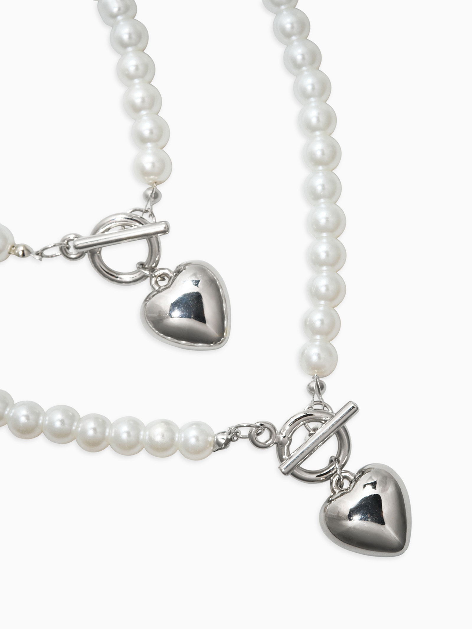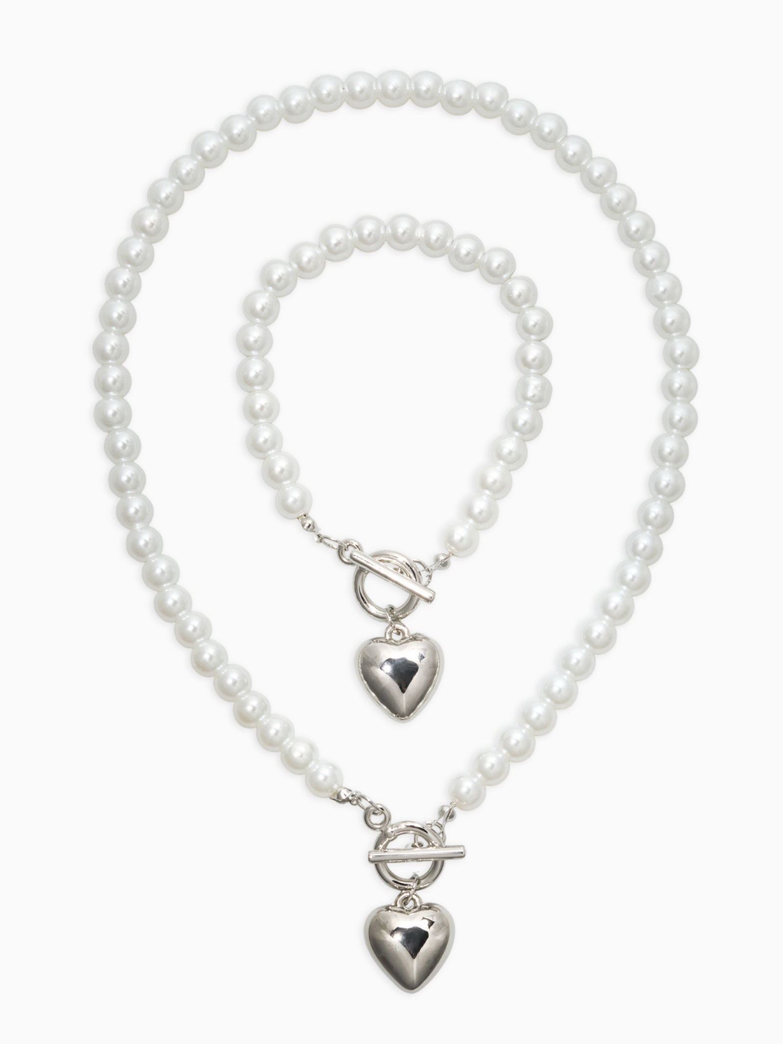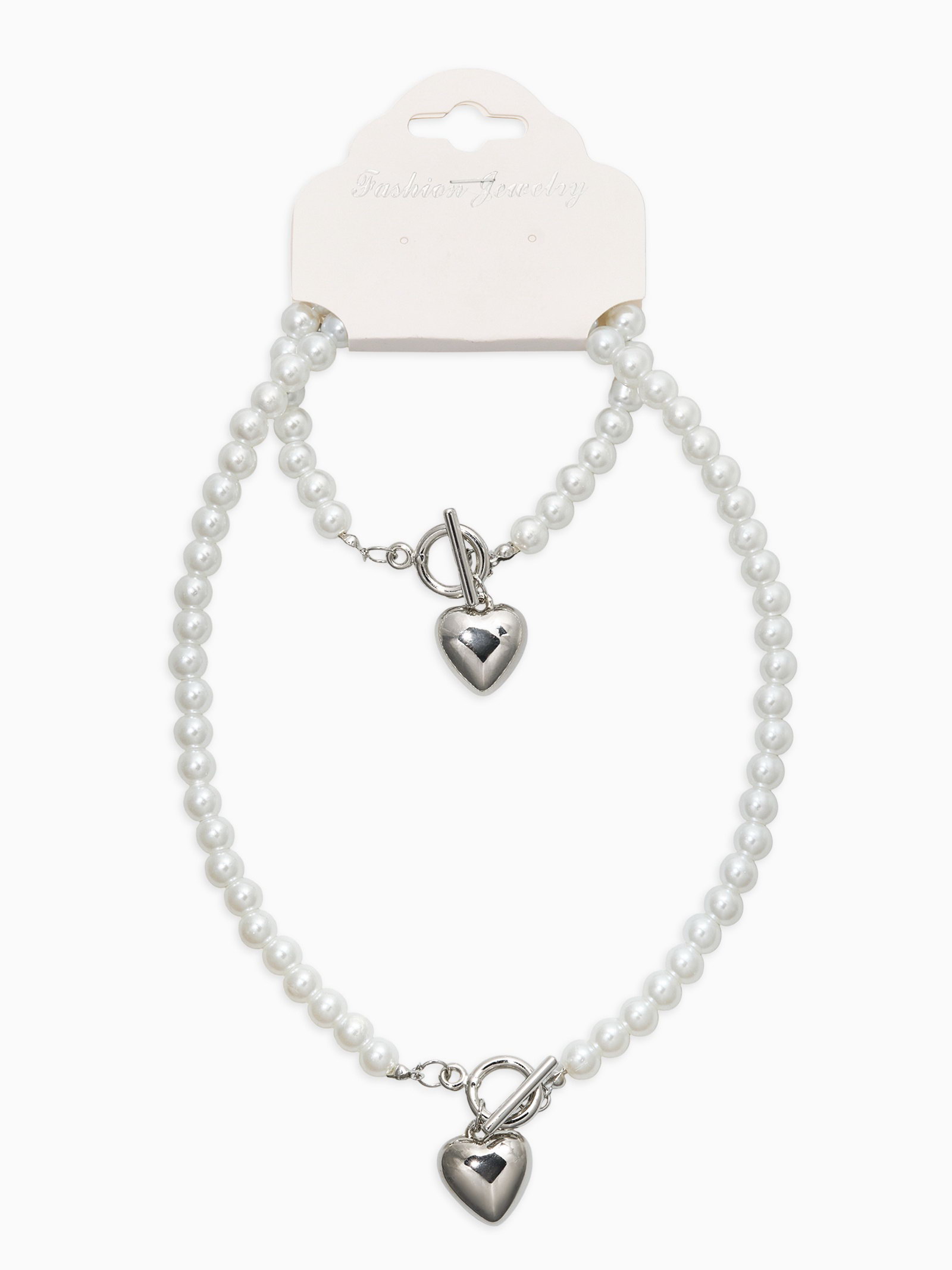 Набор 2 предмета: бусы. браслет "Жемчуг. Сердце", L=18/42 см, №8, белый в серебре, 3x20x2.5 см., QF, Китай