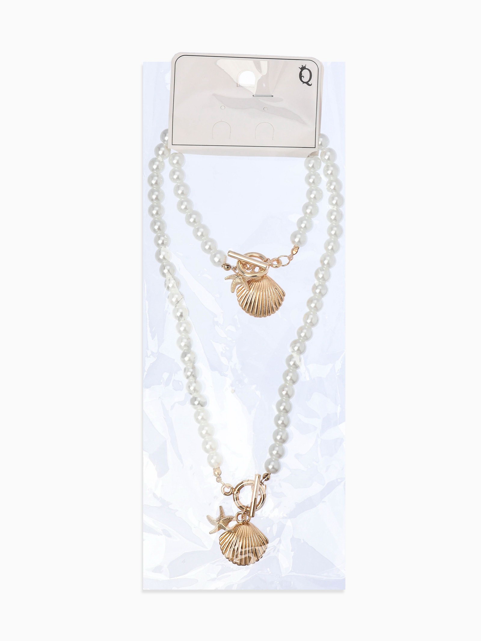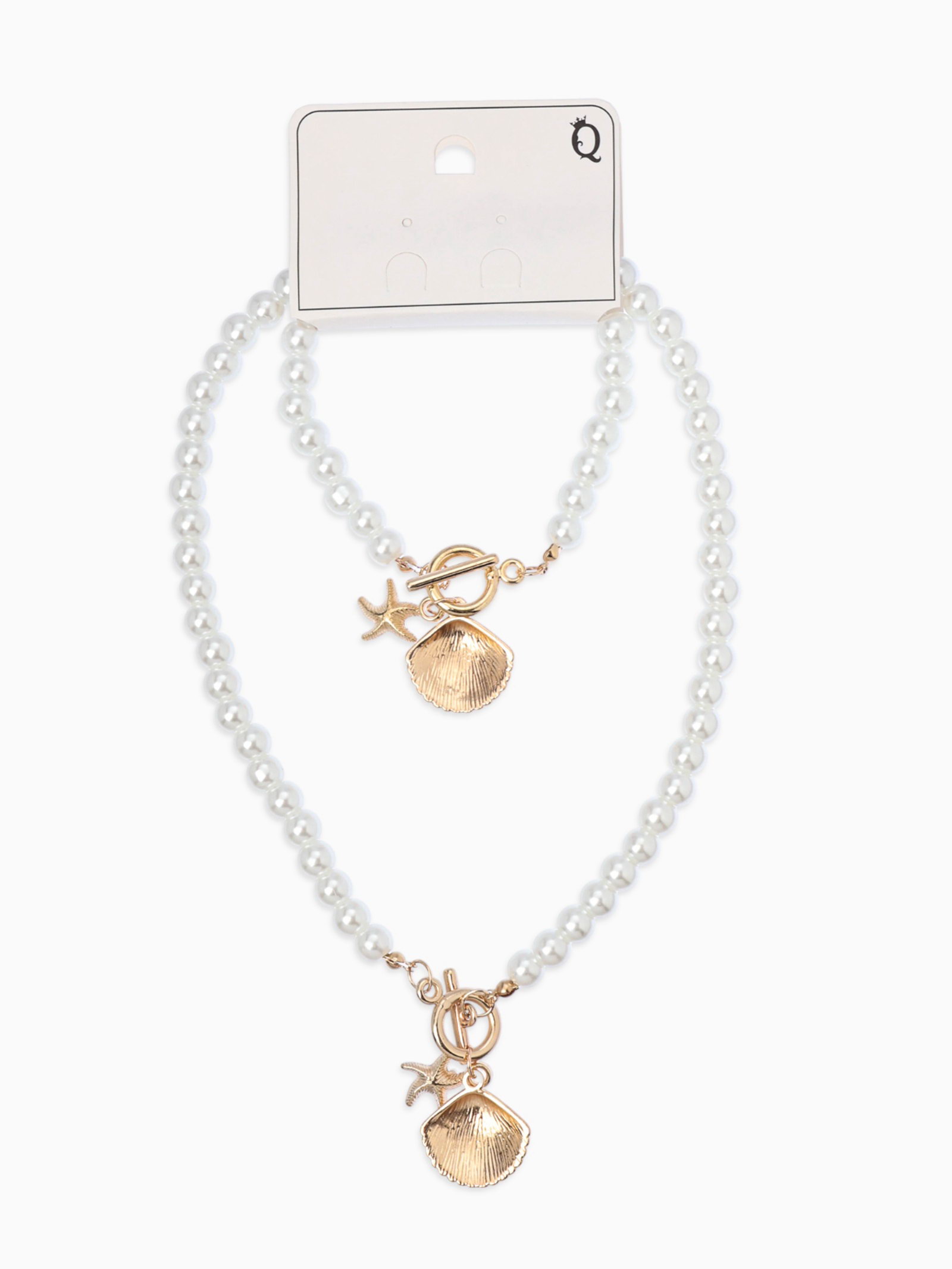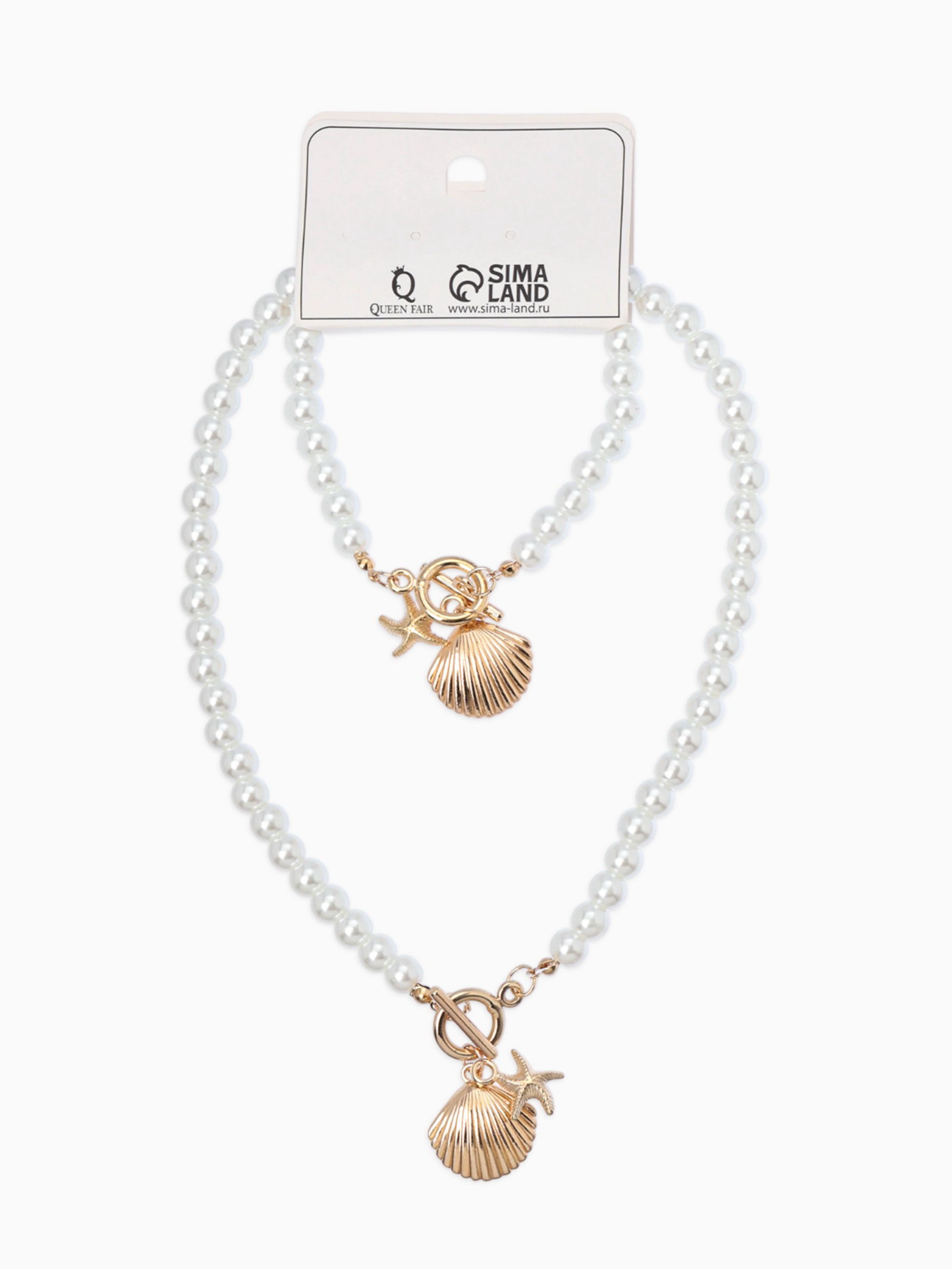 Набор 2 предмета: бусы. браслет "Жемчуг. Ракушка вонголе", L=18/42 см, №8, белый в золоте, 3x20x2.5 см., QF, Китай