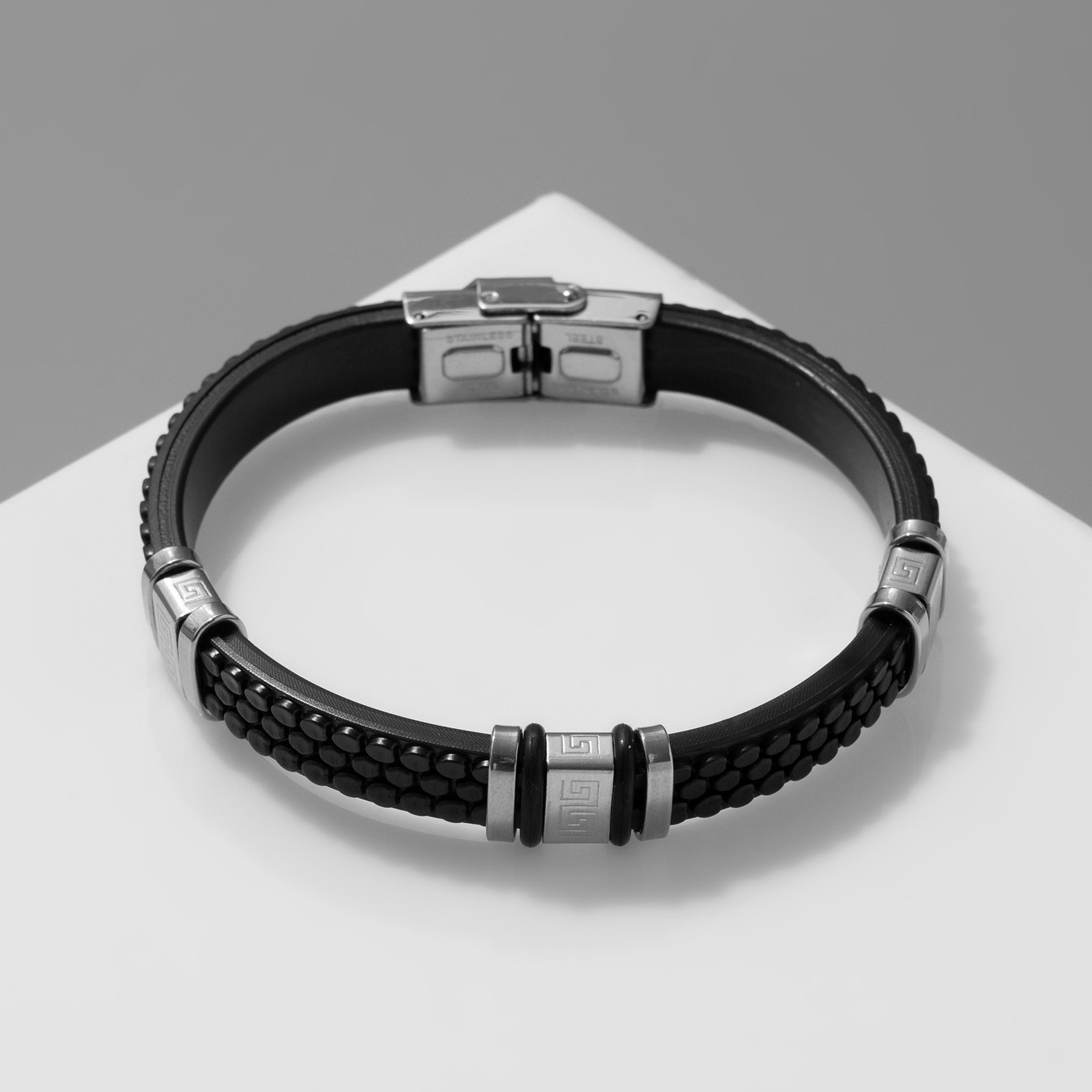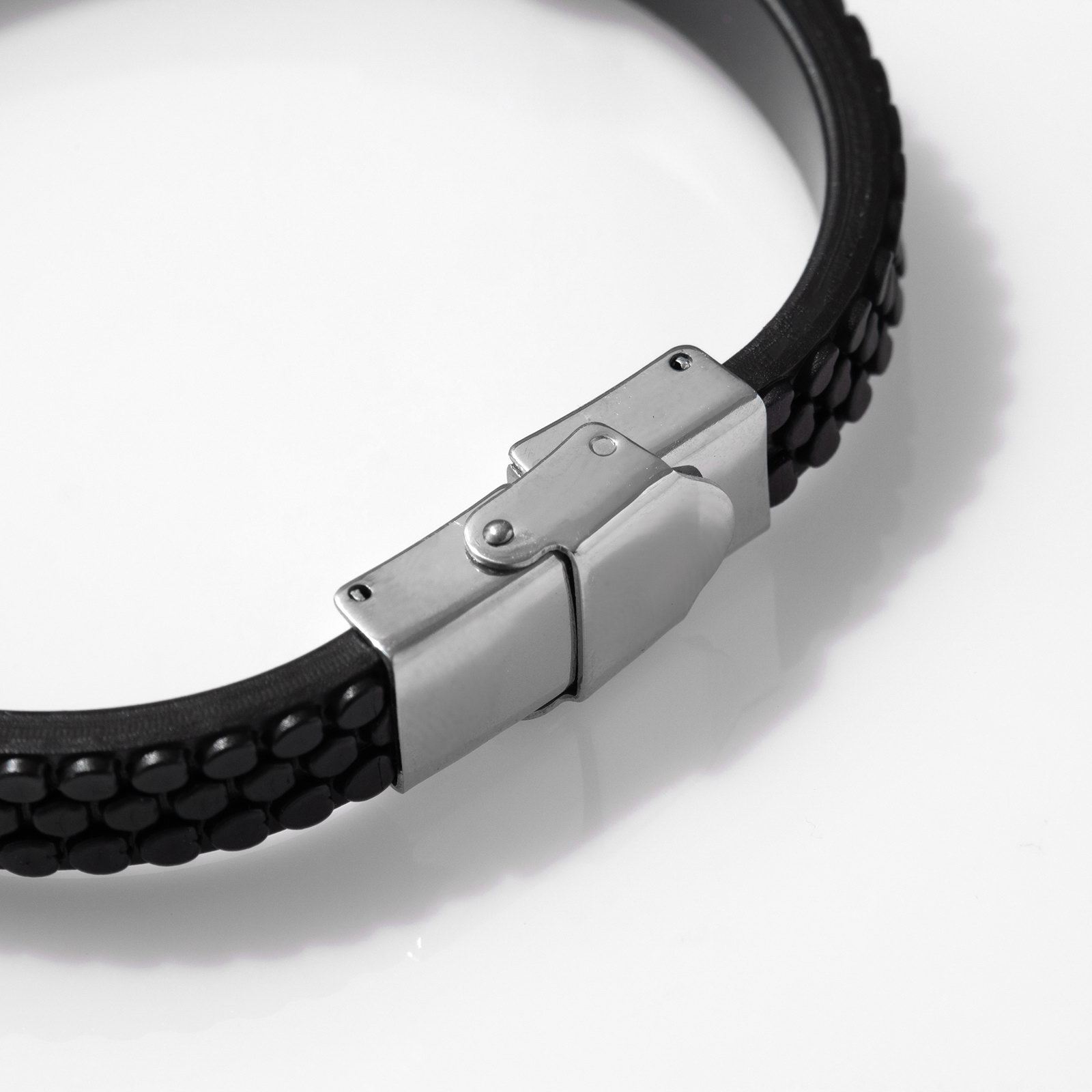 Вид: Браслет, Браслет-обод Тематика праздника: 23 Февраля, День рождения Размер упаковки: 8 x 1.5 x 7 см. Цвет фурнитуры: Серебряный Цвет: Чёрный Материал основы: Каучук Для кого: Для мужчины Тематика подарка: Бижутерия Возраст: Для взрослых Материал основания: Искусственная кожа Вид застёжки: Складная застёжка Вид застёжки: Складная застёжка tnved: 7117900000 Цвет вставки: Серебристый Тематика: Минимализм Длина, см: 22 Вставка/Подвеска: Сталь Набор: Нет Этот мужской браслет-обод из каучука и стали с серебряной фурнитурой станет выразительным аксессуаром для современного мужчины. Его длина 22 см обеспечивает комфортную посадку, а стильный дизайн с этническими мотивами подчеркнёт индивидуальность владельца. Надёжная складная застёжка облегчает надевание и снятие, делая изделие практичным и удобным в использовании. Особенности