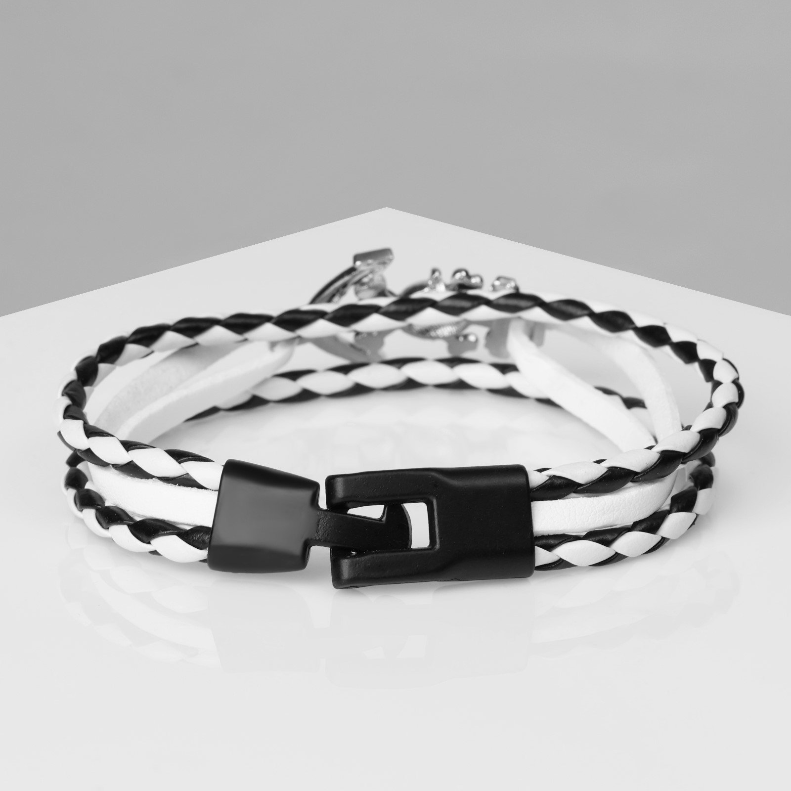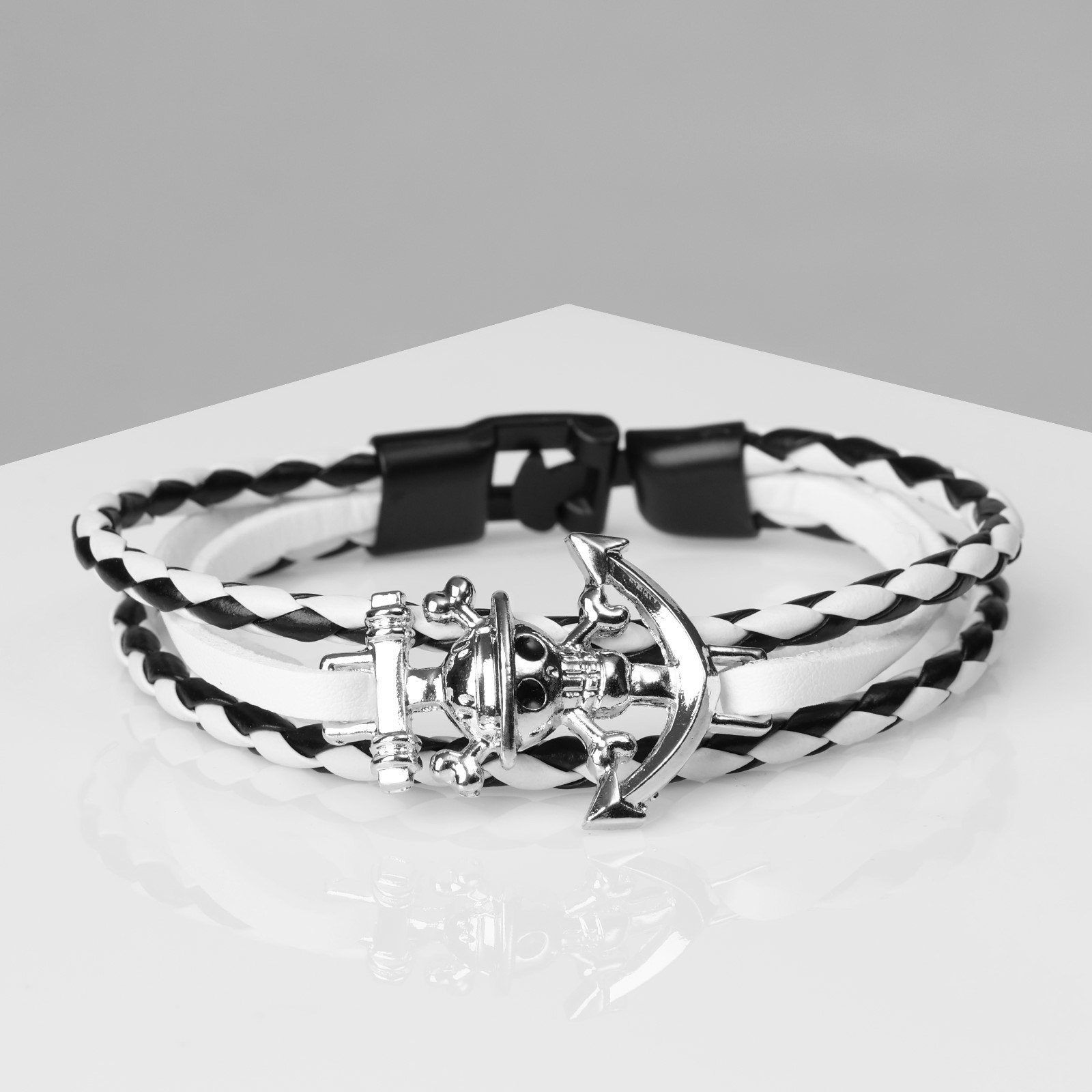 Браслет кожаный "Параллели" якорь с черепом, чёрно-белый с серебром, 21.5 см, 3.3x21.5x0.8 см., QF, Китай