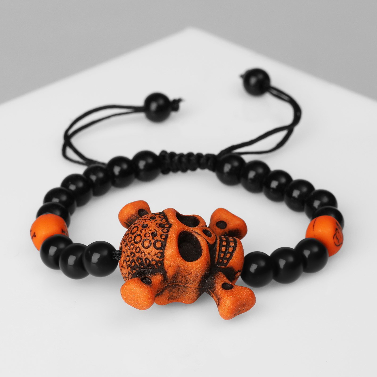 Вид: Браслет, Браслет из бусин, Браслеты Вставка/Подвеска: Полистоун, Стекло Размер упаковки: 5 x 1 x 7 см. Вид застёжки: Затяжка Для кого: Для мужчины tnved: 7117190000 Номер шара: 7 Цвет фурнитуры: Без фурнитуры Цвет: Чёрный Материал основы: Текстиль Набор: Нет Длина, см: 6 Браслет с черепом и костями этническое украшение, выполненное из текстиля, которое подчеркнет индивидуальность и стиль владельца. Его дизайн сочетает в себе элементы мрачной эстетики и оригинальности, делая его подходящим для мужчин, ценящих уникальные аксессуары. Размер 6 см обеспечивает комфортную посадку на запястье. Особенности