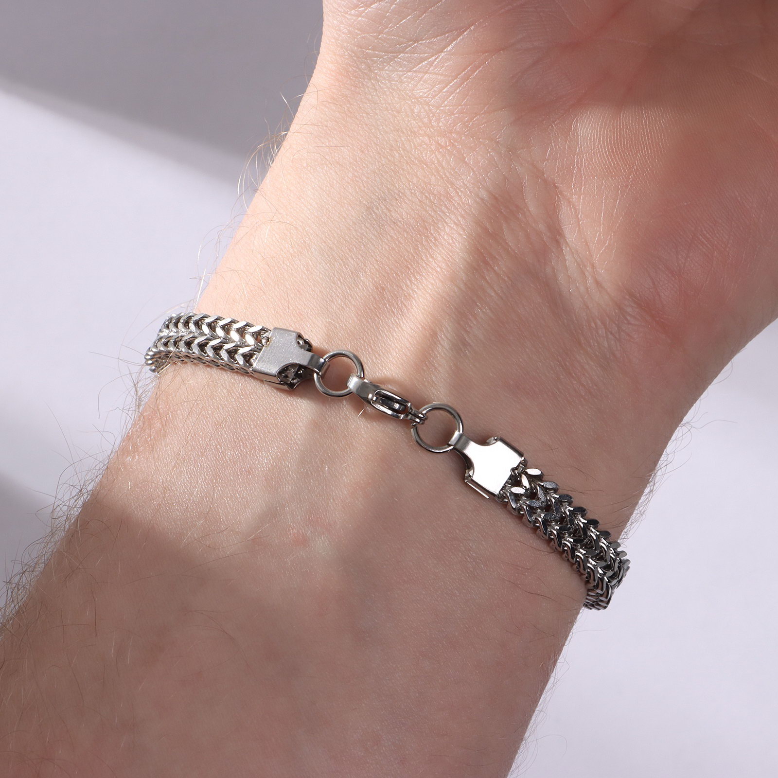 Вид: Браслет, Цепочка Тематика праздника: 23 Февраля, День рождения Тематика: Минимализм, Цепь Размер упаковки: 7 x 1 x 8 см. Для кого: Для мужчины Возраст: Для взрослых Тематика подарка: Бижутерия Вид застёжки: Карабин tnved: 7117190000 Цвет: Серебристый Цвет фурнитуры: Серебряный Материал основы: Сталь Вставка/Подвеска: Без вставок Набор: Нет Длина, см: 20 Мужской браслет из стали с зигзагообразным дизайном длиной 20 см современное украшение, которое подчеркнет стиль и индивидуальность владельца. Выполненный из прочной стали с серебристым покрытием, он подходит для повседневного ношения и особых случаев. Надежная застежка-карабин обеспечивает комфорт и безопасность при использовании. Особенности