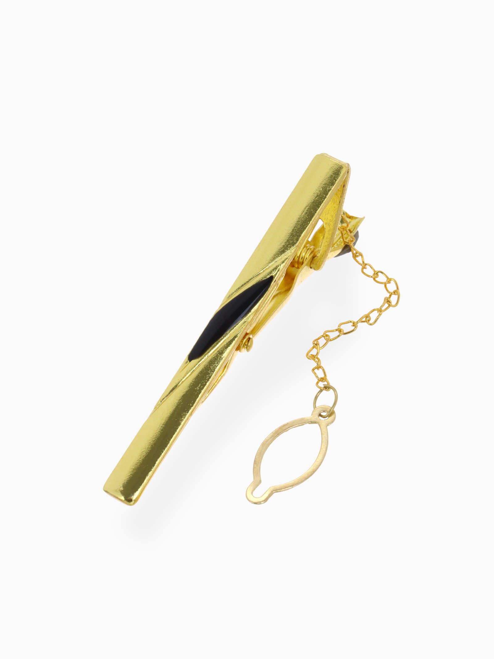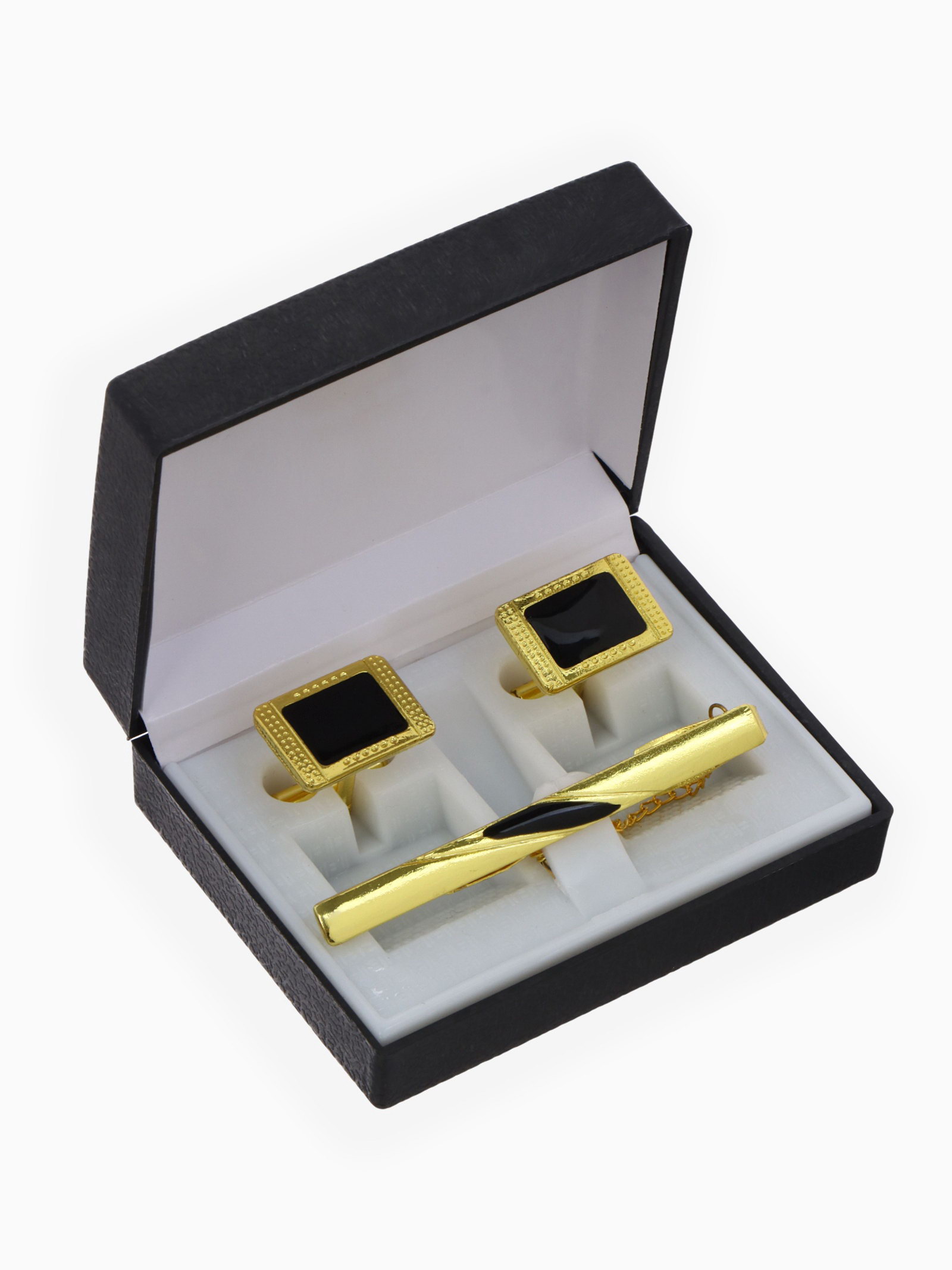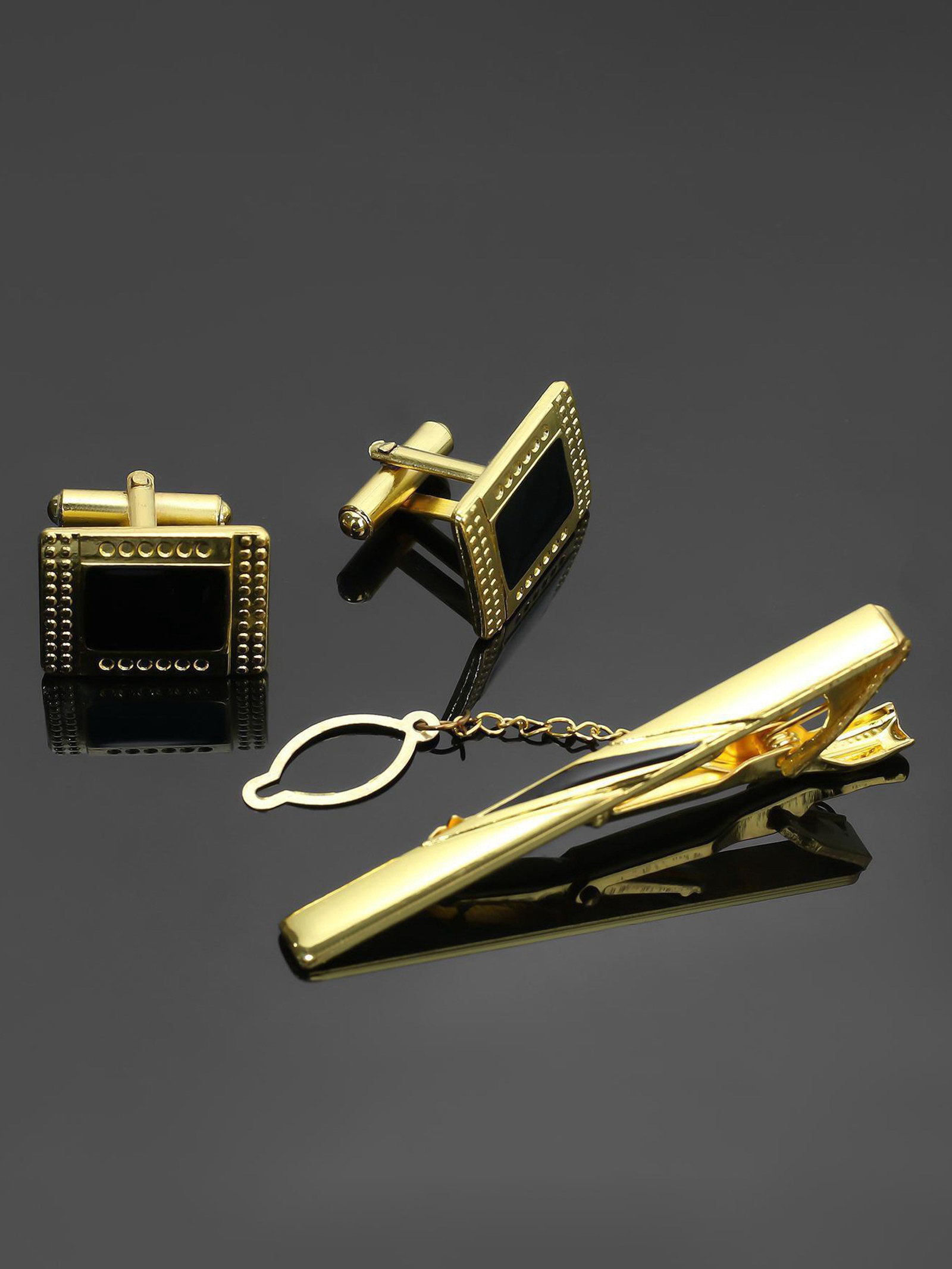 Набор мужской медный "Запонки+Зажим для галстука", рельеф, прямоугольник, чёрный в золотом, 1.9x6x1.5 см., Китай