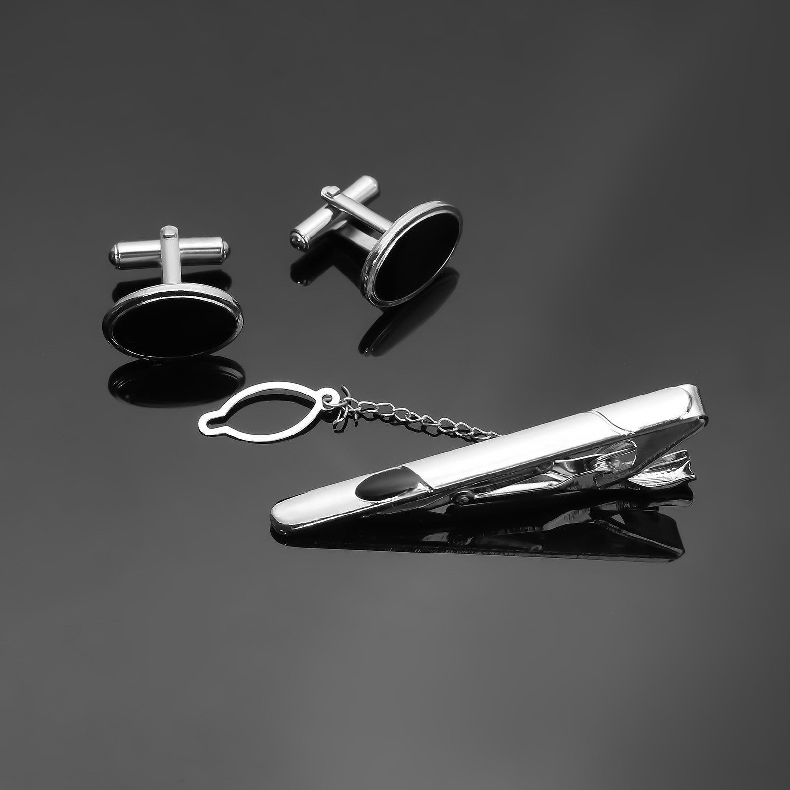 Набор мужской медный "Запонки + Зажим для галстука" овал с эмалью, чёрный в серебре, 1.9x6x1.2 см., Queen fair, Китай