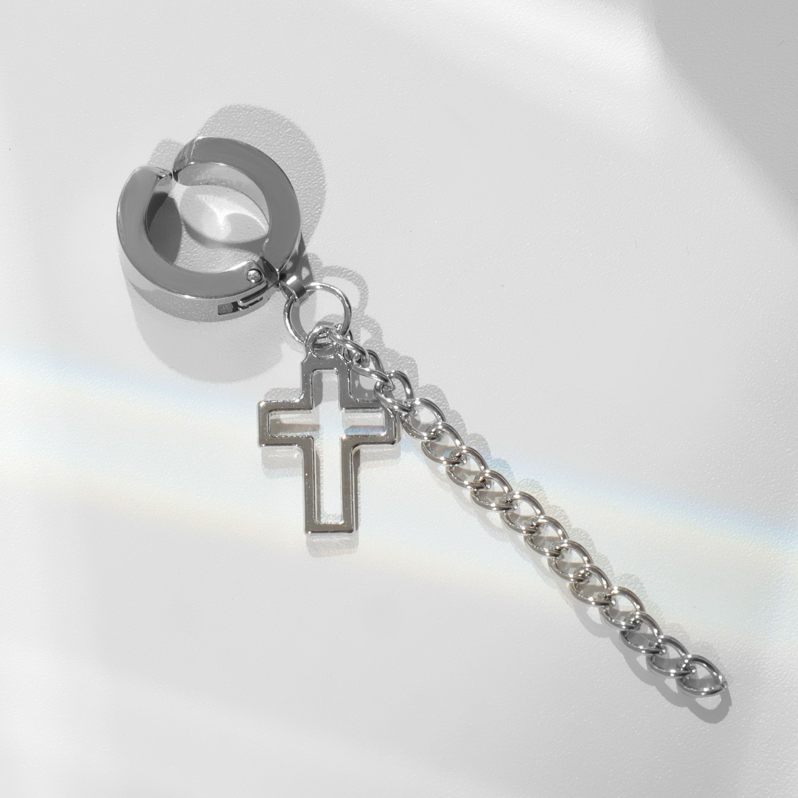 Пирсинг в ухо без прокола "Крестик" с цепью, d=13 мм, цвет серебро, 1.3x5.5x1 см., QF, Китай
