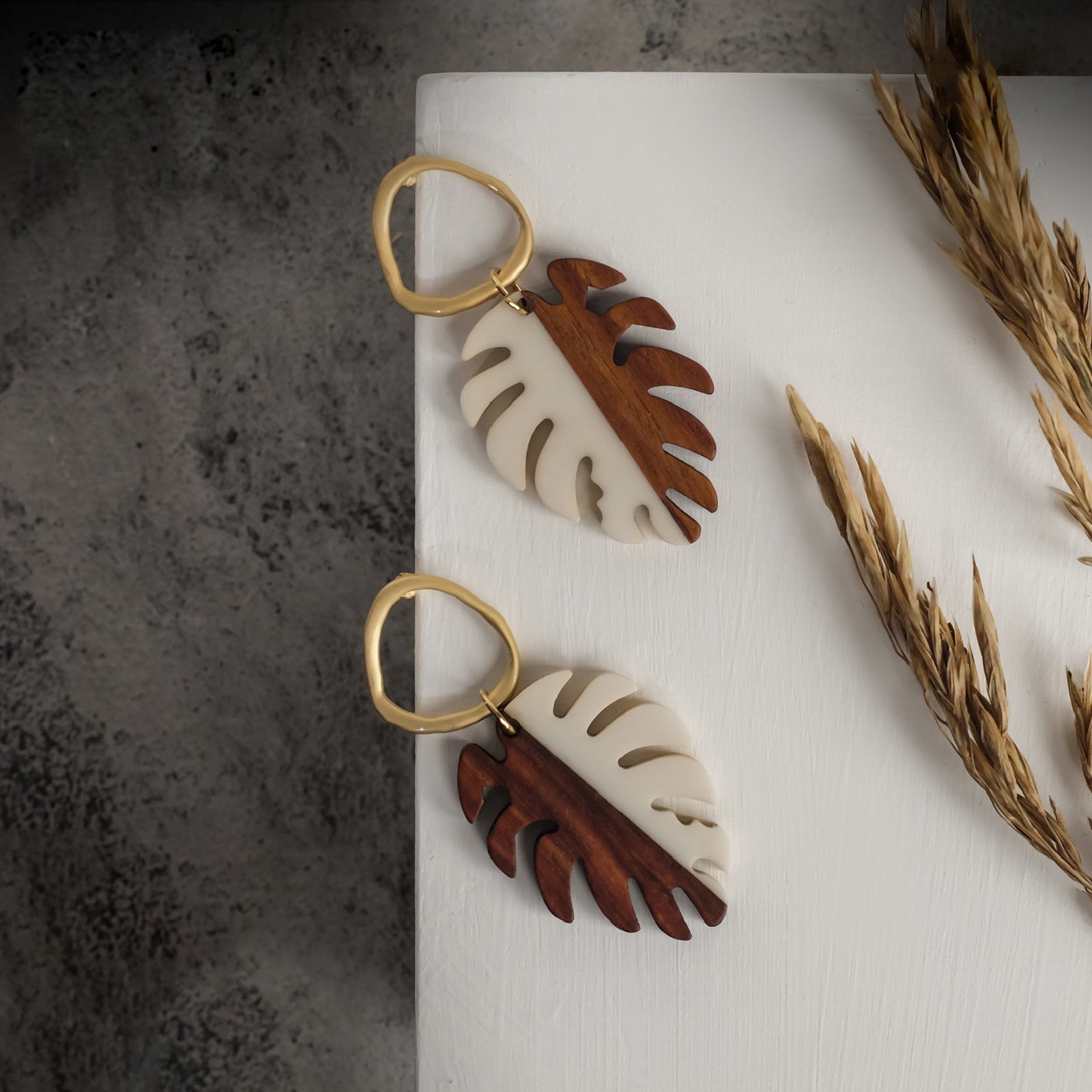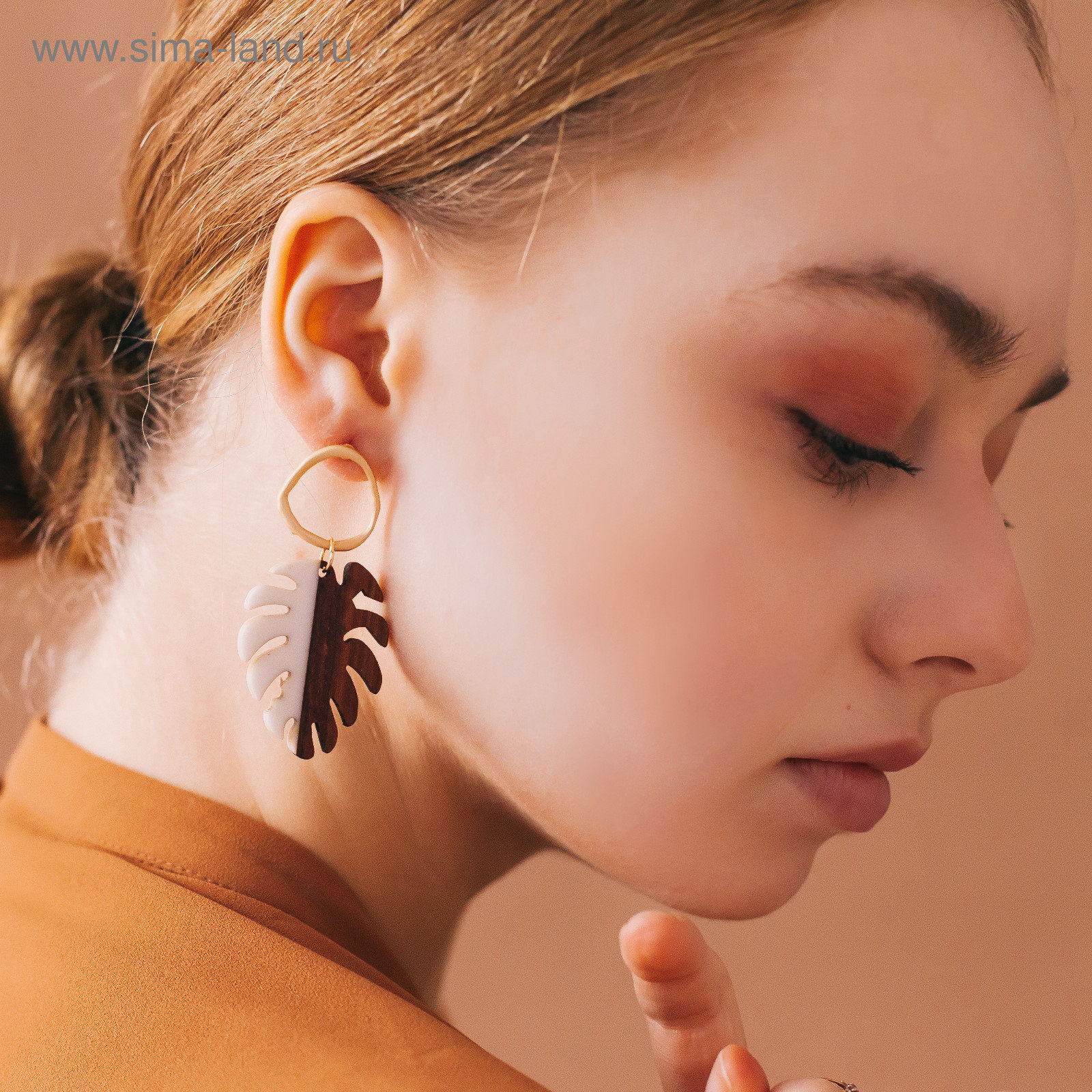 Серьги из дерева "Ваканда" монстера, цвет бело-коричневый в золоте, 3x6x0.6 см., QF, Китай