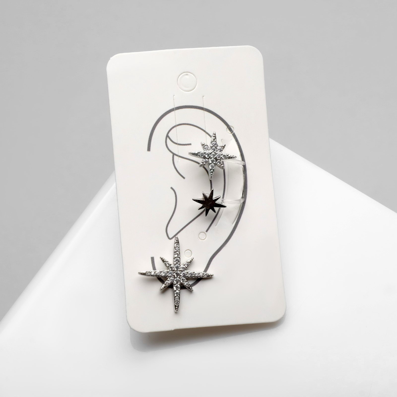 Набор серег и кафф "Полярные звёзды", 3 шт. белые в серебре, 1.5x2x3.5 см., QF, Китай