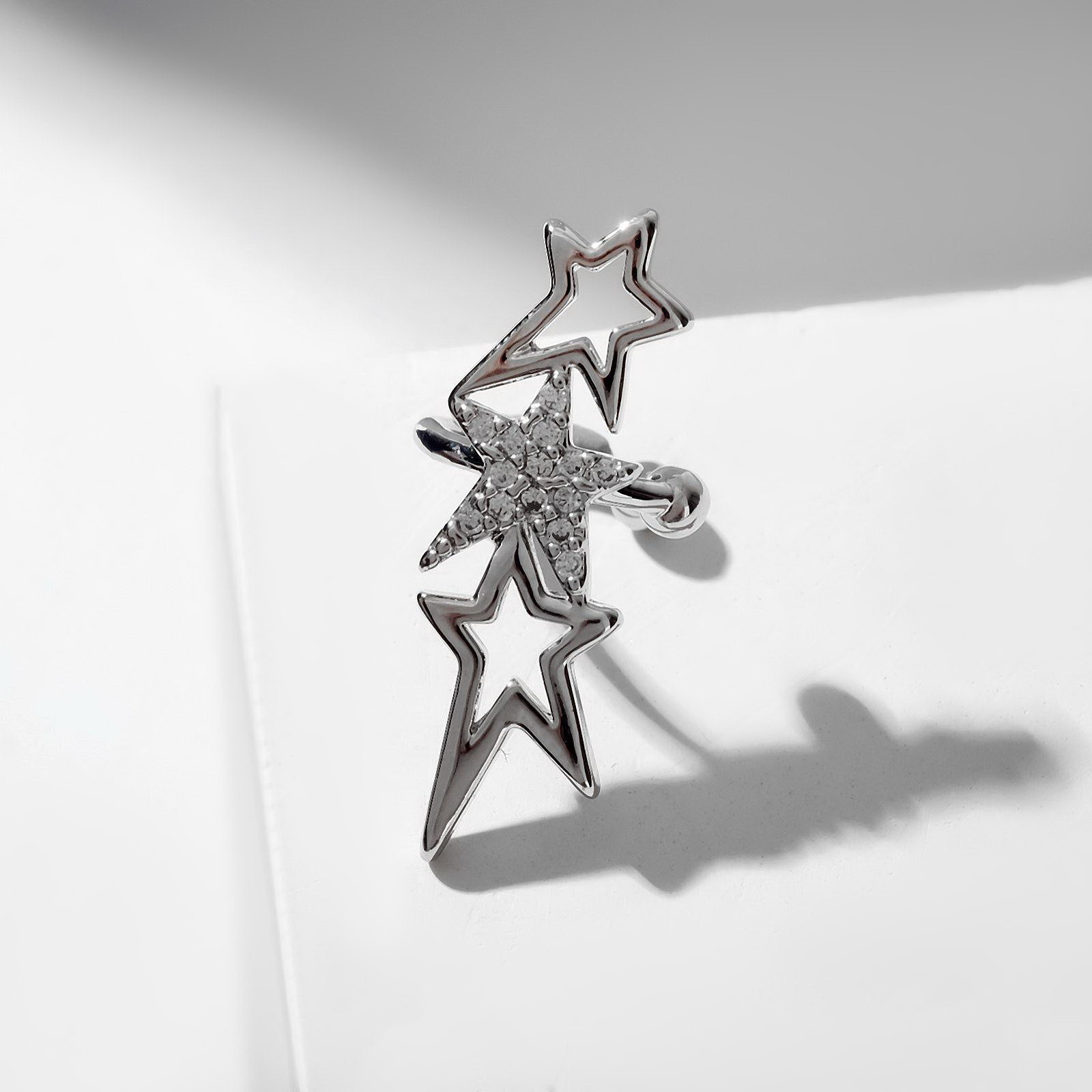Серьга "Кафф" три звезды, цвет белый в серебре, 1x2.5x1 см., QF, Китай