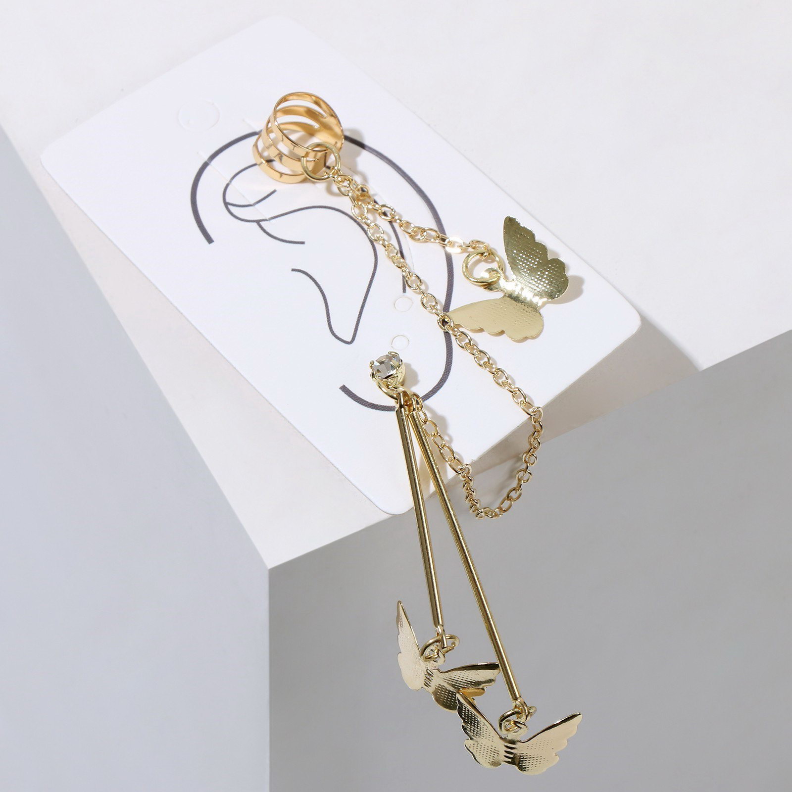 Серьга кафф "Бабочки", с цепочкой, цвет золото, 3x9x1 см., QF, Китай