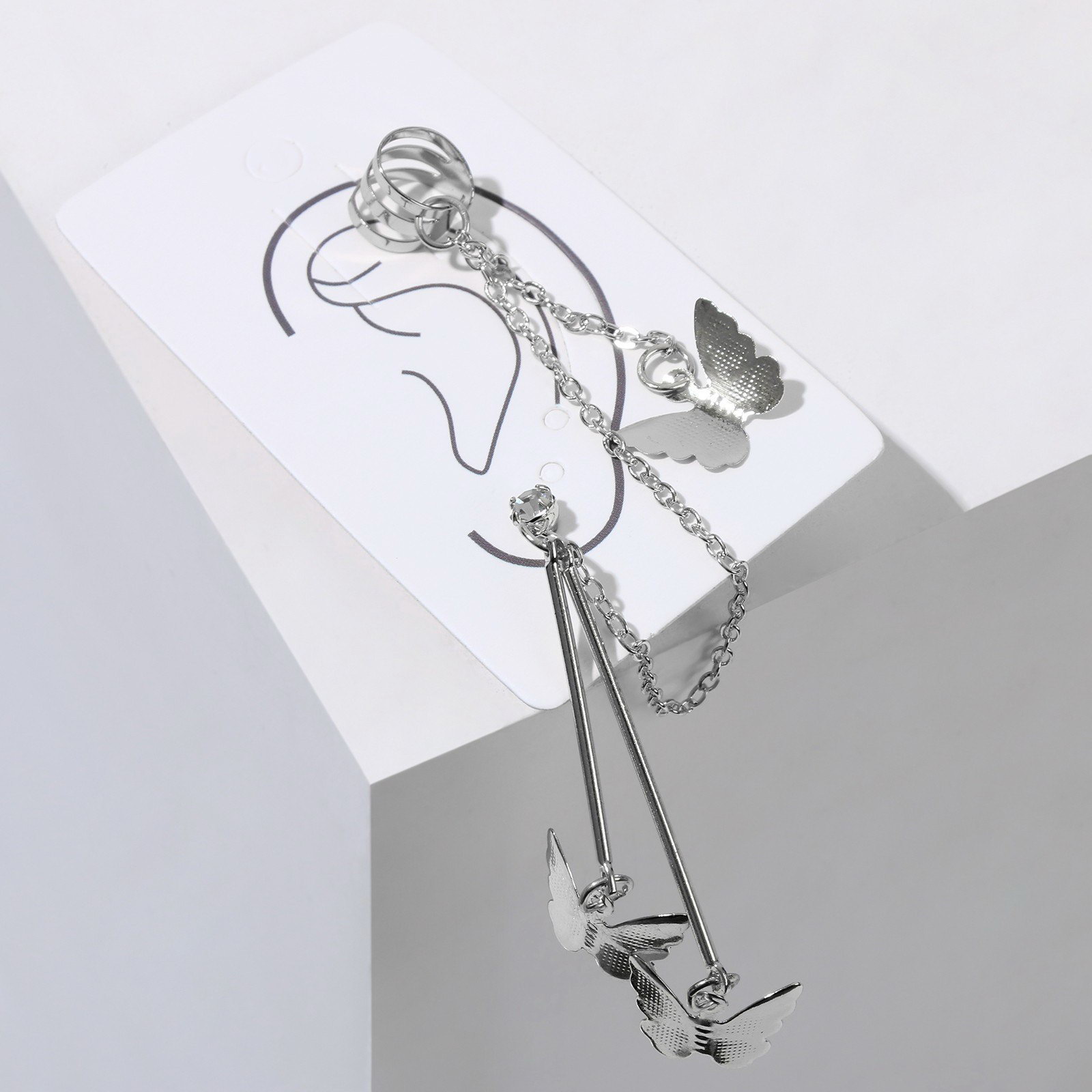 Серьга "Кафф" бабочка, цвет серебро, 3x9x1 см., QF, Китай