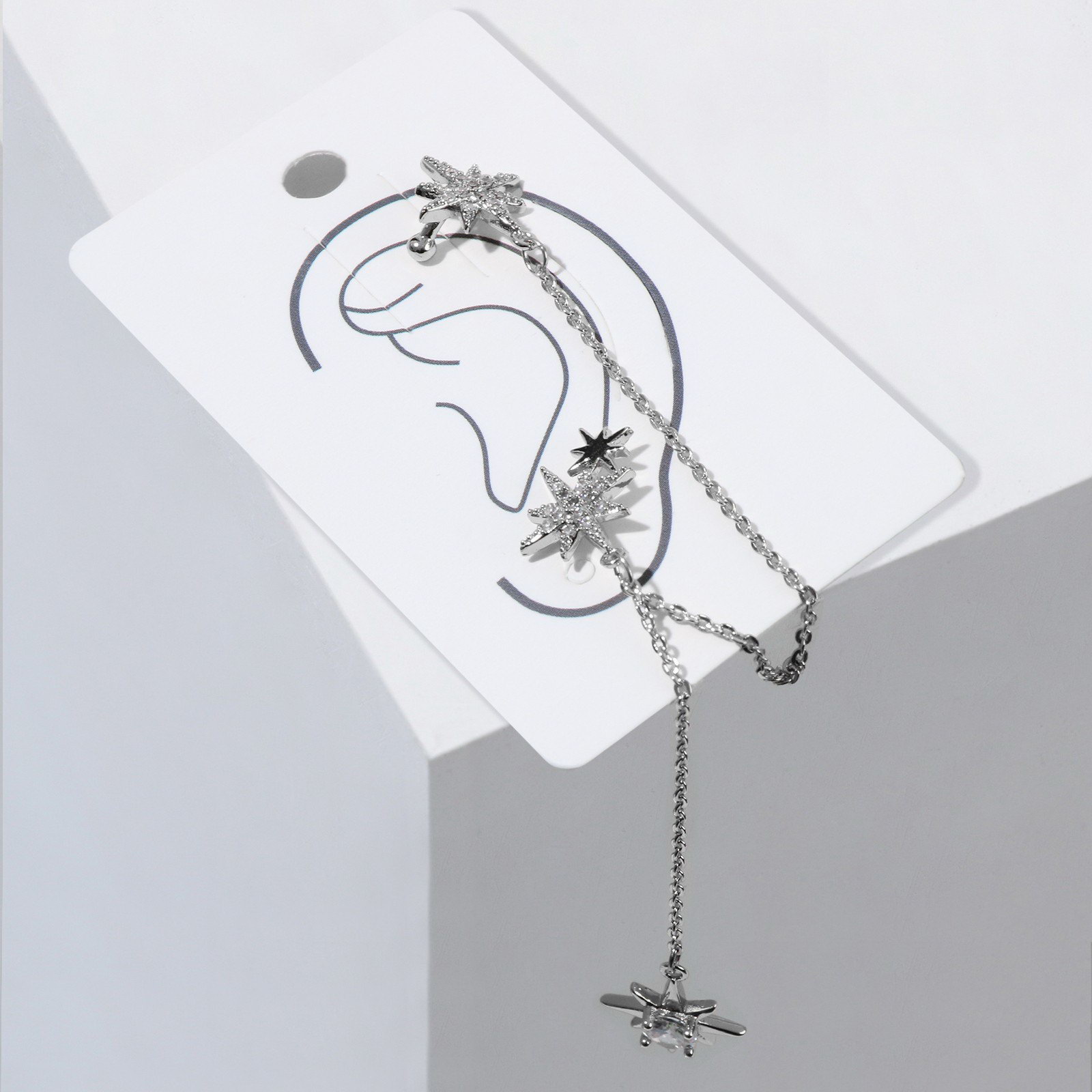 Серьга кафф "Северная звезда", с цепью, цвет белый в серебре, 2x10x1 см., QF, Китай