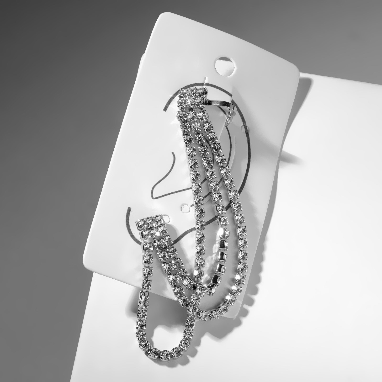 Серьга кафф "Подвески", со стразами, цвет белый в серебре, 2.5x7x1 см., QF, Китай