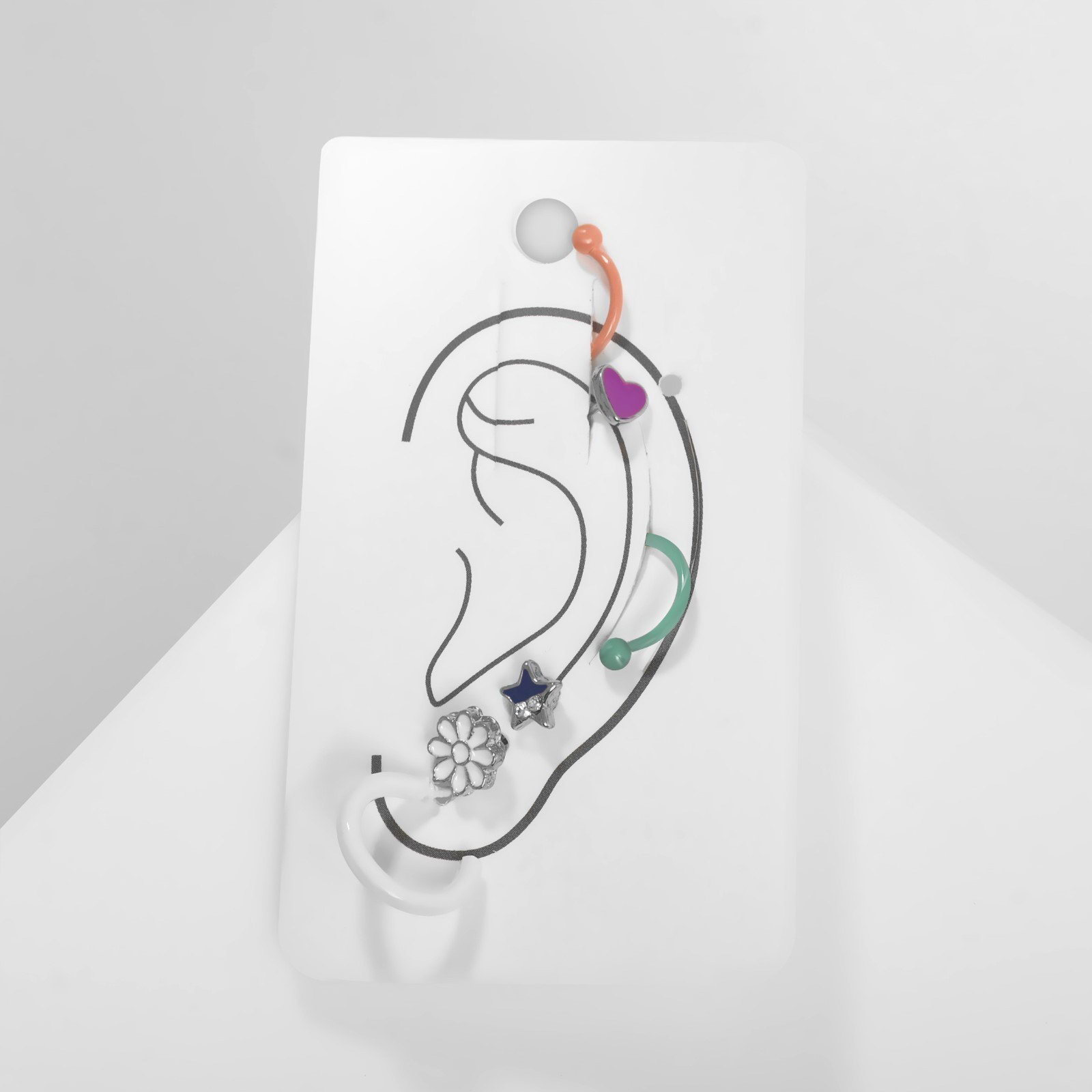 Набор серег и кафф "Фантазия" фантазия, набор 5 шт., цветные с серебром, 0.7x1.3x0.2 см., QF, Китай