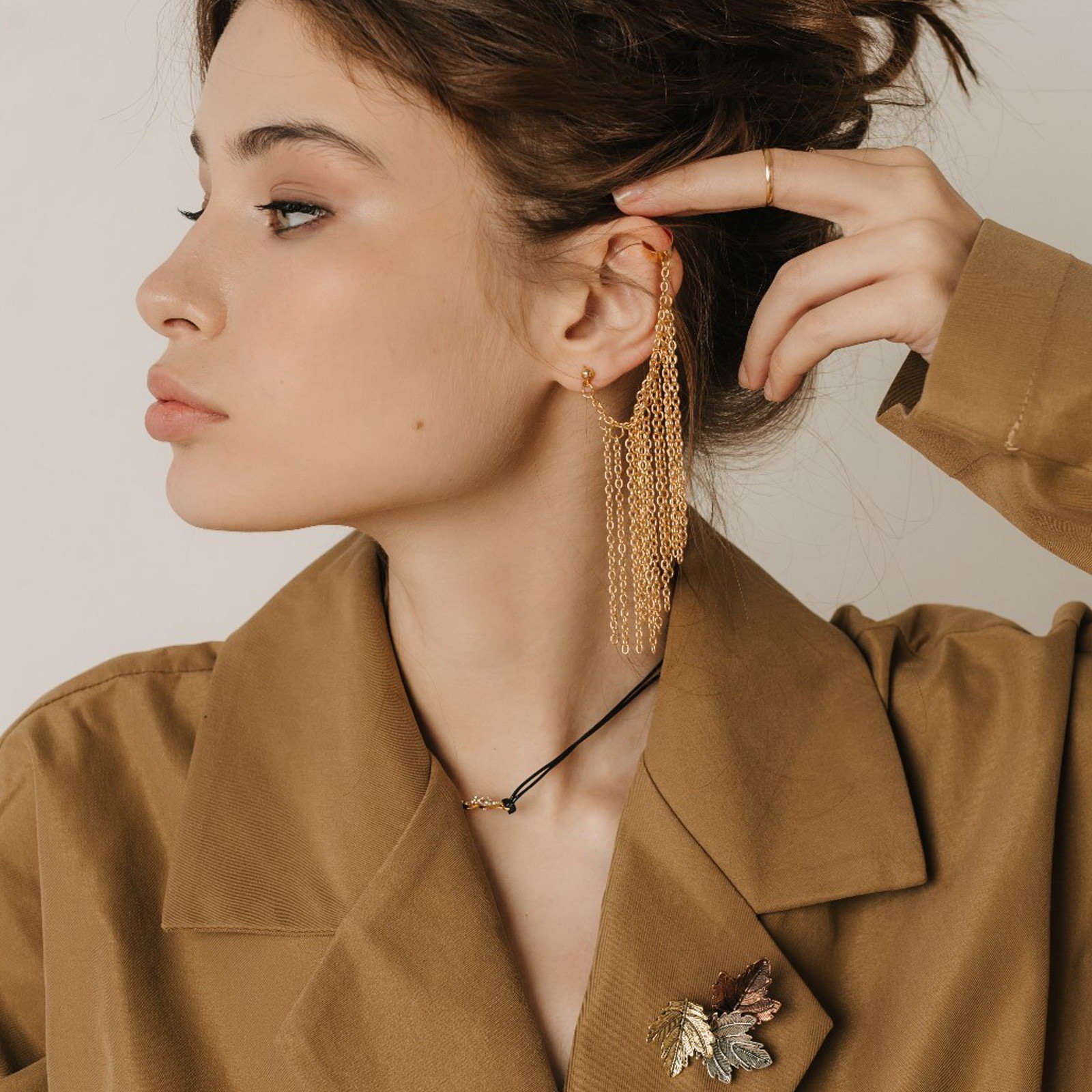 Выбирая это украшение, вы подчеркиваете свою индивидуальность и добавляете в образ нотки роскоши и лёгкости. Серьга-кафф с цепочками идеальный акцент для тех, кто ценит стиль и качество в каждой детали. | ||