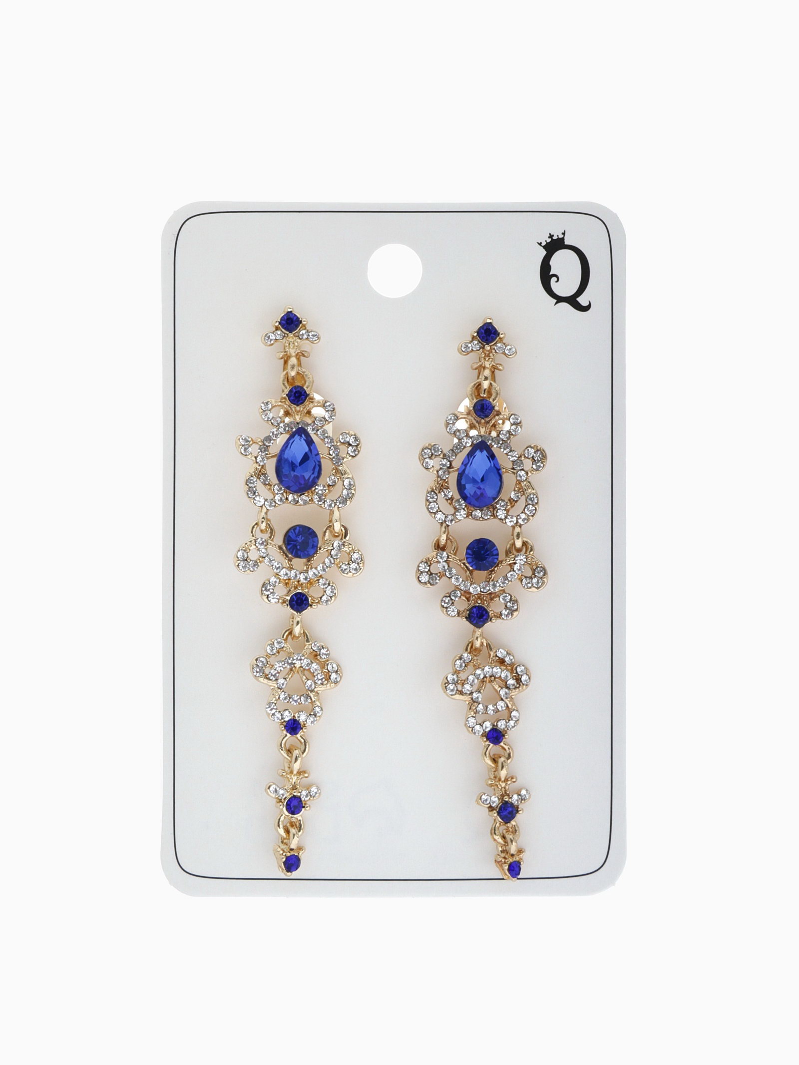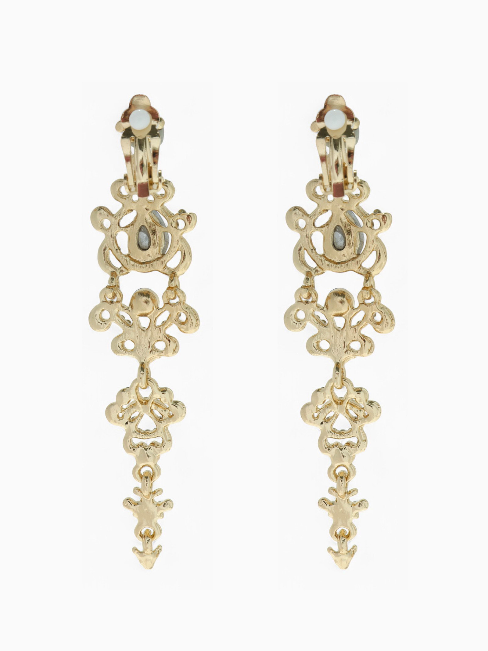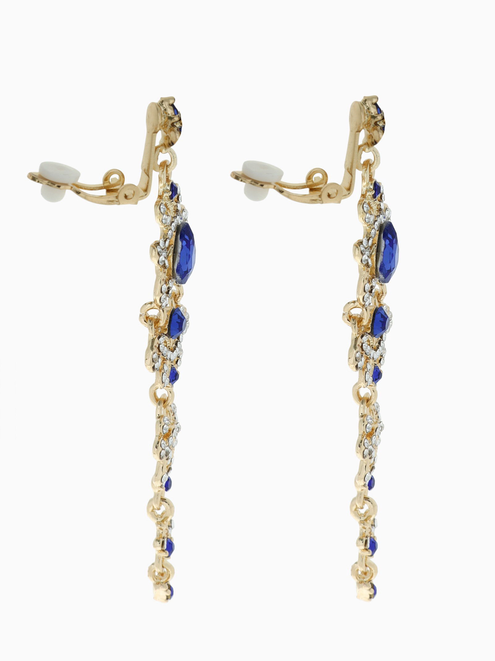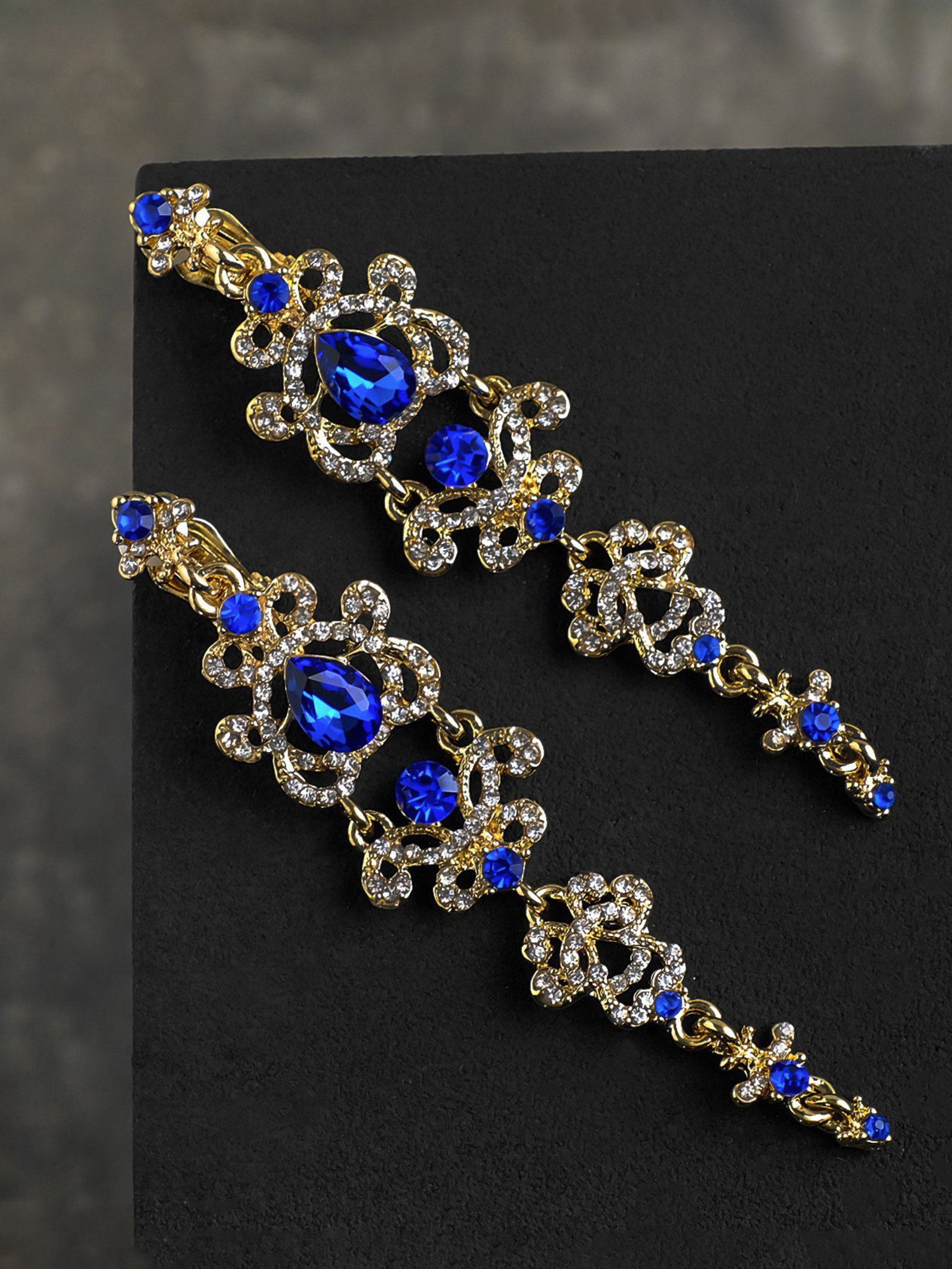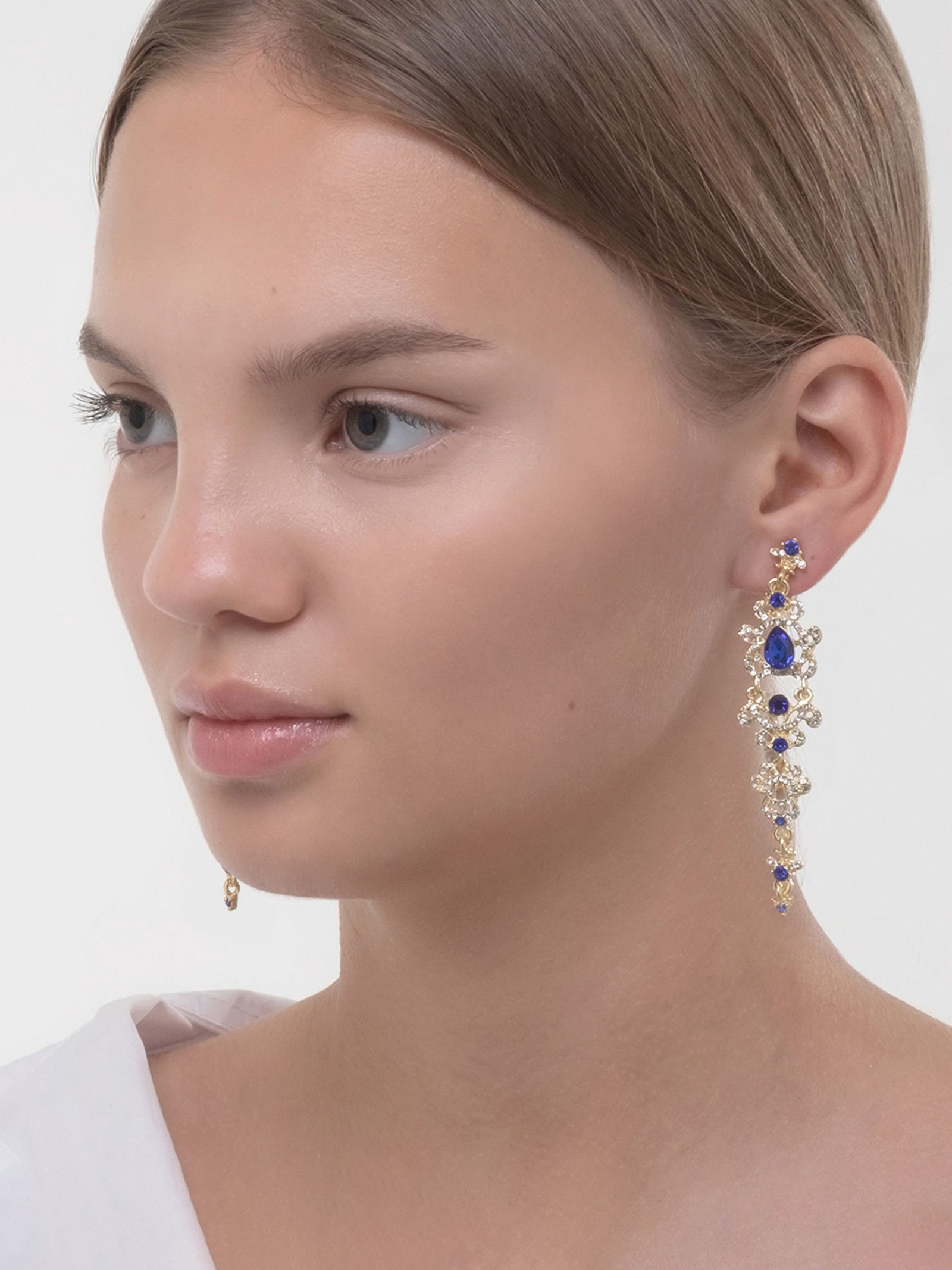 Клипсы для ушей висячие со стразами "Ажур", капли с завитками, цвет бело-синий в золоте, 1.8x8.5x1 см., QF, Китай