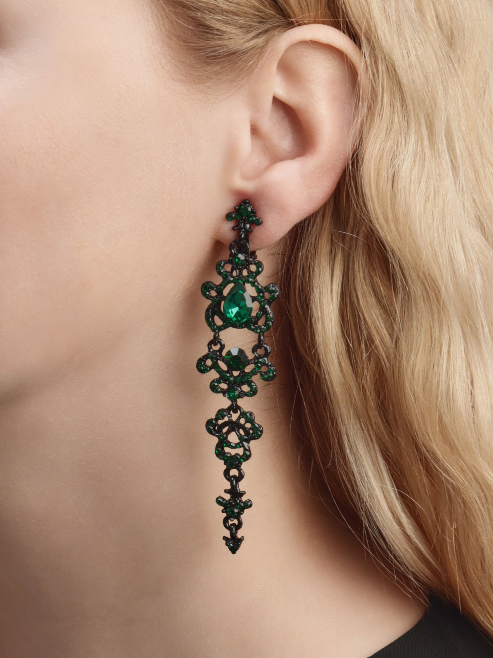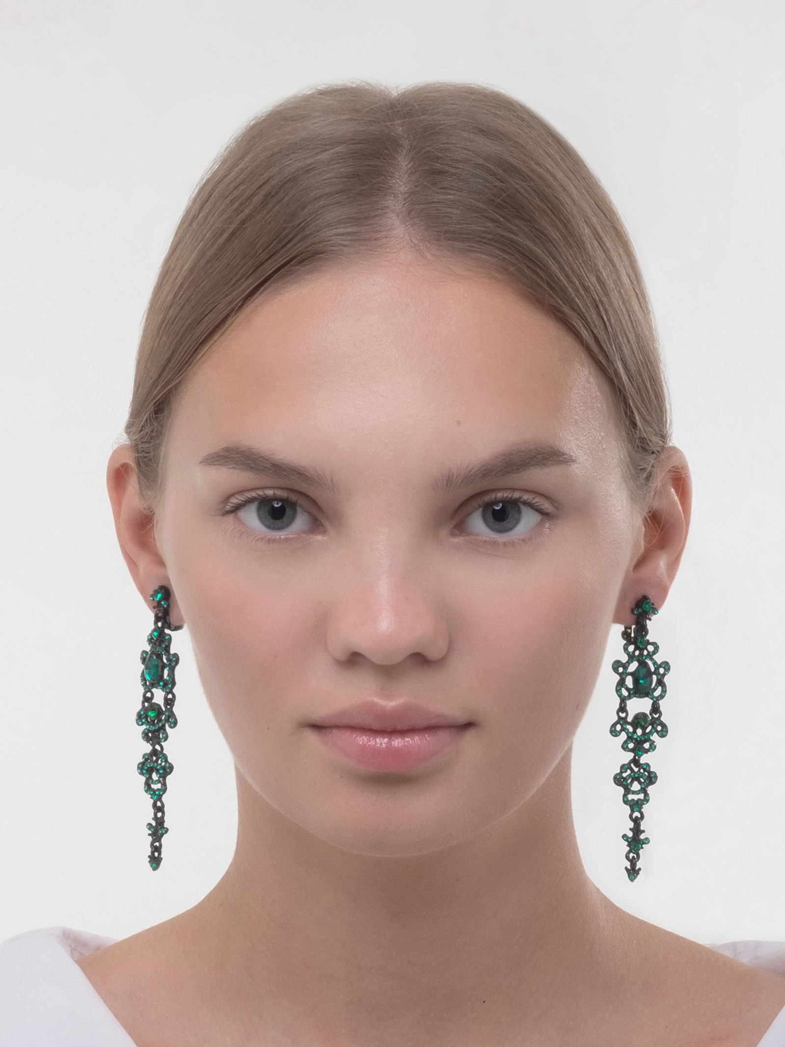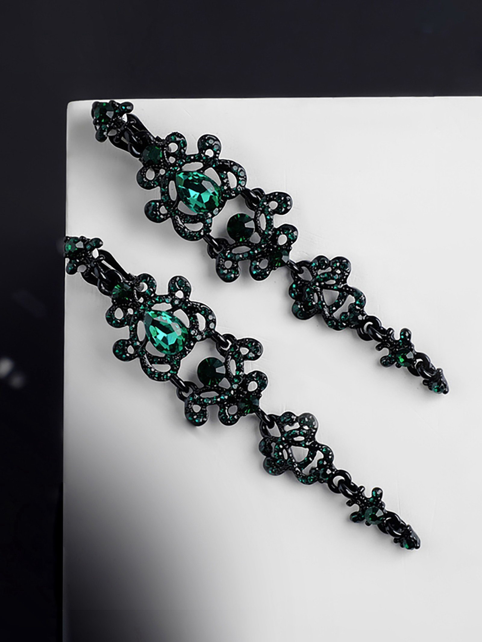 Клипсы для ушей висячие со стразами "Ажур", капли с завитками, цвет изумрудный в чёрном металле, 1.8x8.5x1 см., QF, Китай