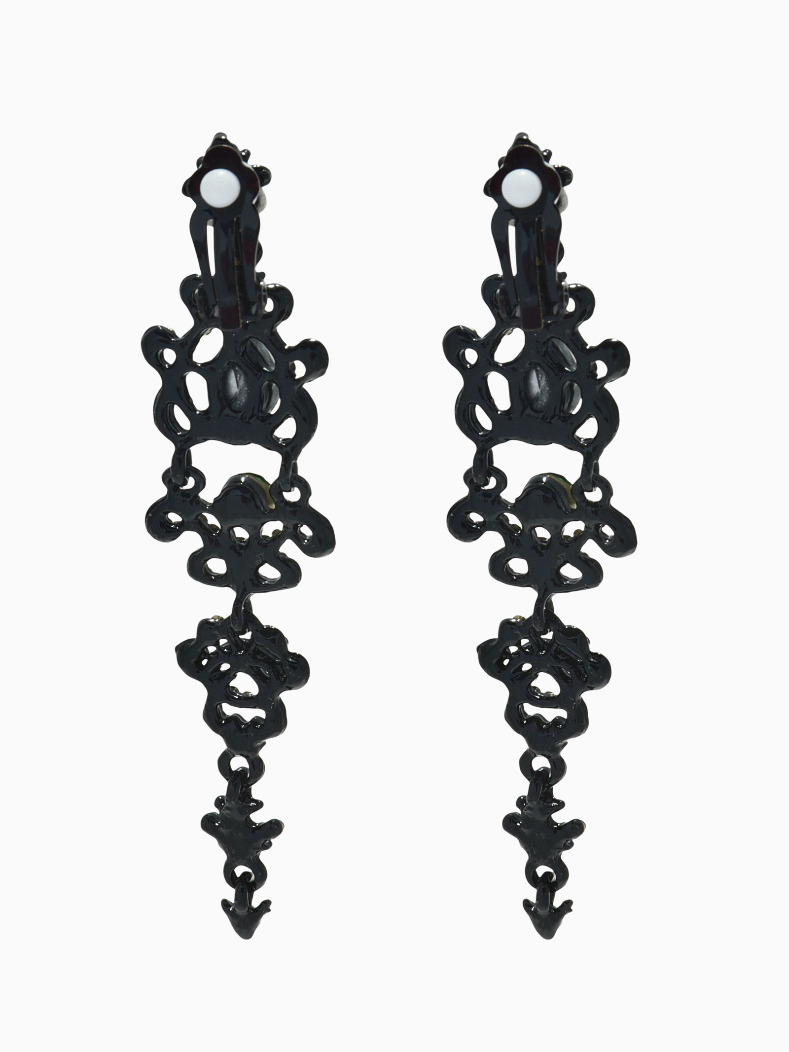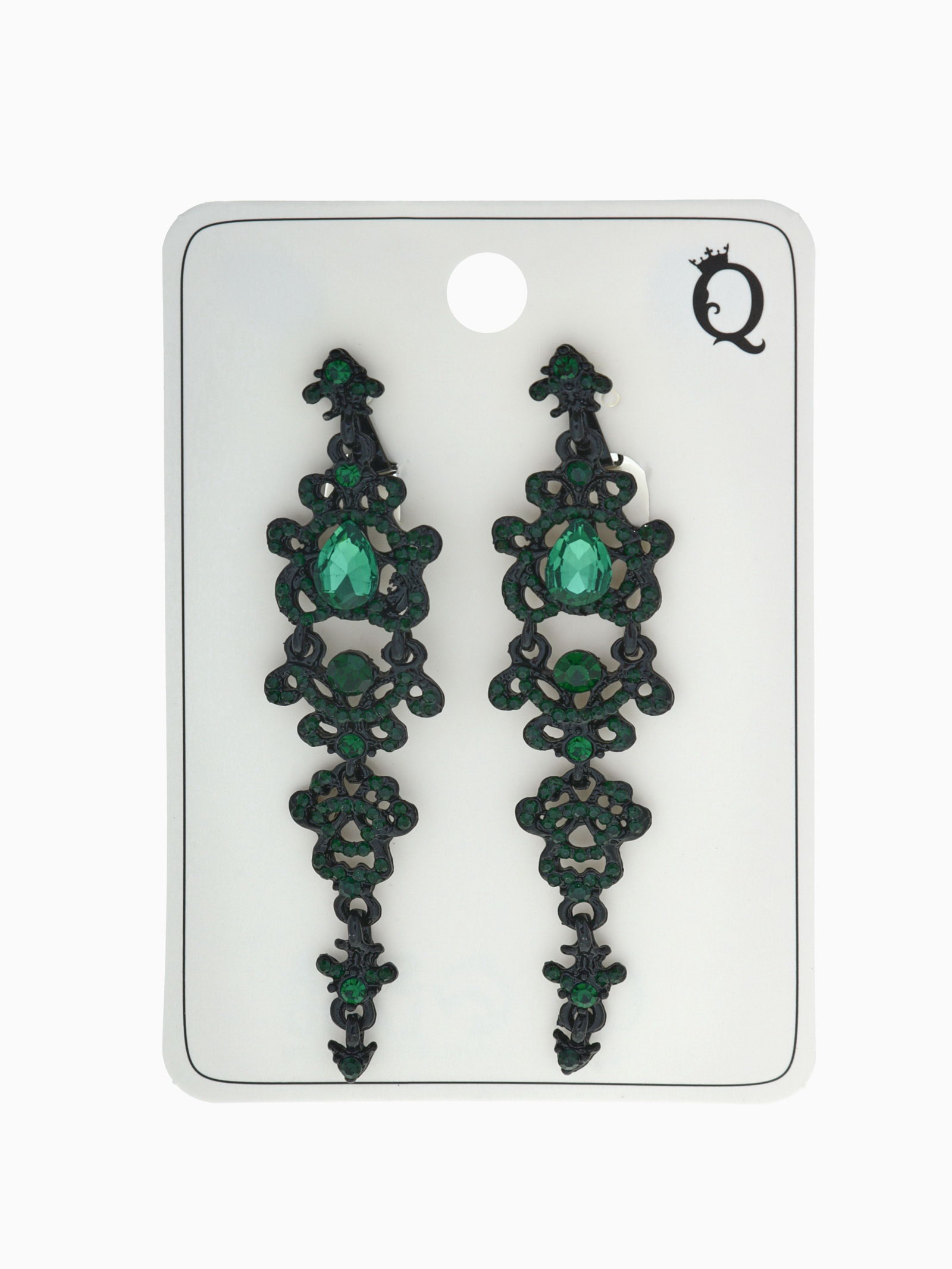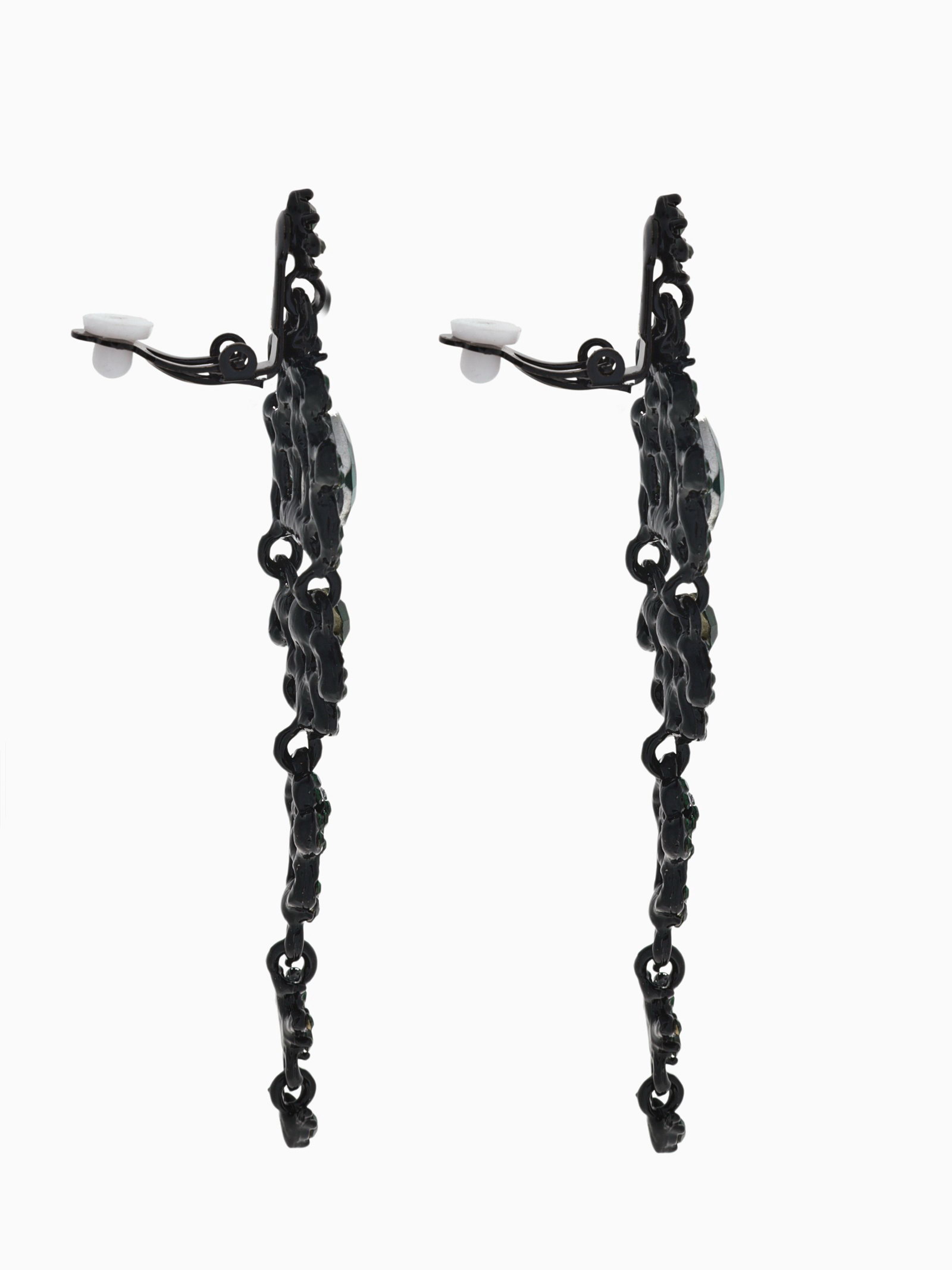 Клипсы для ушей висячие со стразами "Ажур", капли с завитками, цвет изумрудный в чёрном металле, 1.8x8.5x1 см., QF, Китай
