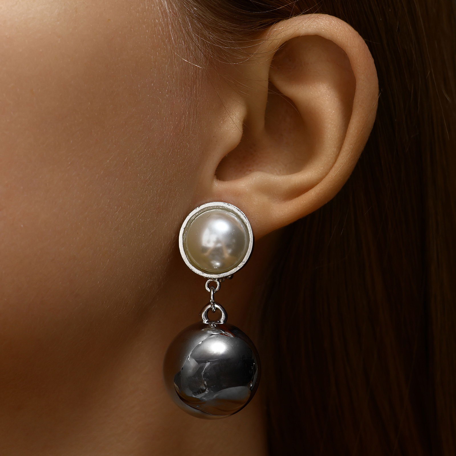 Клипсы для ушей с жемчугом "Бусина", с жемчужиной, цвет белый в серебре, 2x5x2 см., QF, Китай