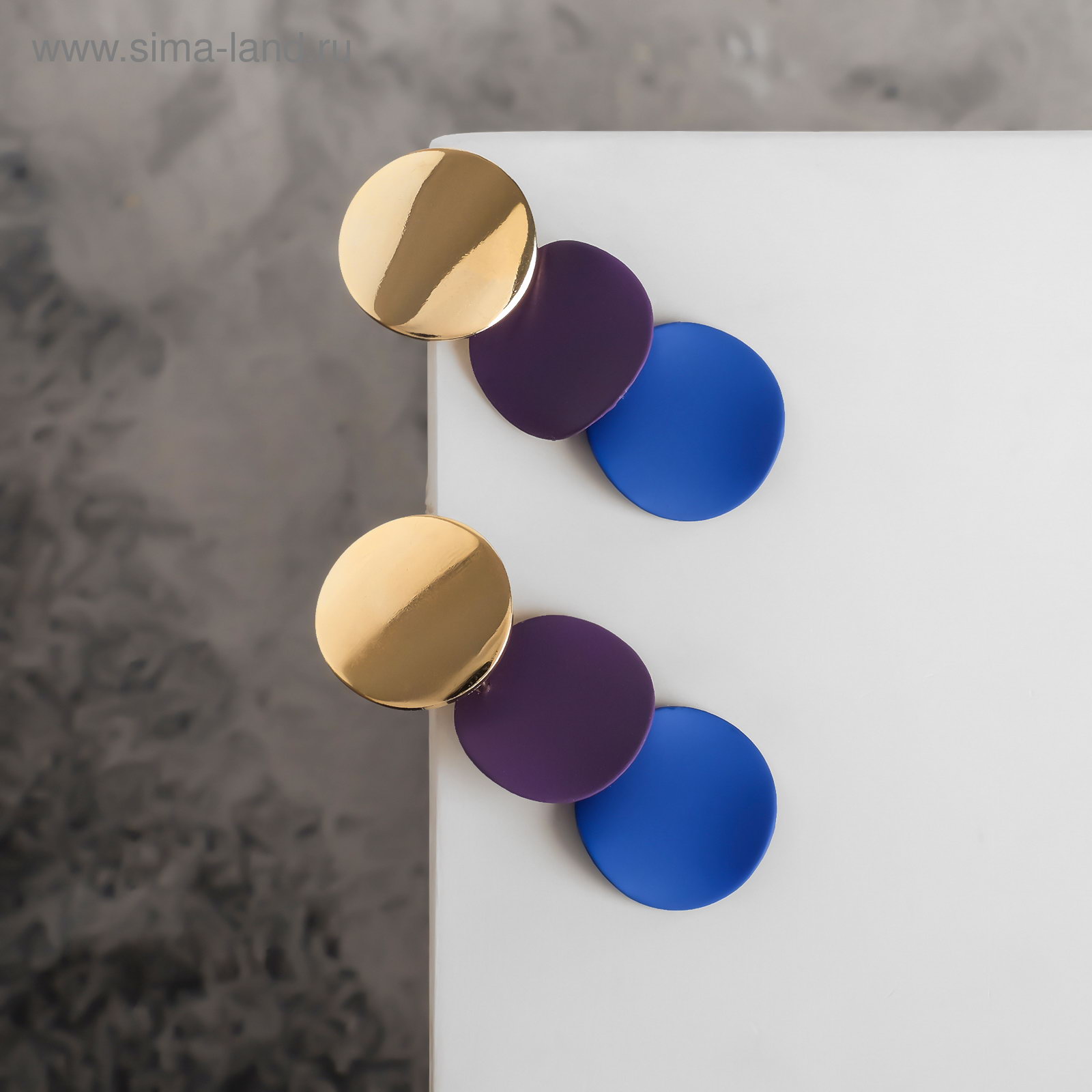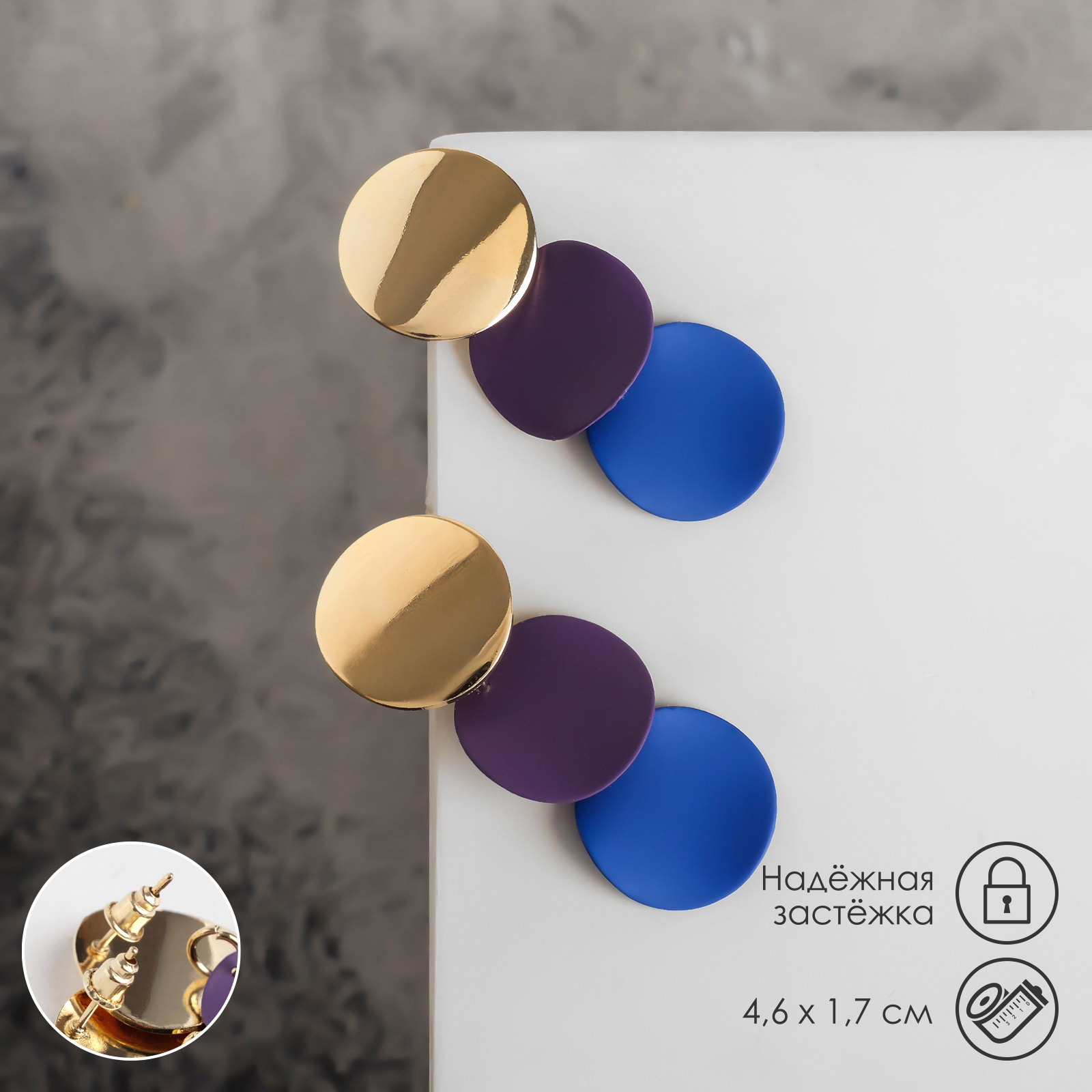 Цвет: Синий, Фиолетовый Вид: Серьги, Серьги Тематика праздника: 8 Марта, День рождения, Новый год, Универсальная тематика Адресат: Дочке, Маме, Подруге, Сестре Тематика: Абстракция, Яркая Размер упаковки: 6 x 1.5 x 7.5 см. Для кого: Для женщины Материал основания: Металл Возраст: Для взрослых Бижутерия с открыткой: Нет Вид застёжки: Застёжка пусет (гвоздик) Составляющие набора: Серьги Тематика подарка: Бижутерия Тематика подарка: Бижутерия tnved: 7117190000 Длина, см: 4.6 Набор: Нет Цвет фурнитуры: Золотой Вставка/Подвеска: Без вставок Материал основы: Металл Серьги с выгнутыми кругами в сочетании фиолетового и синего на золотистой металлической основе современный аксессуар для женщин, ценящих абстрактный дизайн и выразительные цвета. Длина 4,6 см делает украшение заметным, но удобным для ежедневного ношения и особых случаев. Особенности