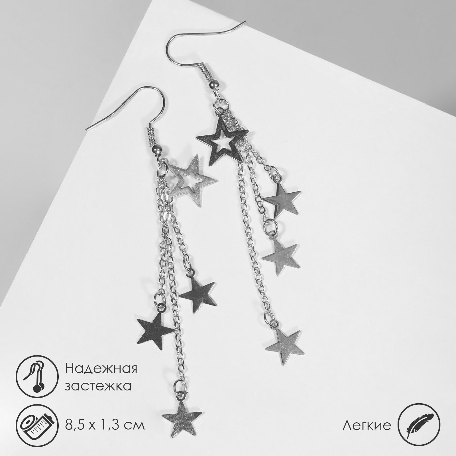 Тематика: Космос, Космос Тематика праздника: 14 Февраля, 8 Марта, День рождения, Универсальная тематика Вид: Серьги, Серьги Размер упаковки: 7 x 0.5 x 10 см. Материал основы: Металл Материал основания: Металл Бижутерия с открыткой: Нет Для кого: Для женщины Тематика подарка: Бижутерия Составляющие набора: Серьги Возраст: Для взрослых Набор: Нет tnved: 7117900000 Вид застёжки: Замок-петля Цвет фурнитуры: Серебряный Вставка/Подвеска: Без вставок Цвет: Серебристый Длина, см: 8.5 Серебристые серьги длиной 8,5 см, вдохновлённые космическими мотивами, создают эффект звездного дождя, который завораживает своей лёгкостью и утончённостью. Металлическая основа с изящной геометрией подчёркивает современный стиль и дарит образу динамичность, словно мерцание далёких светил на ночном небе. Замок-петля обеспечивает надёжную фиксацию, позволяя носить серьги с комфортом в течение всего дня. Отсутствие вставок делает дизайн лаконичным и универсальным, что позволяет сочетать украшение с разными стилями одежды от повседневного до вечернего.