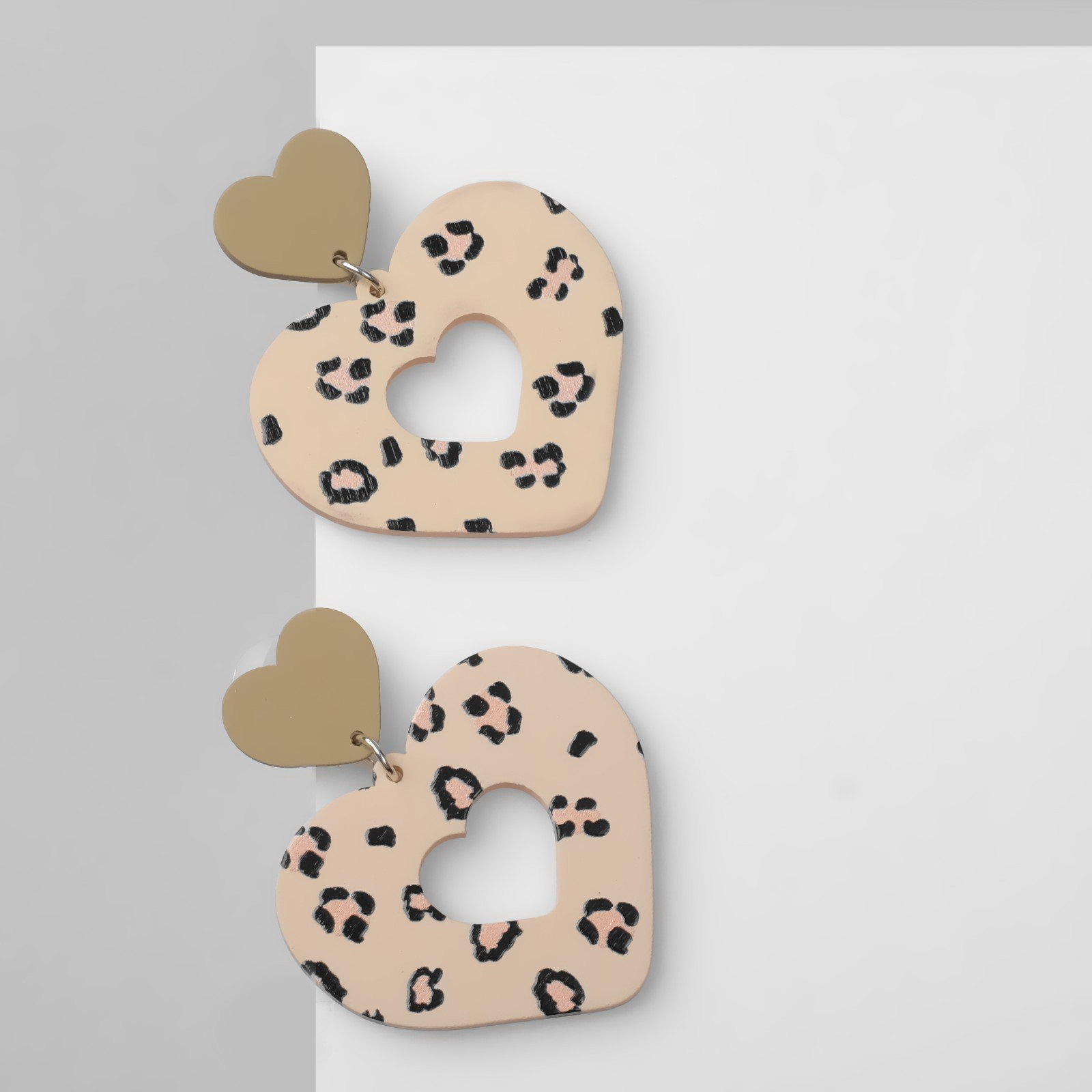 Серьги металл "Сердце" леопард, цвет розово-зелёный в серебре, 4x6x0.3 см., QF, Китай