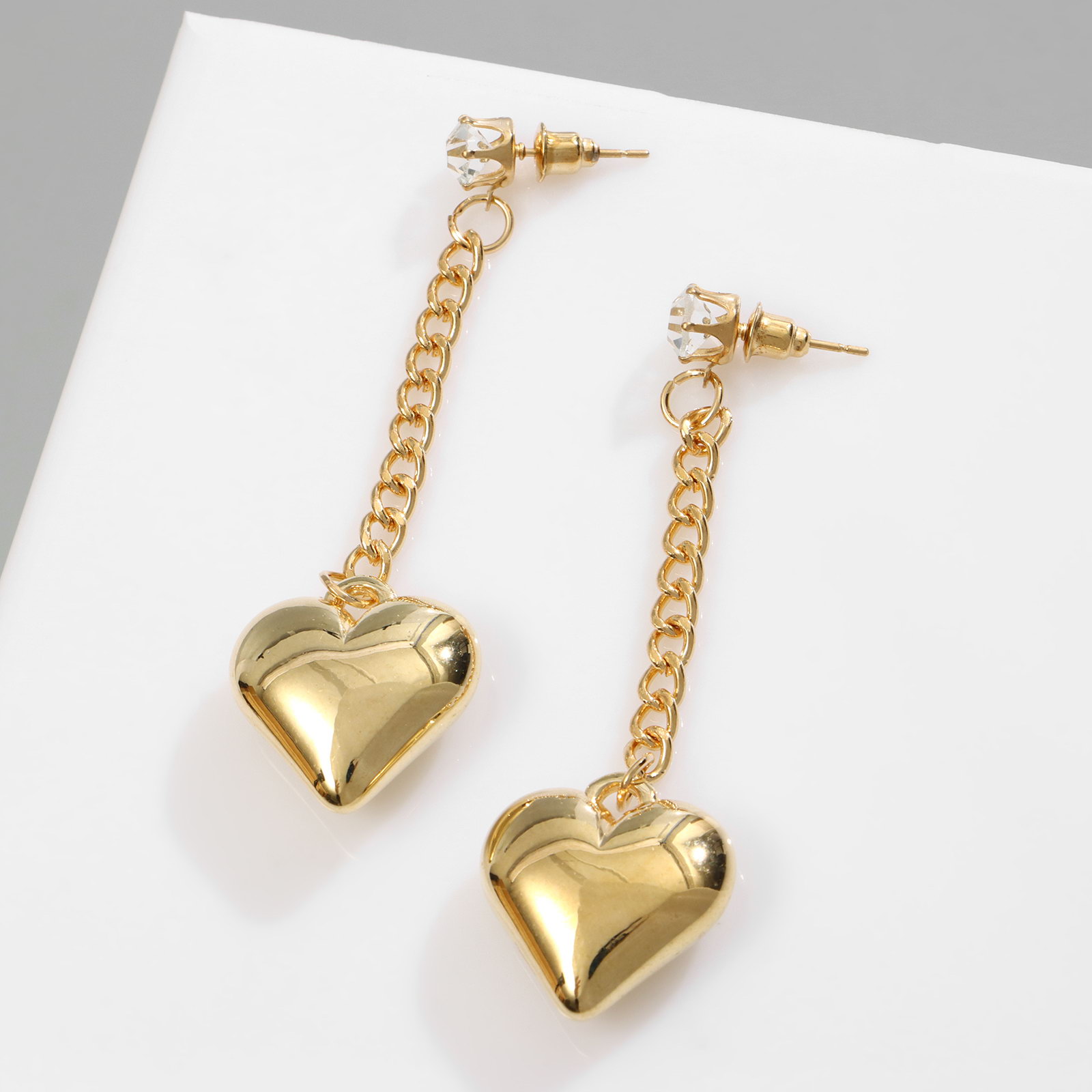 Серьги металл "Сердца" на цепочке, цвет белый в золоте, 1.7x5.3x0.5 см., QF, Китай