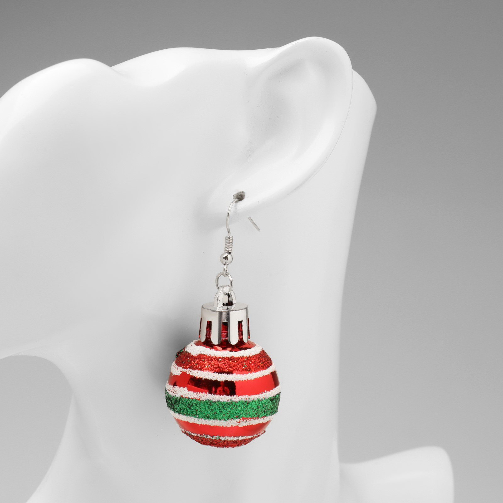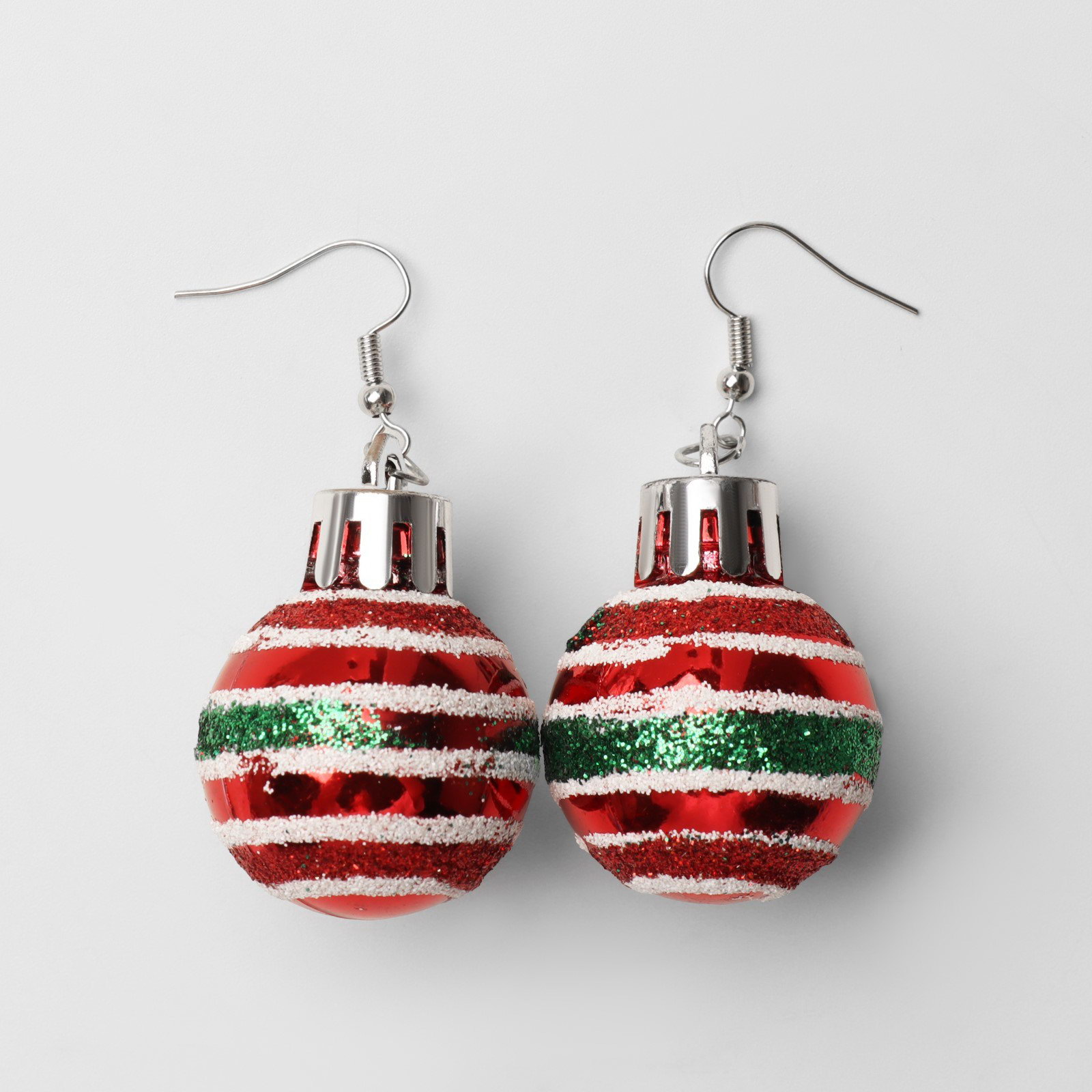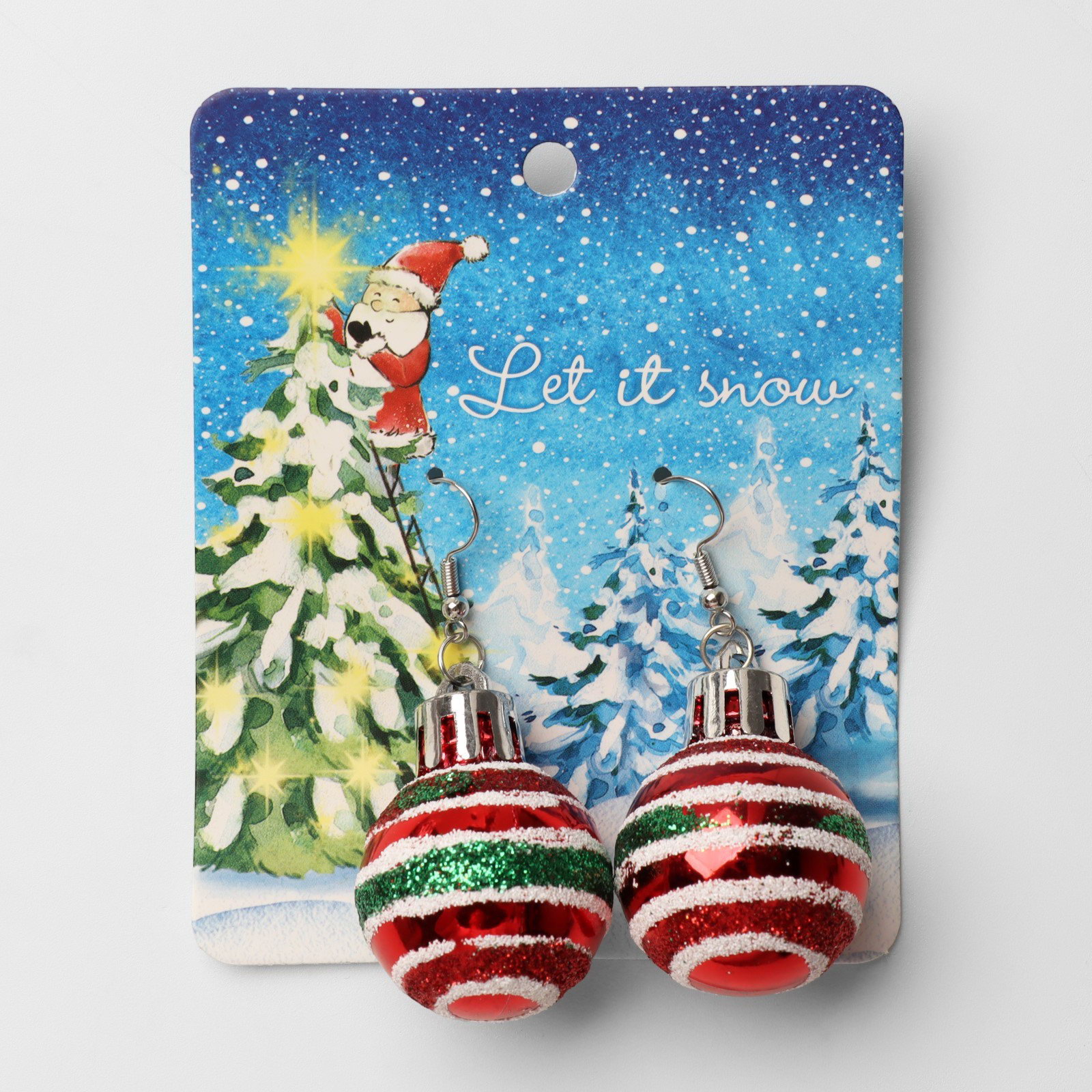 Серьги висячие "Новогодние" ёлочные шарики, блеск, цвет красно-зелёный в серебре, 3x6x3 см., QF, Китай