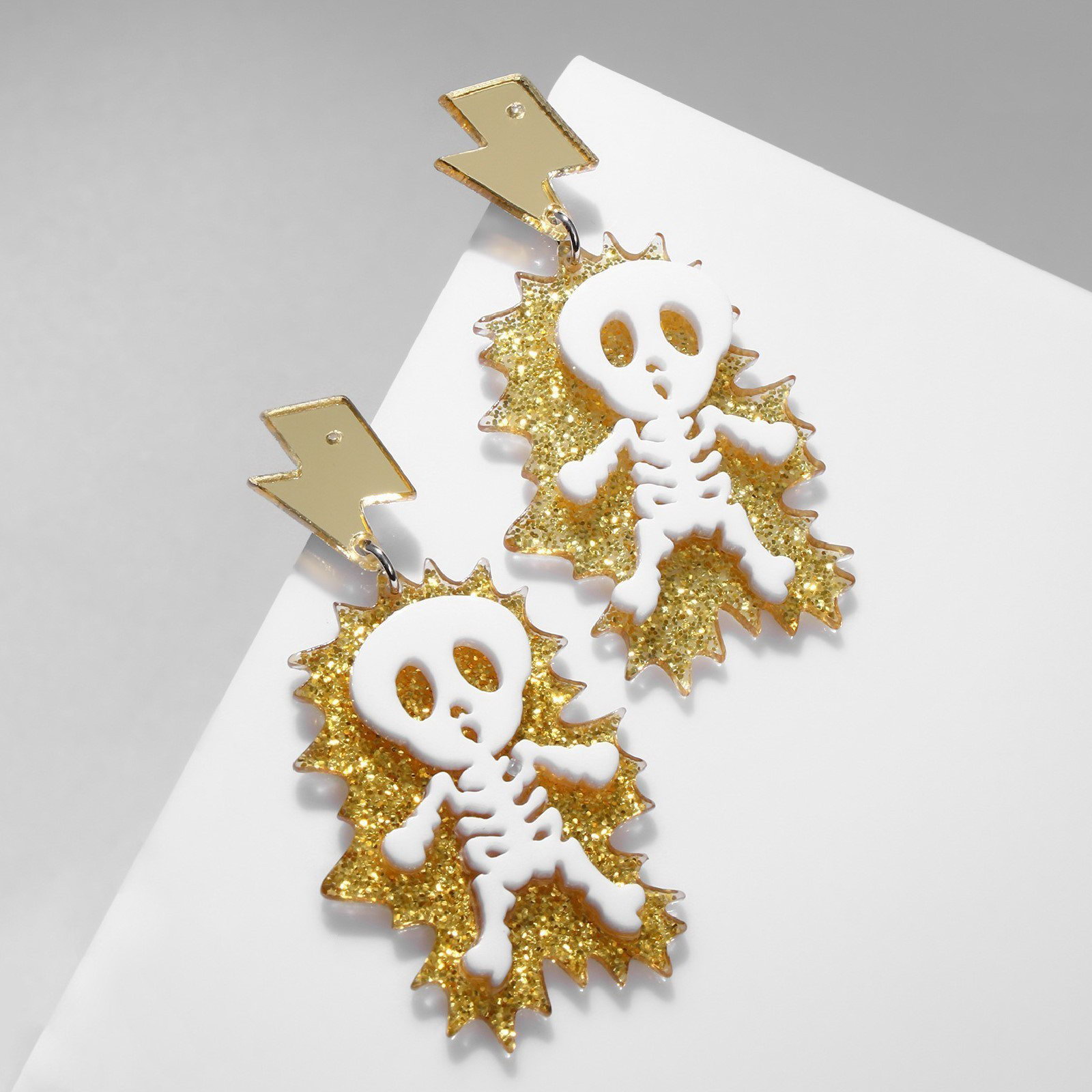 Серьги акриловые "Скелет" удар молнии, цвет белый в золоте, 3.5x6.5x0.4 см., QF, Китай