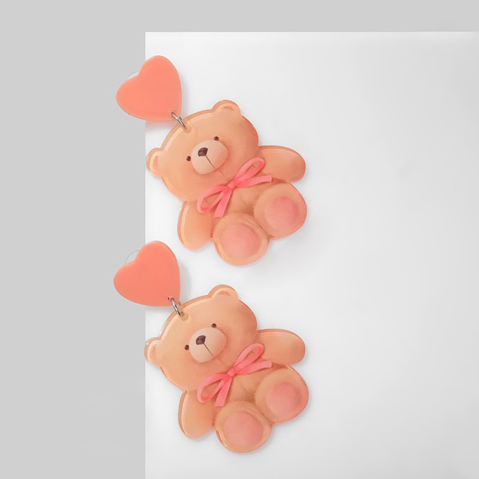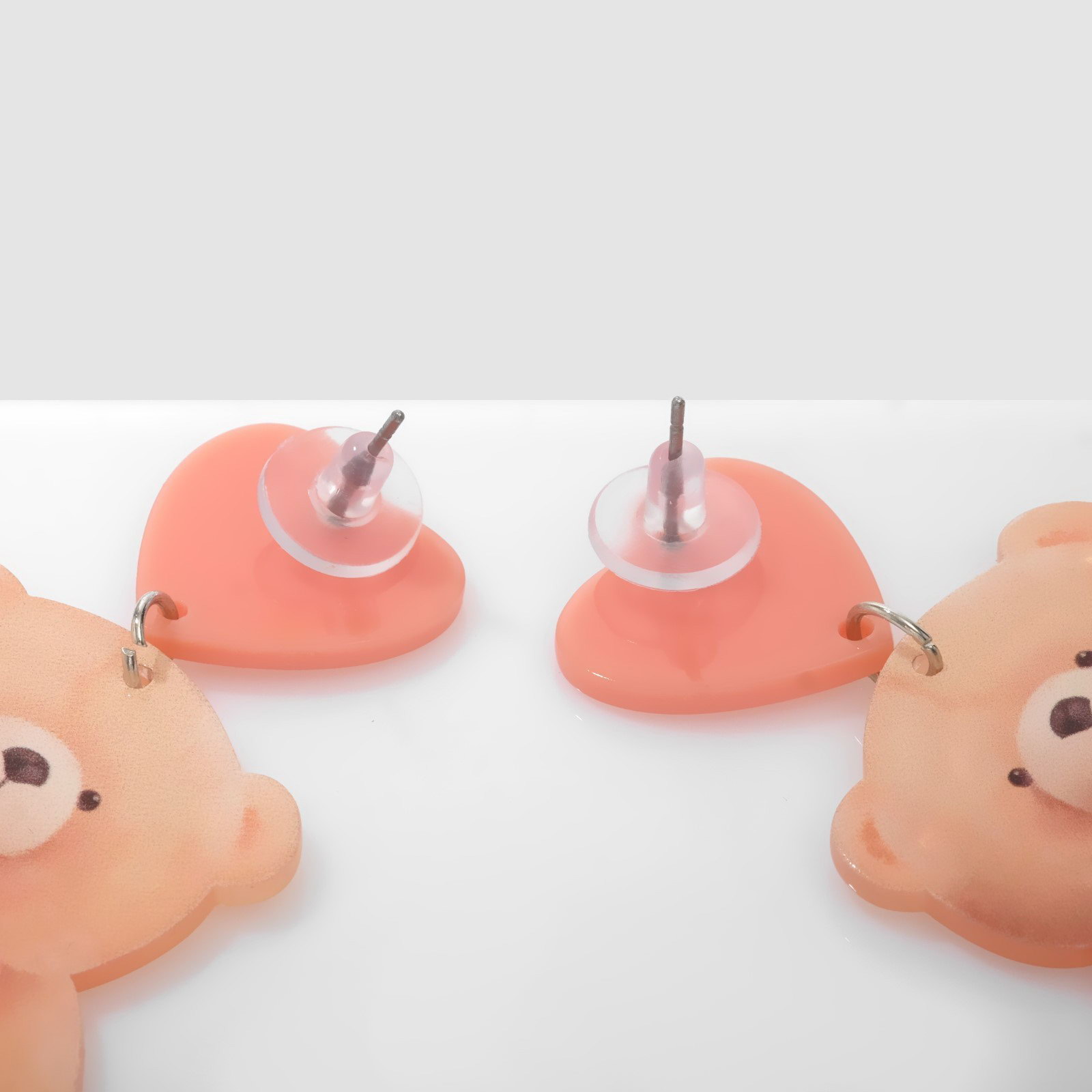 Серьги пластик "Сердца" мишки, цвет розово-бежевый в золоте, 4.2x6.4x1 см., QF, Китай