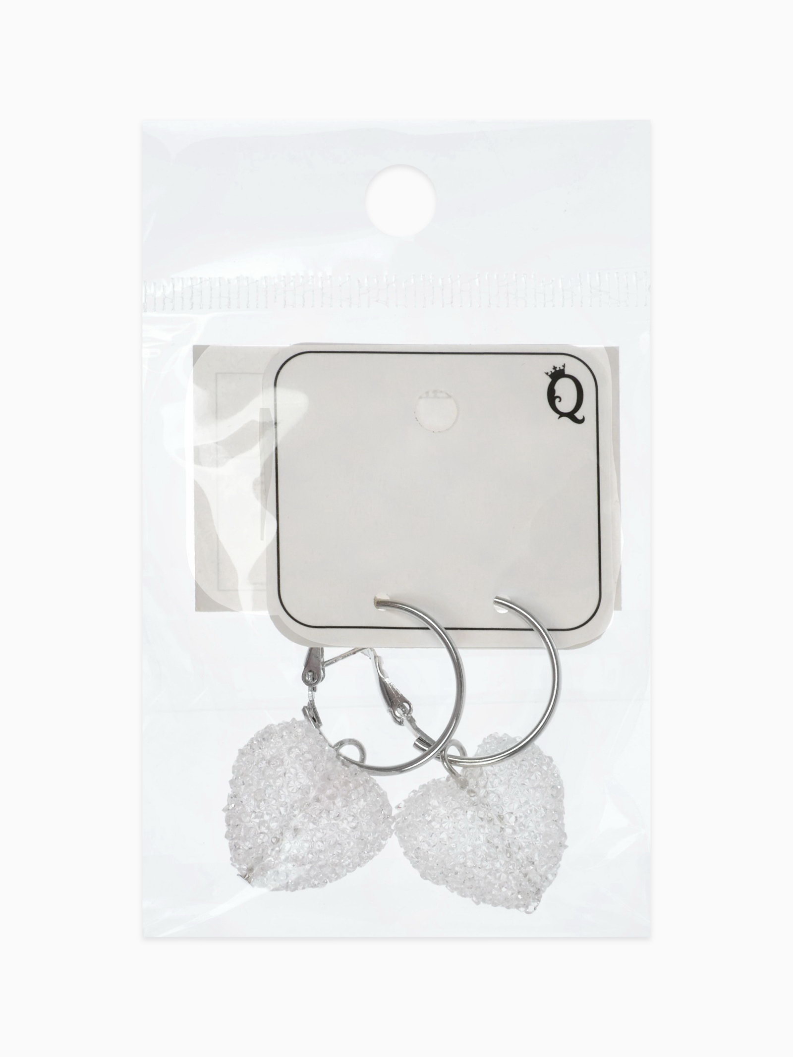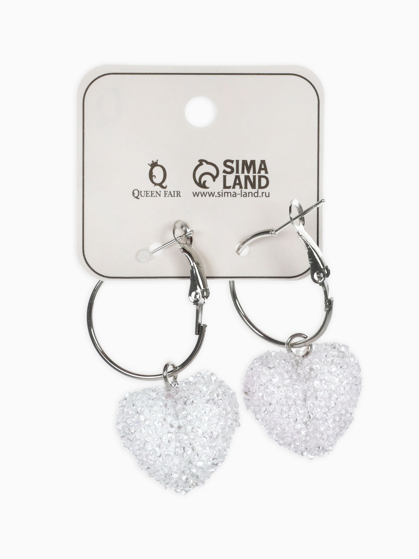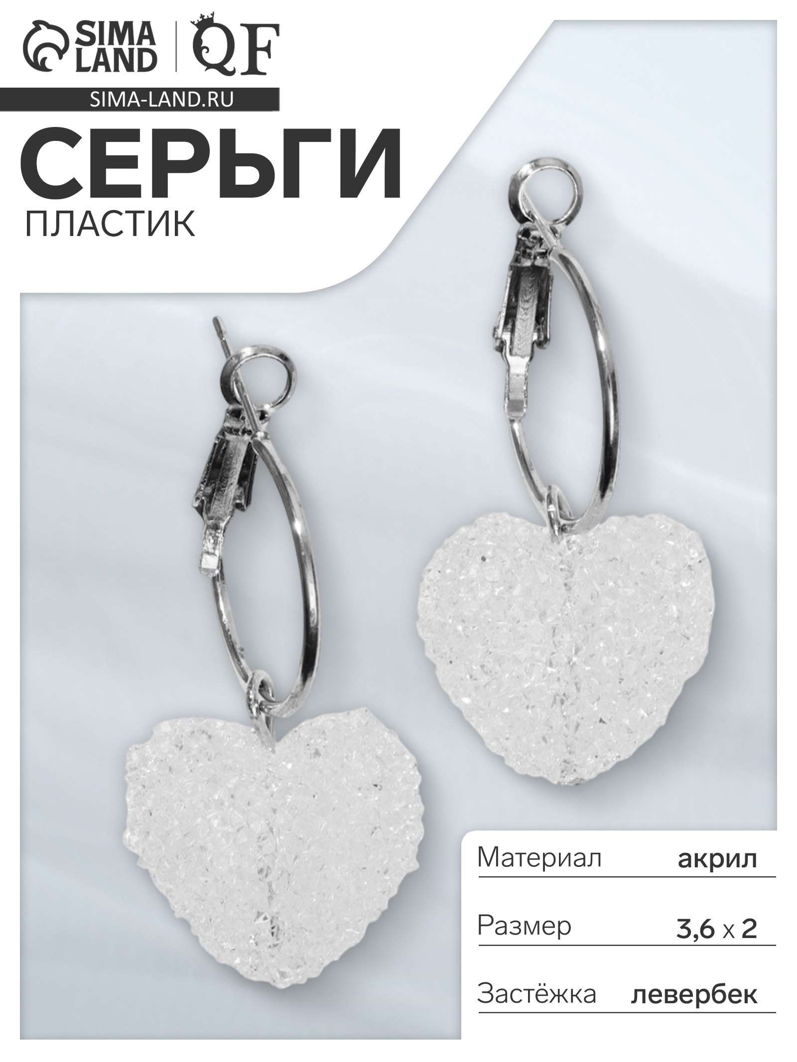 Серьги-кольца "Сахар" сердце, цвет белый в серебре, 2x3.6x1 см., QF, Китай