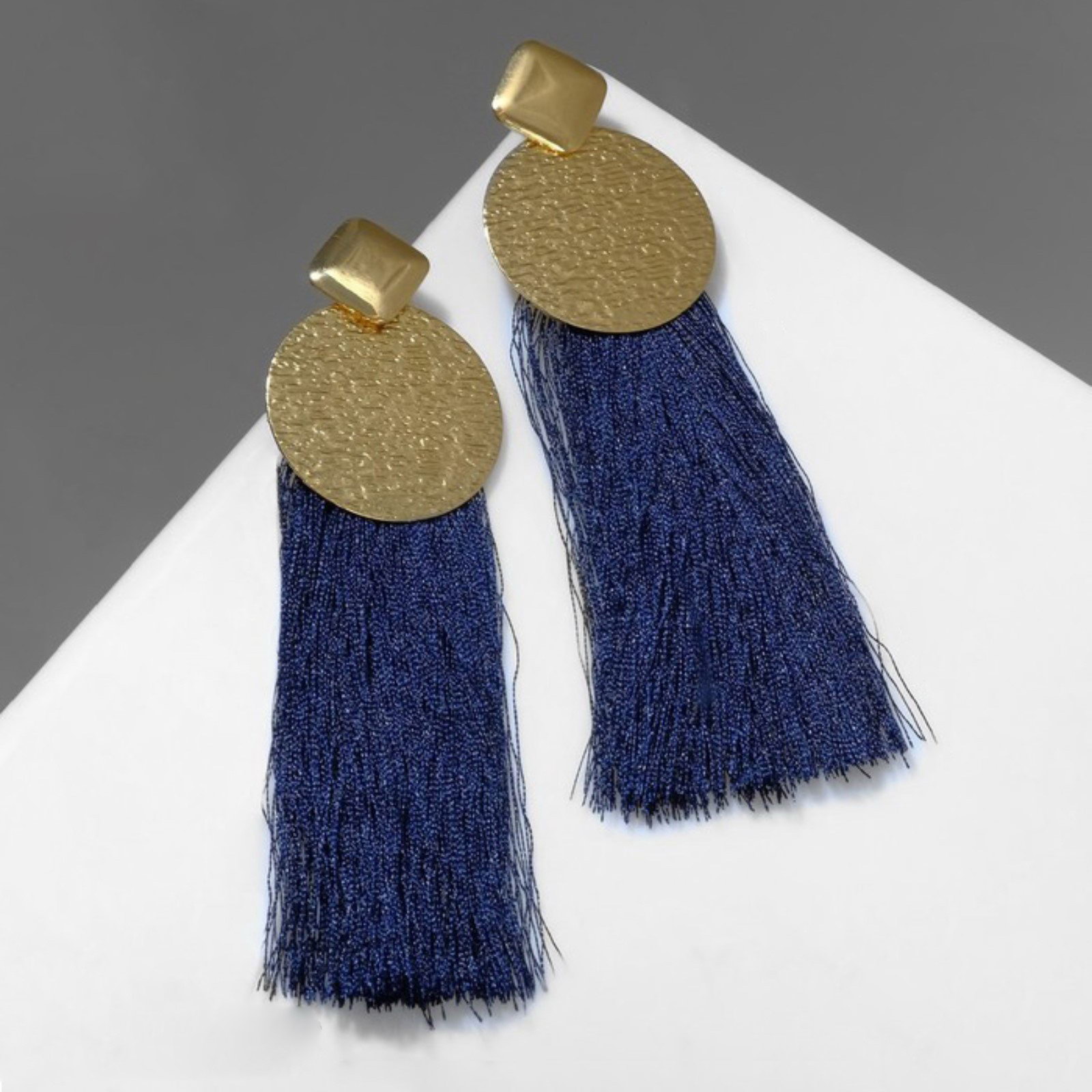Вид: Серьги, Серьги Тематика праздника: День рождения, Новый год, Универсальная тематика Адресат: Дочке, Маме, Подруге, Сестре Тематика: Восточная, Яркая Размер упаковки: 7 x 1 x 12 см. Материал основы: Текстиль Вставка/Подвеска: Без вставок Длина, см: 10 Вид застёжки: Застёжка пусет (гвоздик) Возраст: Для взрослых Материал основания: Металл Составляющие набора: Серьги Тематика подарка: Бижутерия Для кого: Для женщины tnved: 7117900000 Цвет: Синий Цвет фурнитуры: Золотой Набор: Нет Откройте для себя мир утончённой красоты с серьгами, которые привносят в ваш стиль нотки восточной элегантности. Длина кисти 9 см и тёмно-синий цвет в сочетании с золотой фурнитурой создают эффектный и запоминающийся образ, идеально подходящий для женщин, стремящихся выделиться из толпы. Изготовленные из текстильного материала, эти серьги не только легкие, но и невероятно комфортные в носке. Застёжка-пусет (гвоздик) обеспечивает надежную фиксацию, что позволяет вам уверенно носить их в течение всего дня. Тёмно-синий цвет добавляет глубины и загадочности, а золотая фурнитура подчеркивает изысканность и стиль.