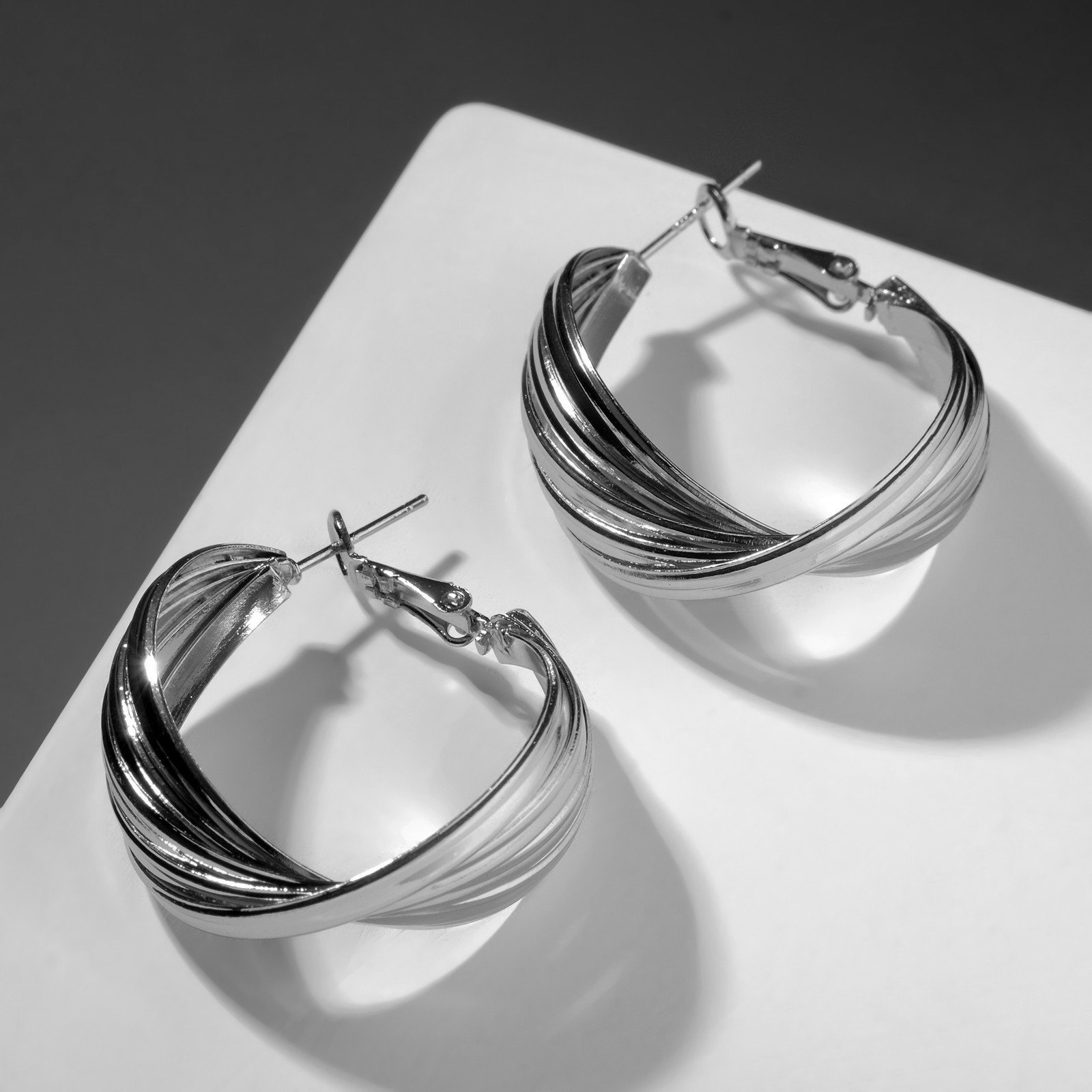 Серьги-кольца "Течение" поворот, цвет серебро, d=3, 3x3x1 см., Queen fair, Китай