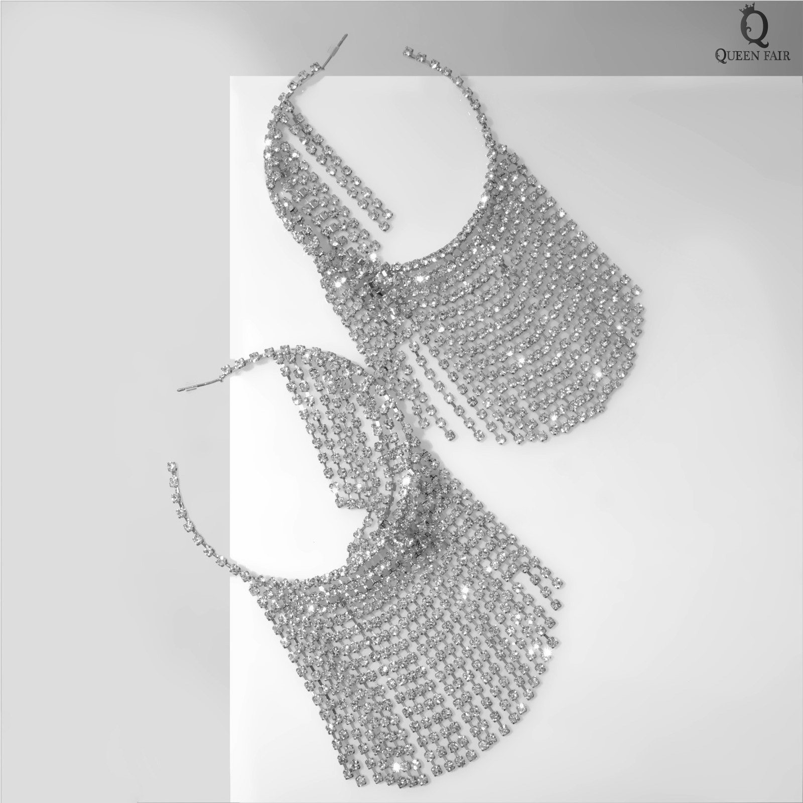 Серьги кольца со стразами "Водопад", нити на крупных кольцах, белые в серебре, 6x12x0.4 см., QF, Китай