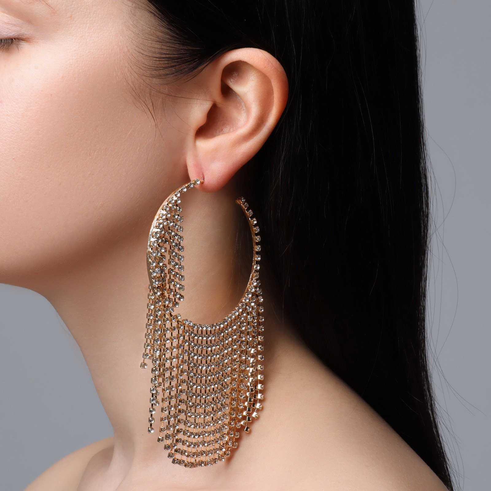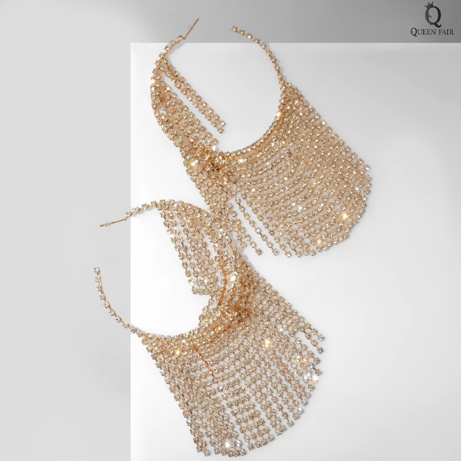 Серьги кольца со стразами "Водопад", нити на крупных кольцах, белые в золоте, 6x12x0.4 см., QF, Китай