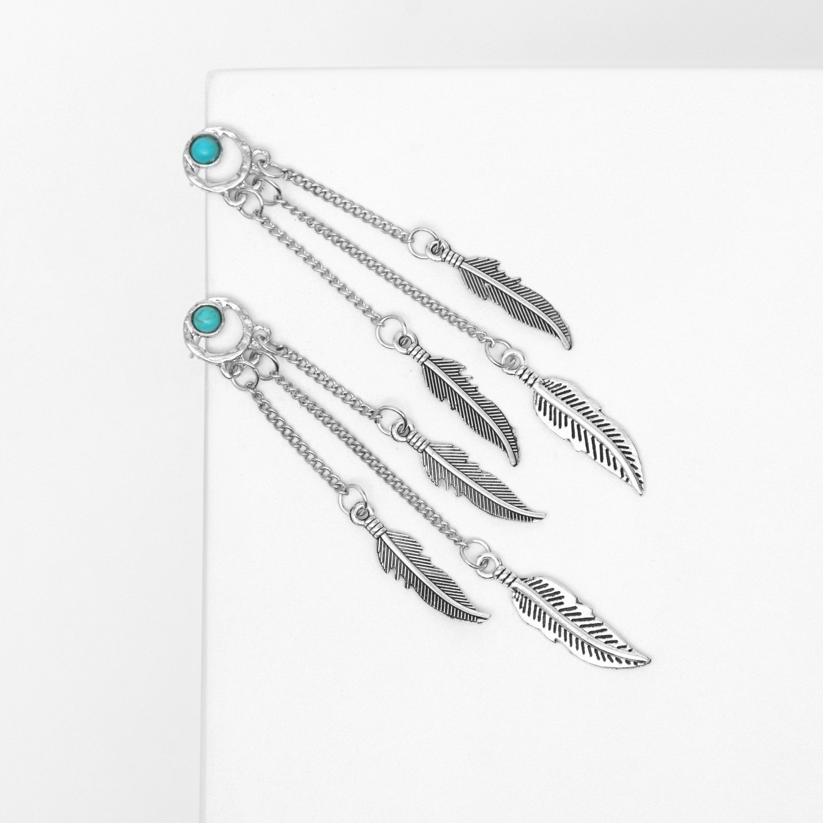Серьги под натуральный камень "Перья" бирюза, цвет голубой в серебре, 2.2x8.8x1 см., QF, Китай